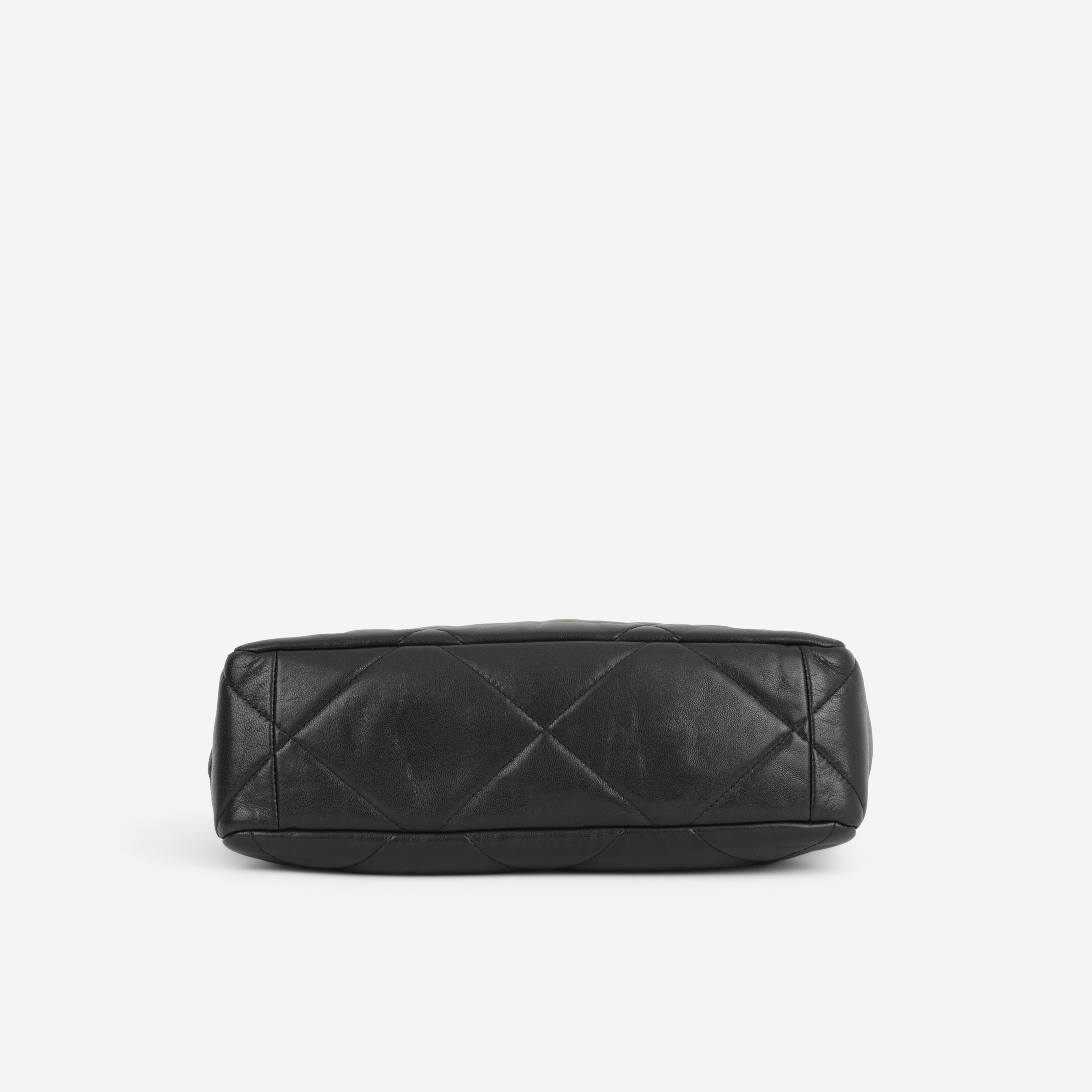 The Chanel Large 19 Flap Bag in black lambskin leather with multi-tone hardware, featuring a 30 series serial (2020 production). A soft structured flap silhouette with oversized quilting, CC turn-lock closure, and leather-interwoven chain strap.