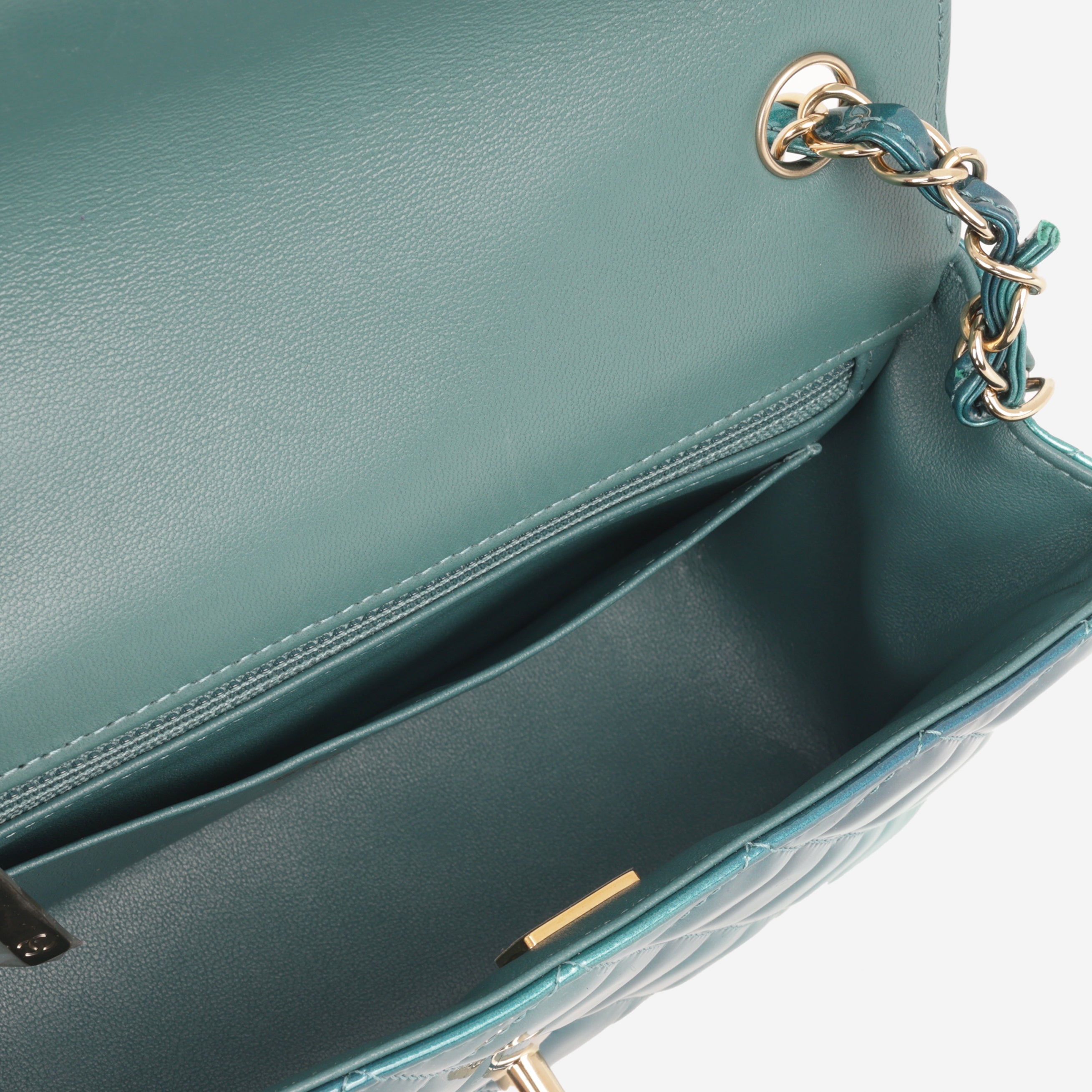 The Chanel Mini Flap Rectangular in Blue Ombre Patent leather is a stunning statement of modern luxury and timeless Parisian elegance. Its high-shine ombre finish gracefully transitions through shades of blue, creating a captivating, eye-catching effect, while the champagne gold hardware adds a refined, sophisticated touch.