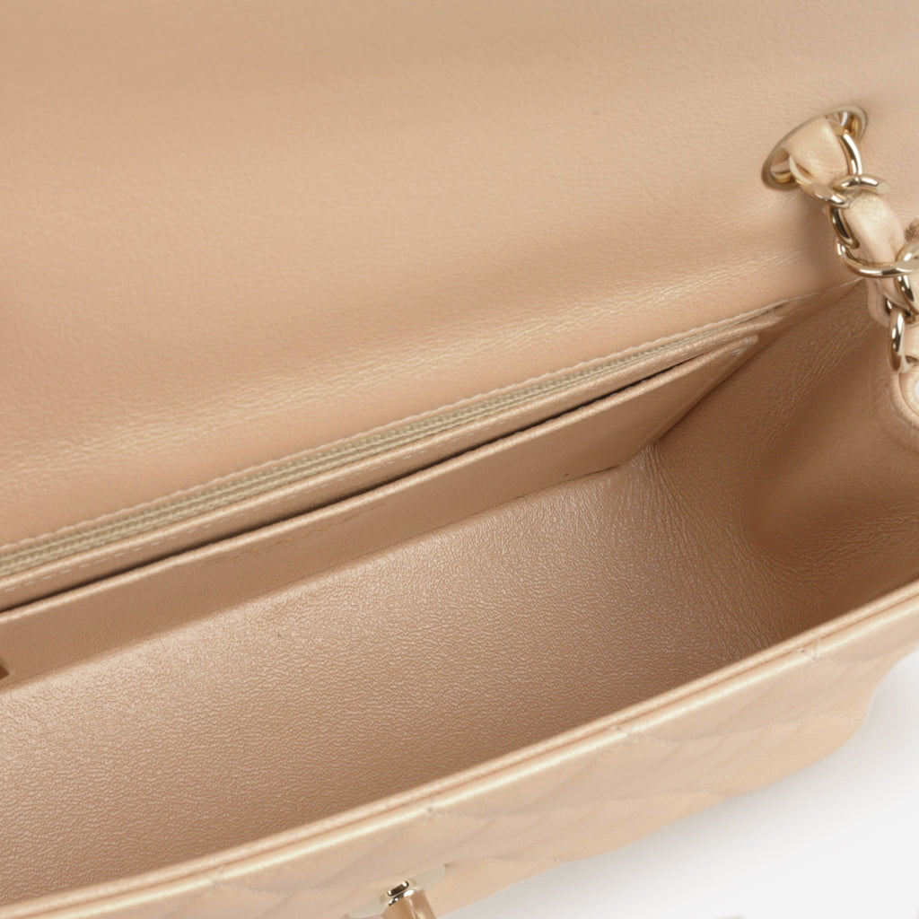 The Chanel Mini Rectangular in Pearlescent Beige Lambskin with Champagne Gold hardware is a chic and versatile accessory that exudes timeless elegance. Crafted from soft, luxurious lambskin, this compact bag features the signature flap closure and refined gold accents - perfect for elevating any outfit with understated Chanel sophistication.