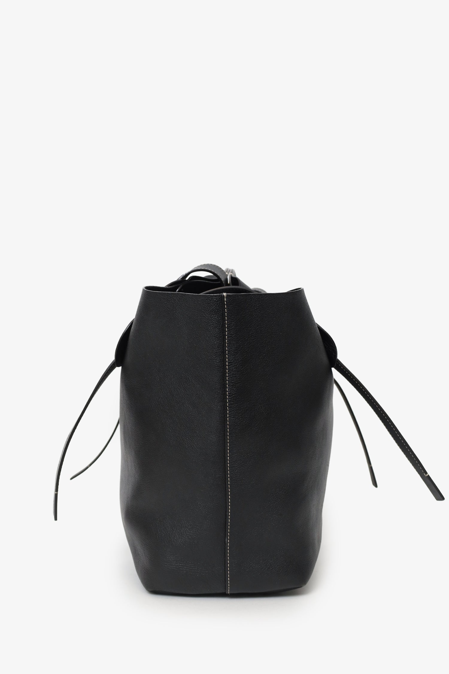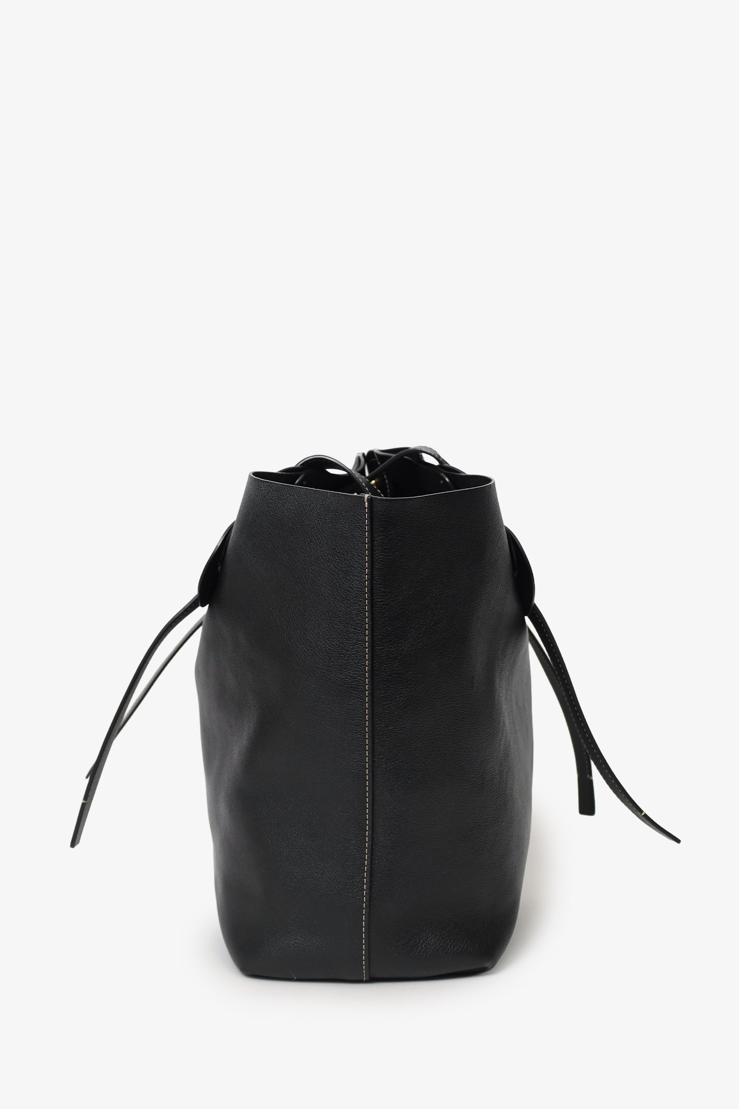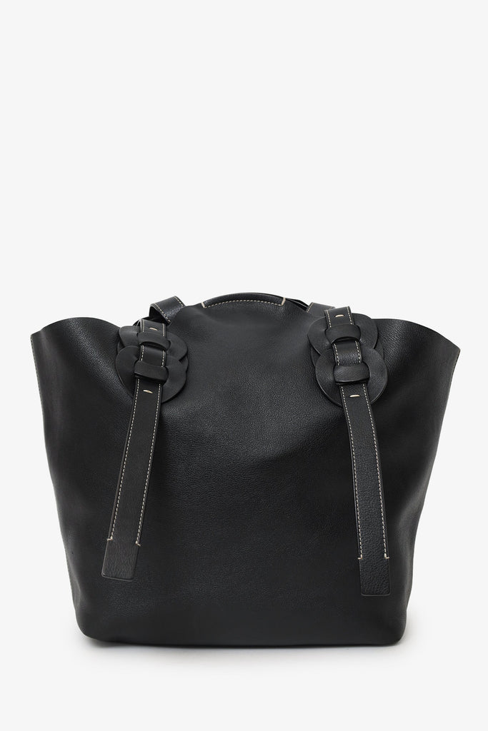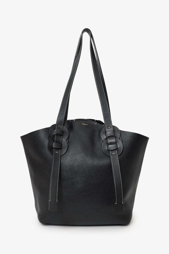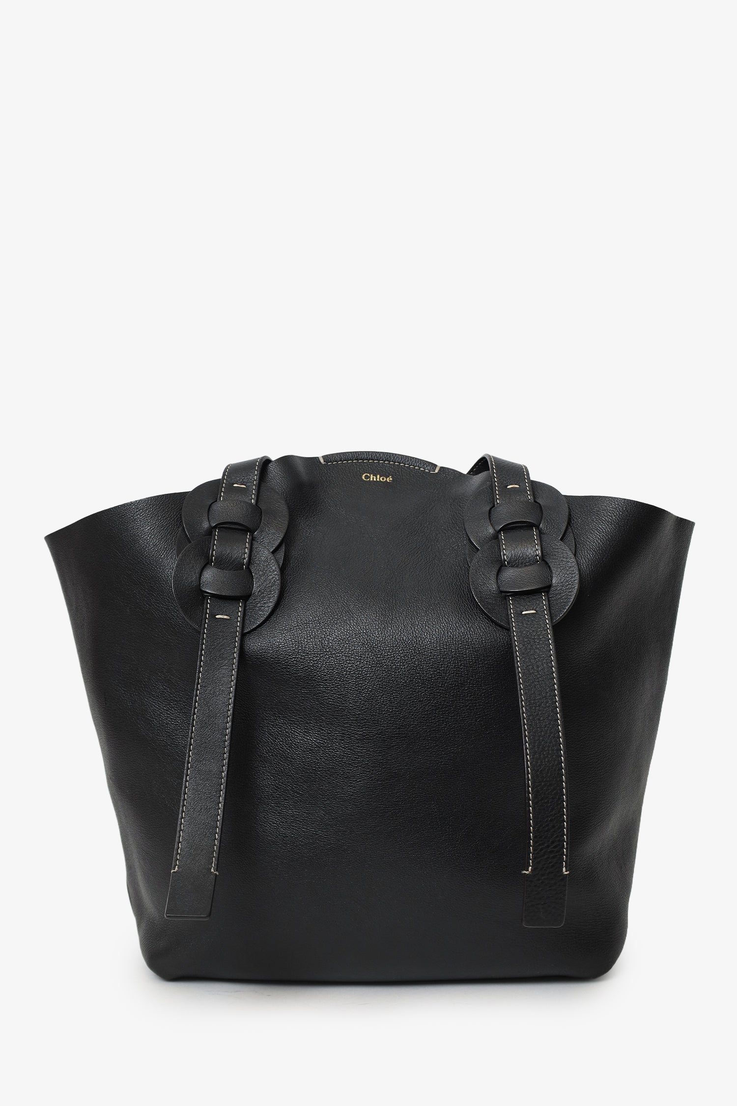Chloe Black Darryle Tote Bag. Top magnetic button closure. Twin top straps. Leather lined interior. Open interior. Gold-tone hardware. Contrast stitching.