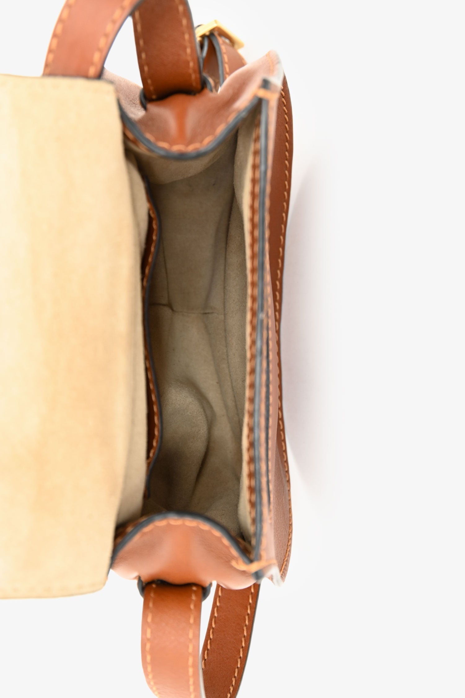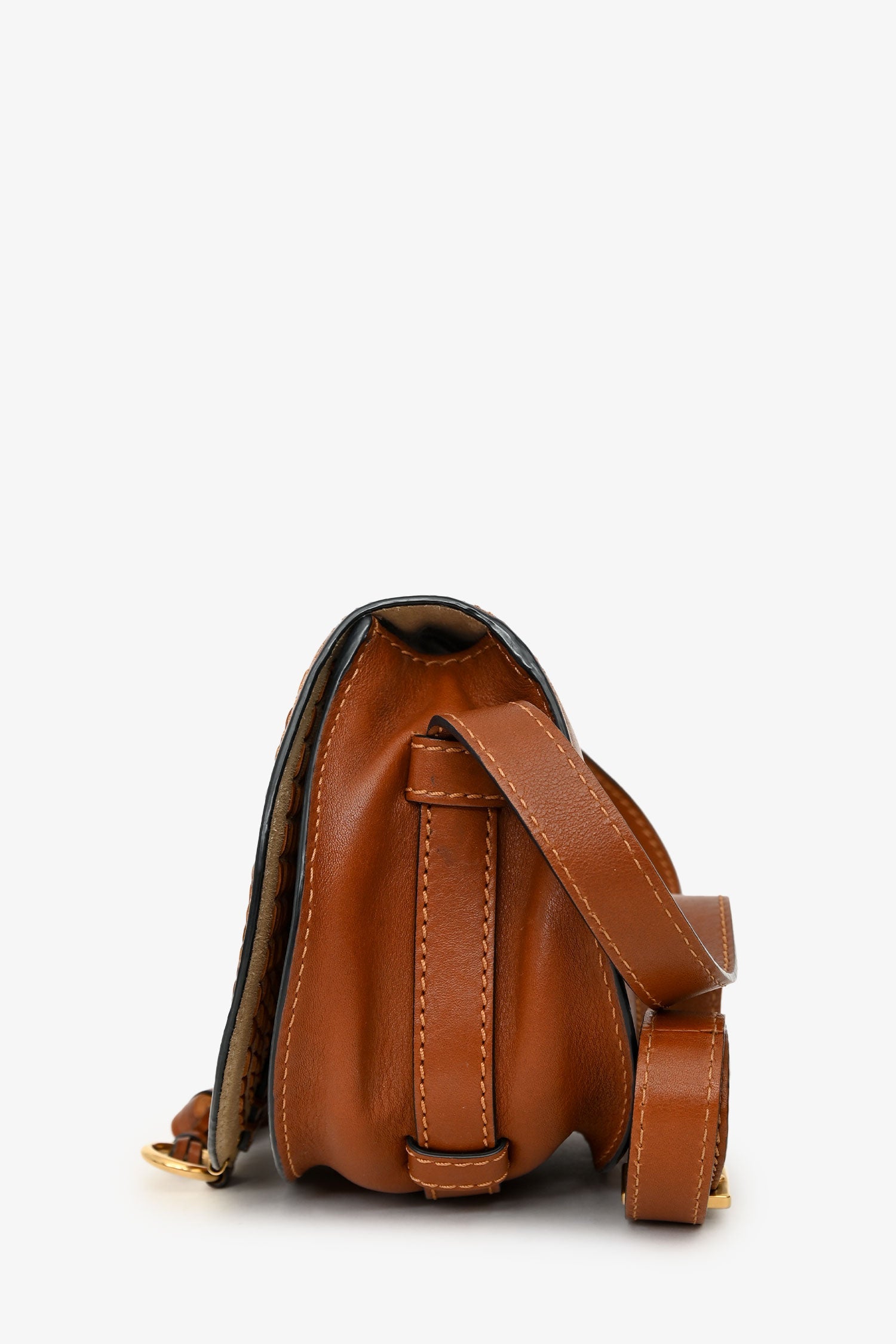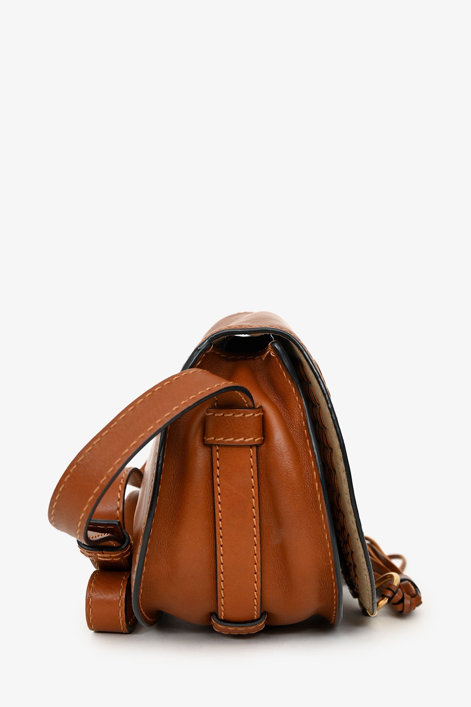 Chloe Brown Leather Whipstitch Small Saddle Marcie Crossbody Bag. Fold-over flap with a snap closure. Adjustable crossbody strap. Suede-lined interior with 3 compartments: 1 main, 1 slip, and 1 card slot. Gold-tone hardware. Tonal stitching.