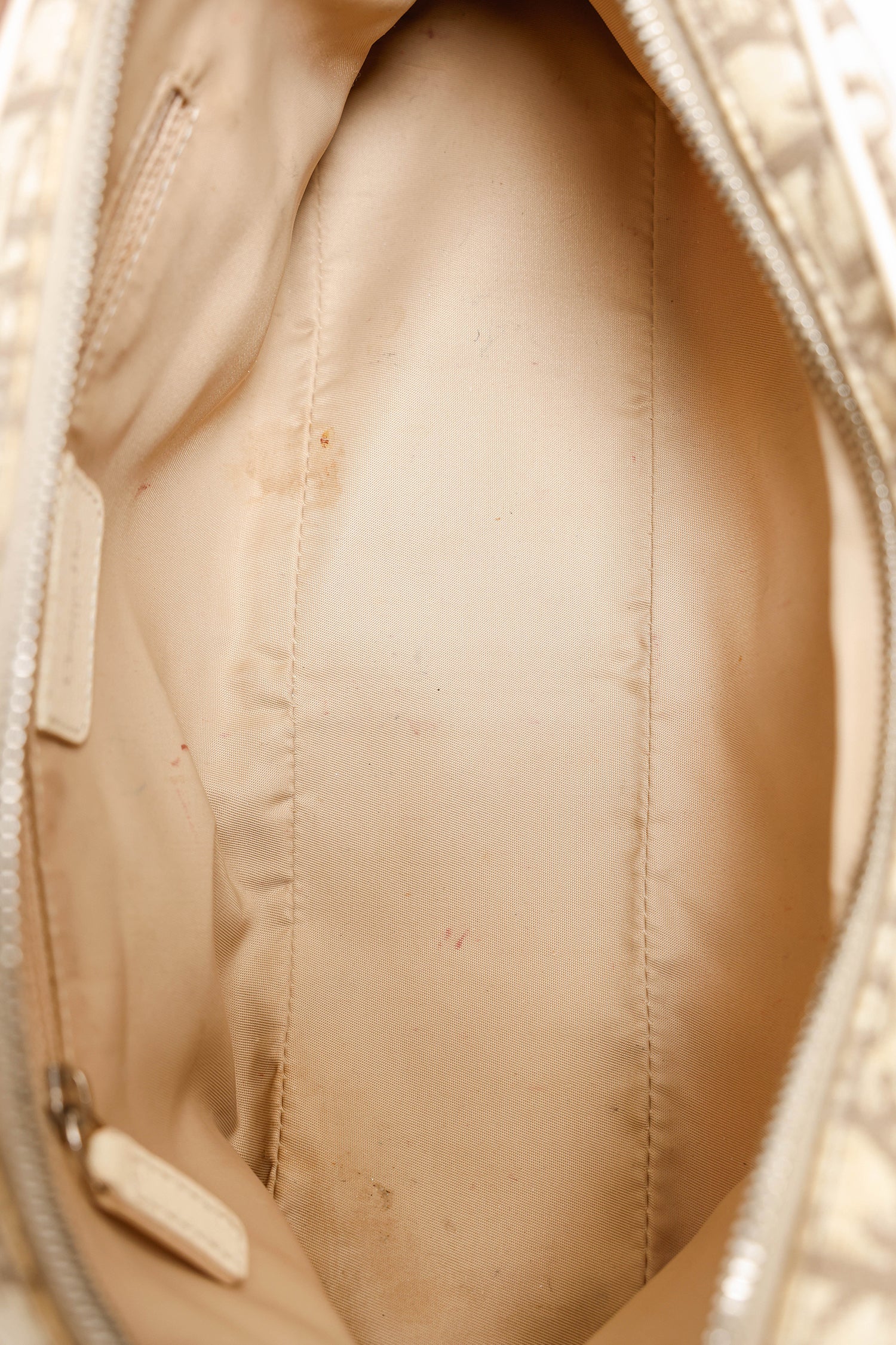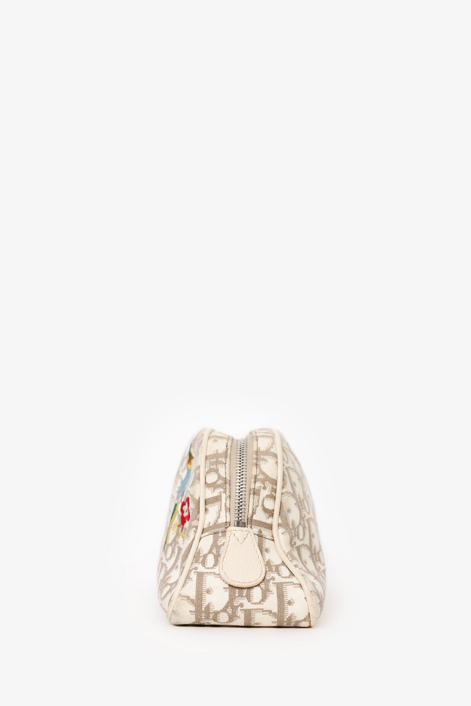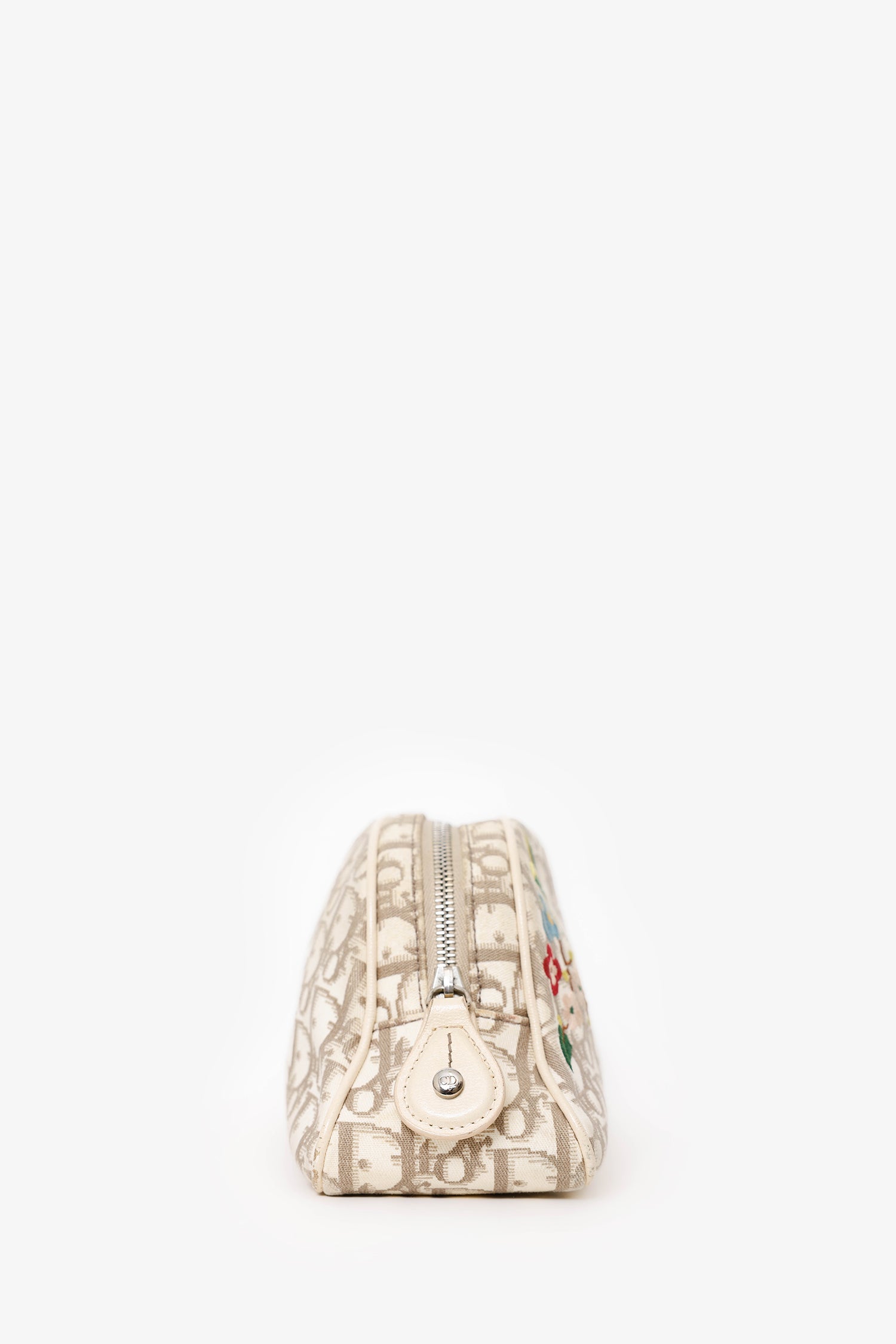 Christian Dior 2005 Beige/Cream Canvas Floral Embroidered Oblique Pouch. Top zip closure. Lined interior. Protective lined interior. Single interior zip pocket. Silver-tone hardware. Tonal stitching.