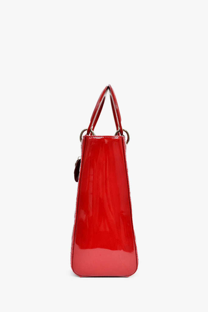 Christian Dior 2011 Red Patent Leather Large Lady Dior. Flat top handles. Silver-tone hardware. Lined interior with a zipped compartment. 'DIOR' single charms. Concealed top zipper. Tonal stitching.