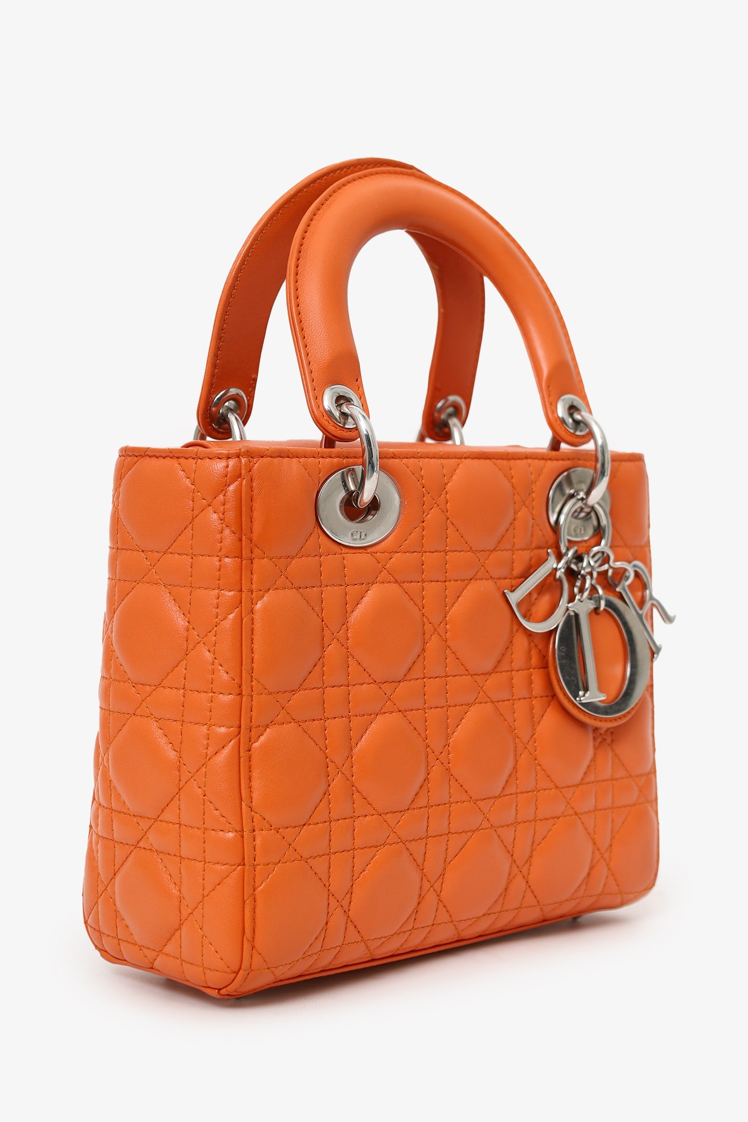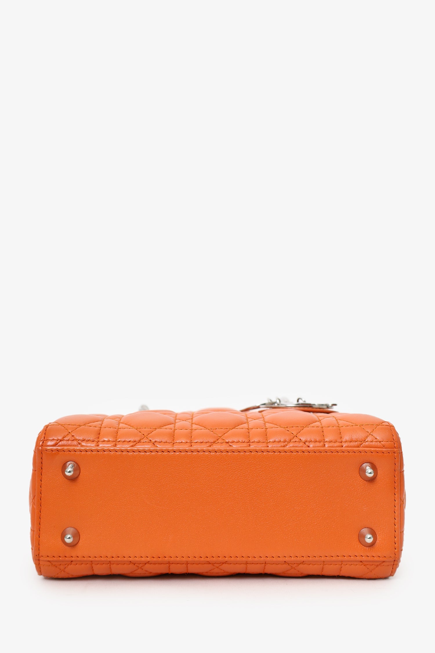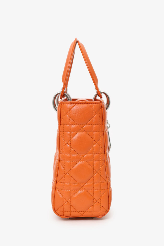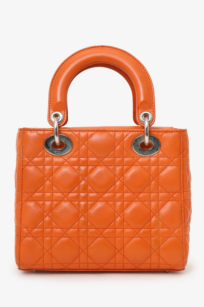 Christian Dior 2016 Orange Leather Cannage Small Lady Dior with Strap. Interior fold-over flap. Twin handles. Removable crossbody straps with lobster clasp closure. Protective studs on bottom. Lined interior. Single interior zip pocket. Silver-tone hardware. Tonal stitching.