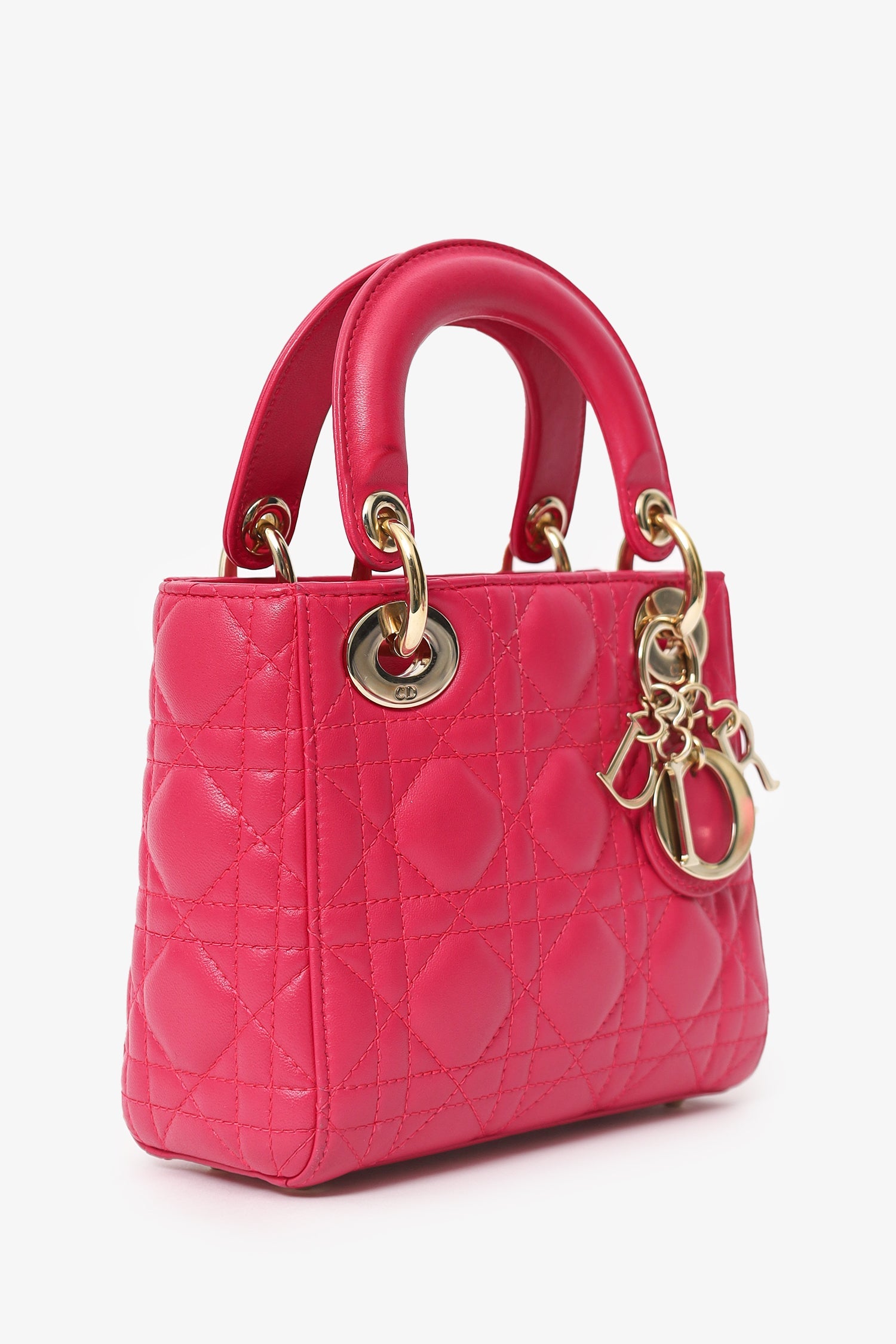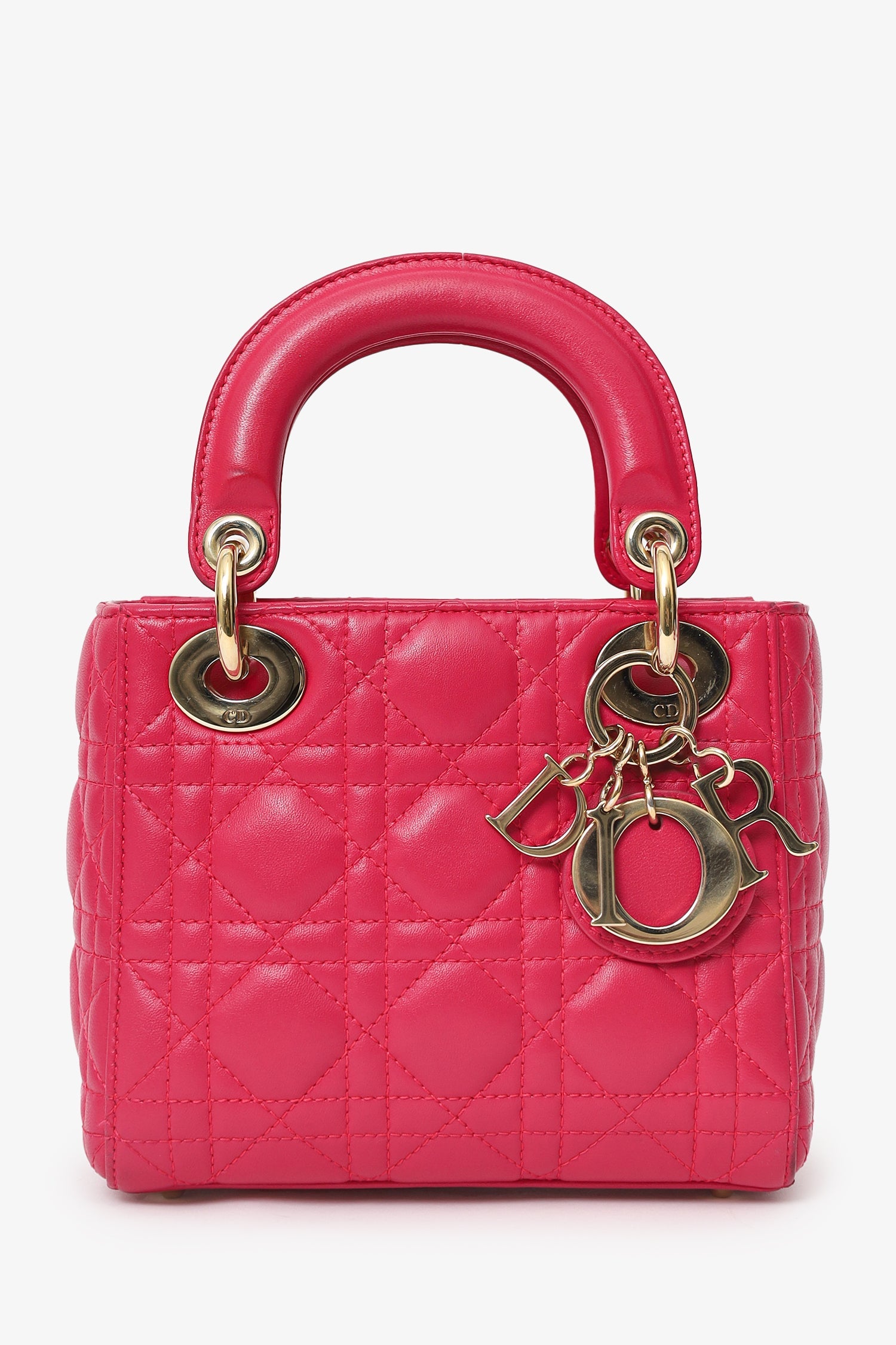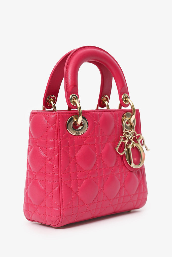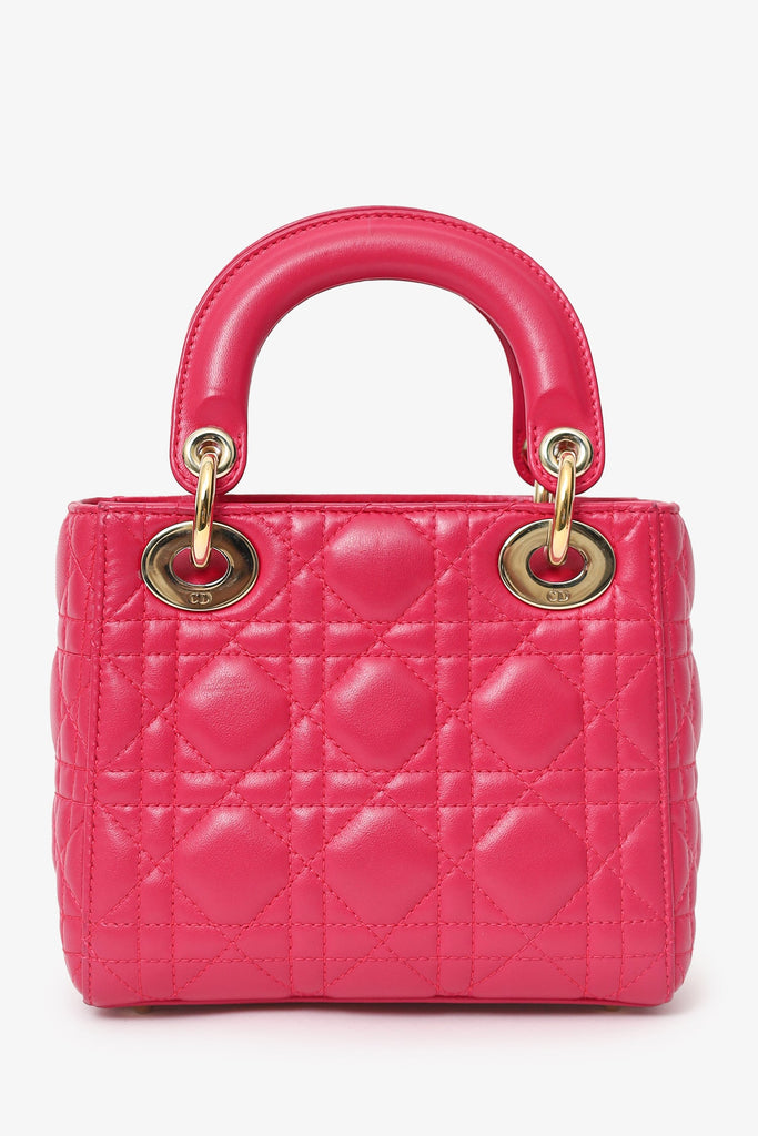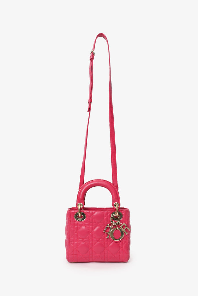 Christian Dior 2016 Pink Cannage Leather Mini Lady Dior With Strap. Interior fold-over flap. Twin top handles. Removable and adjustable crossbody strap with lobster clasp closure. Protective base studs. Lined interior. Single interior zip pocket. Gold-tone hardware. Tonal stitching.