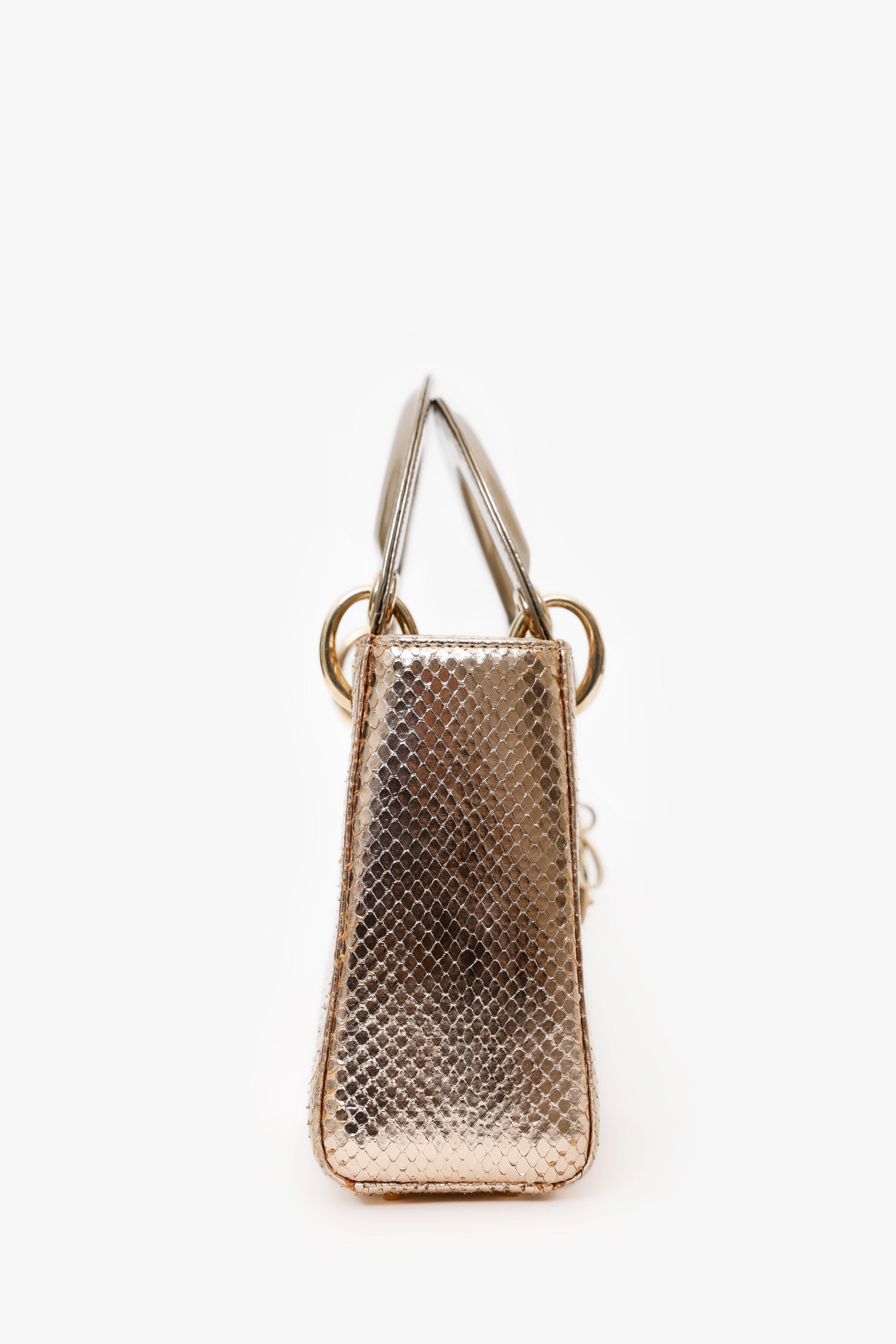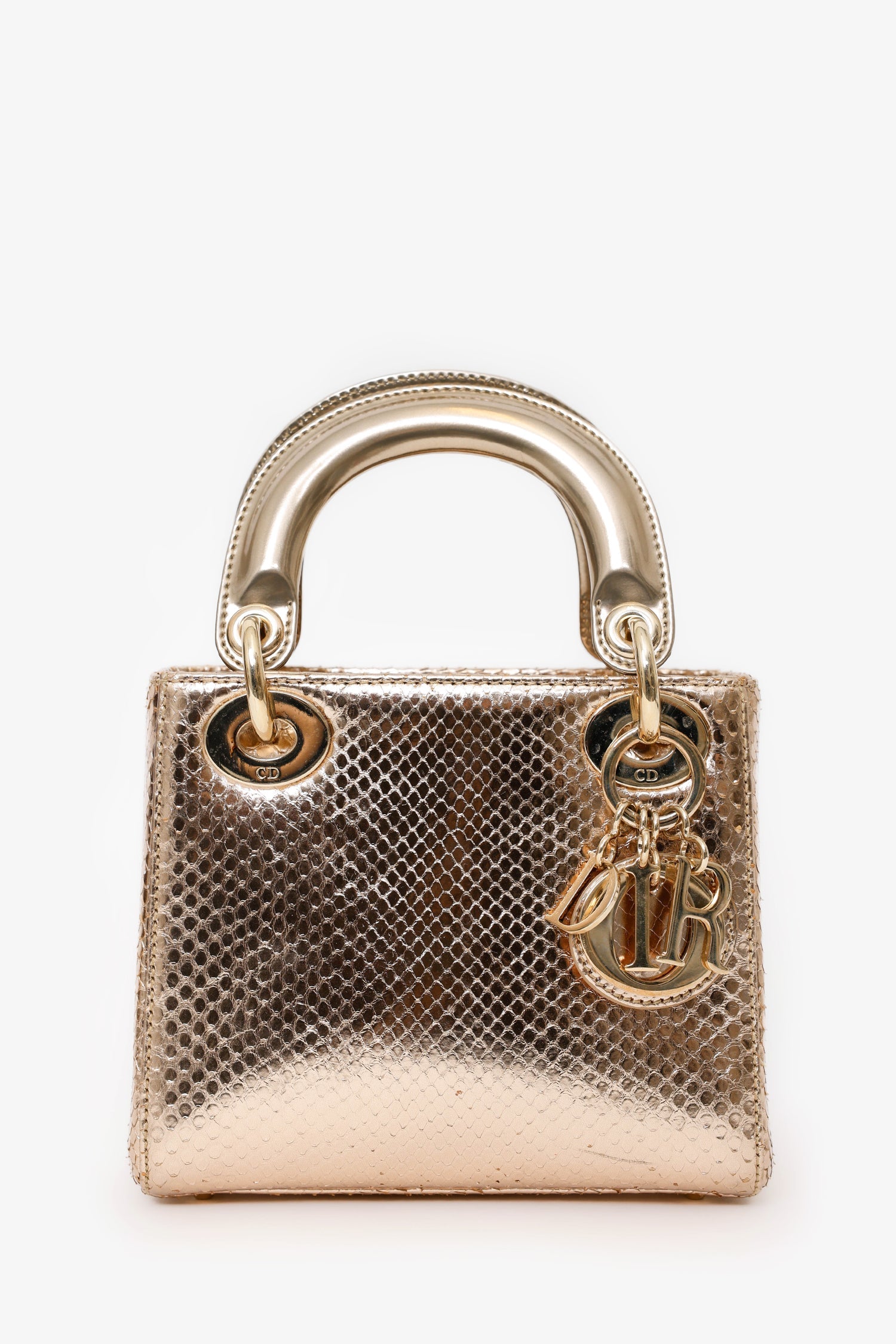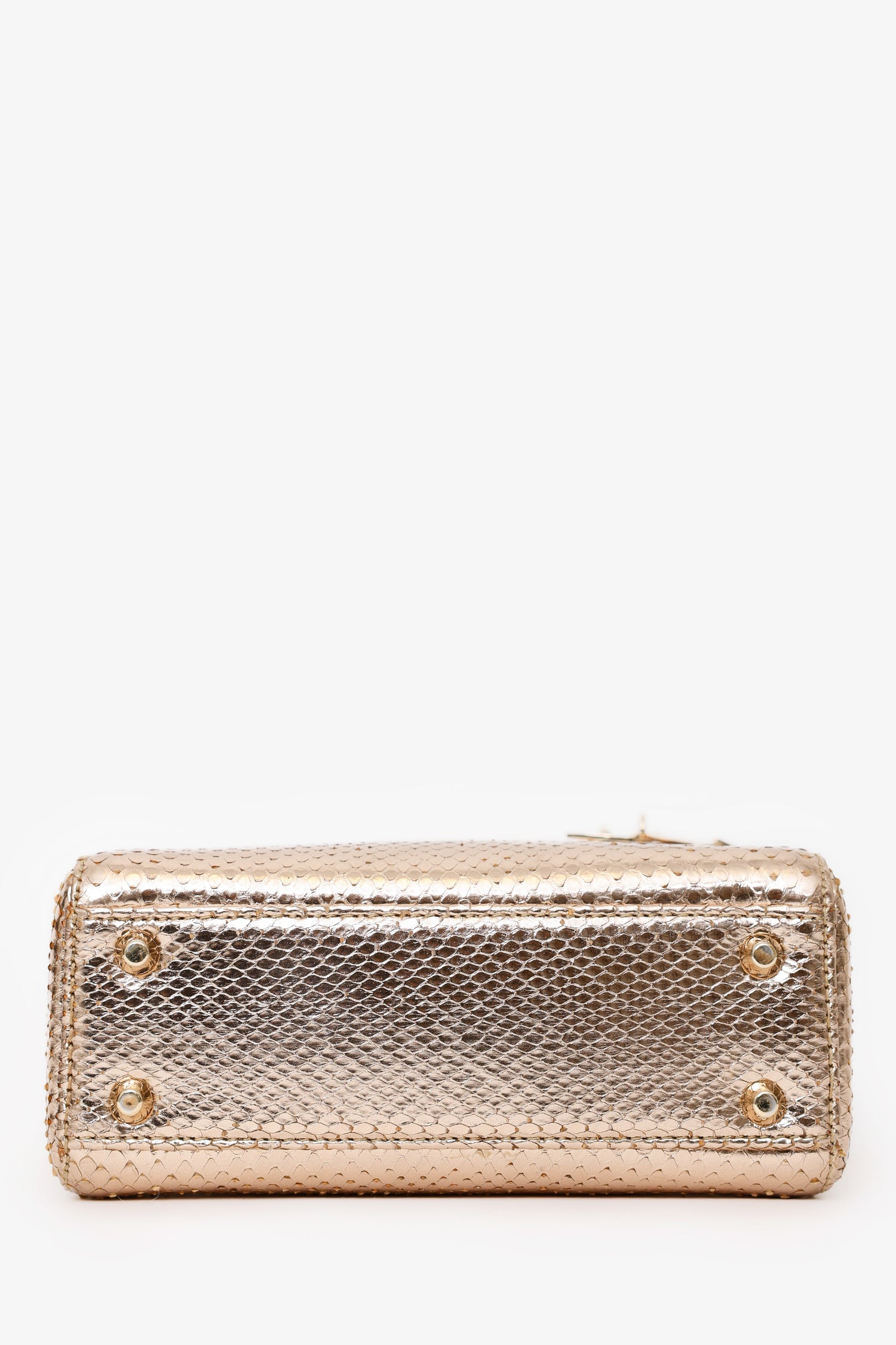 Christian Dior 2017 Rose Gold Metallic Python Mini Lady Dior. Fold-over interior flap. Twin top handles. Chain-link strap. Suede-lined interior. Protective base studs. Leather-lined interior. Single interior zip pocket. Gold-tone hardware. Tonal stitching.