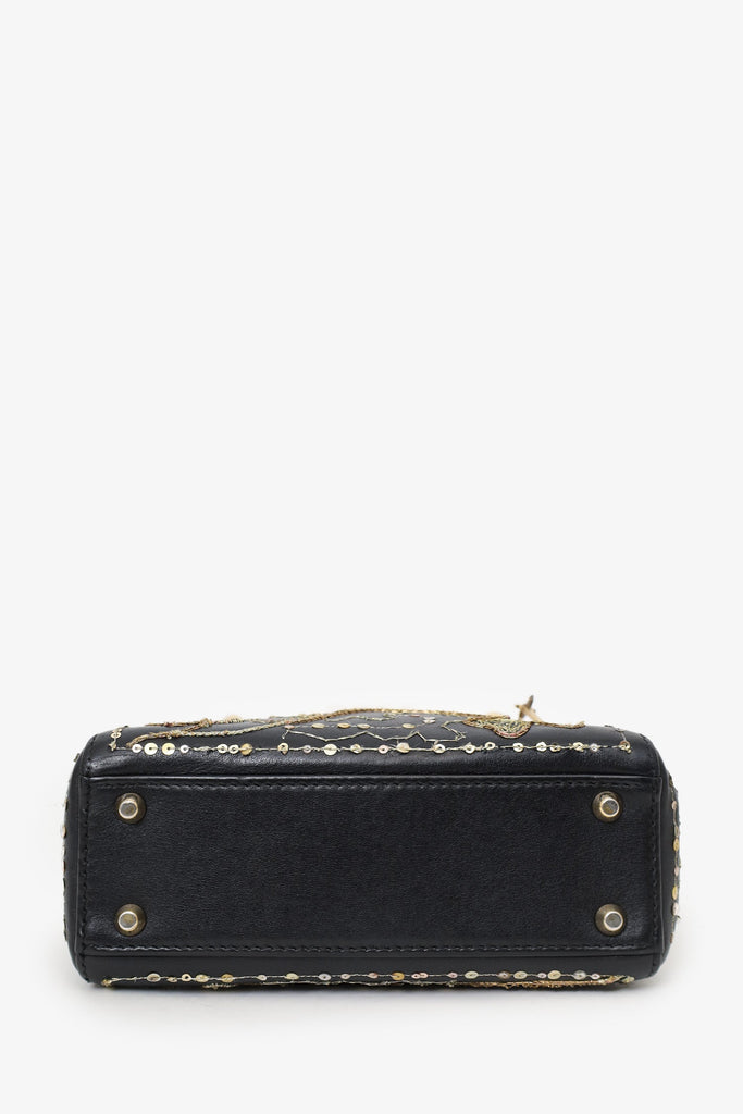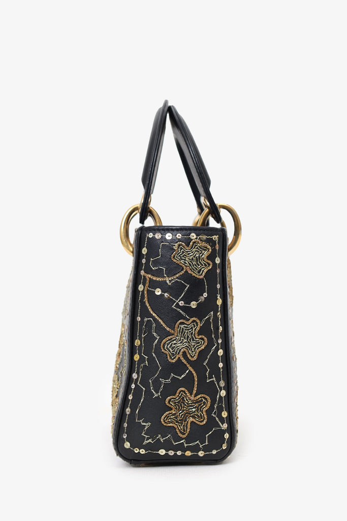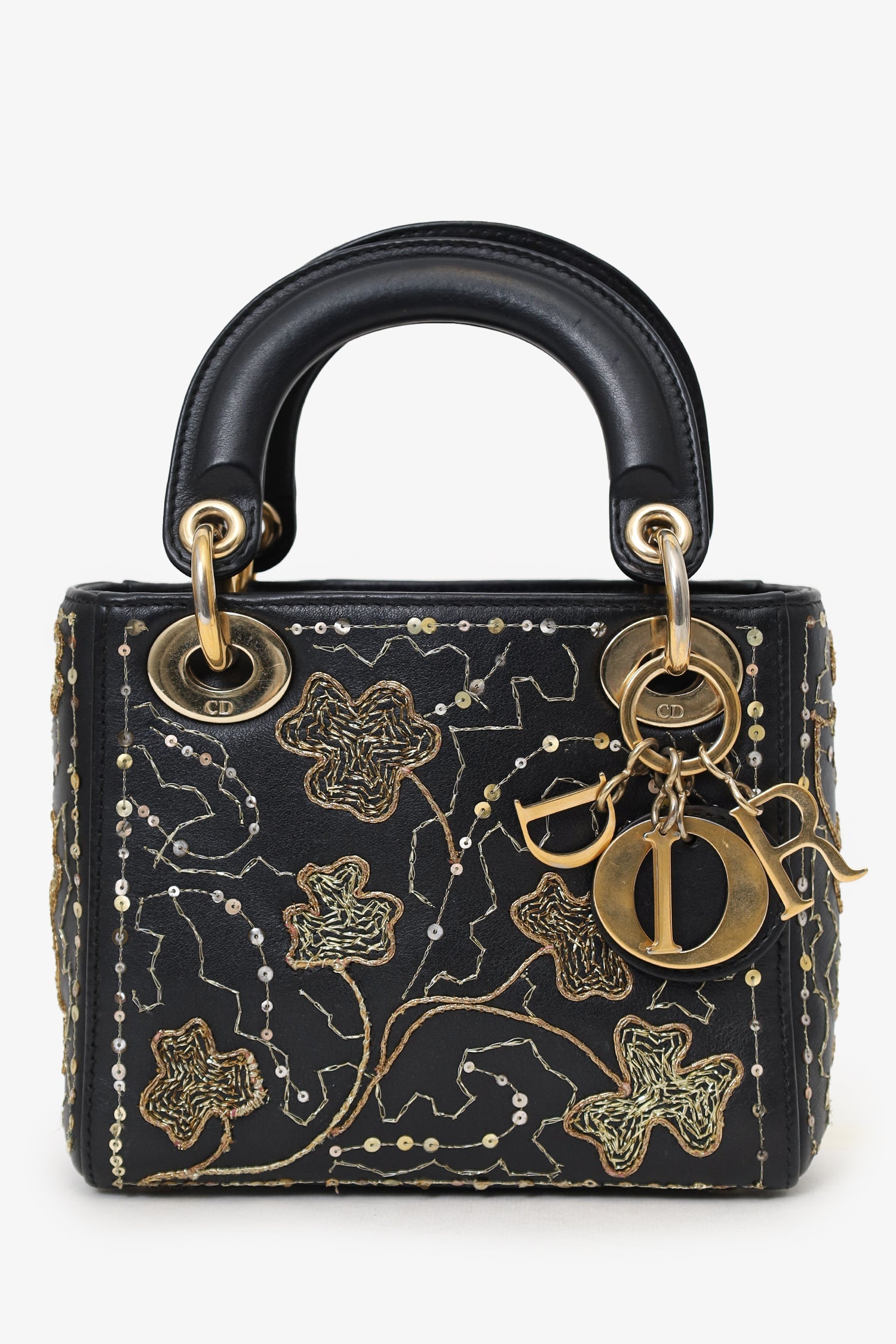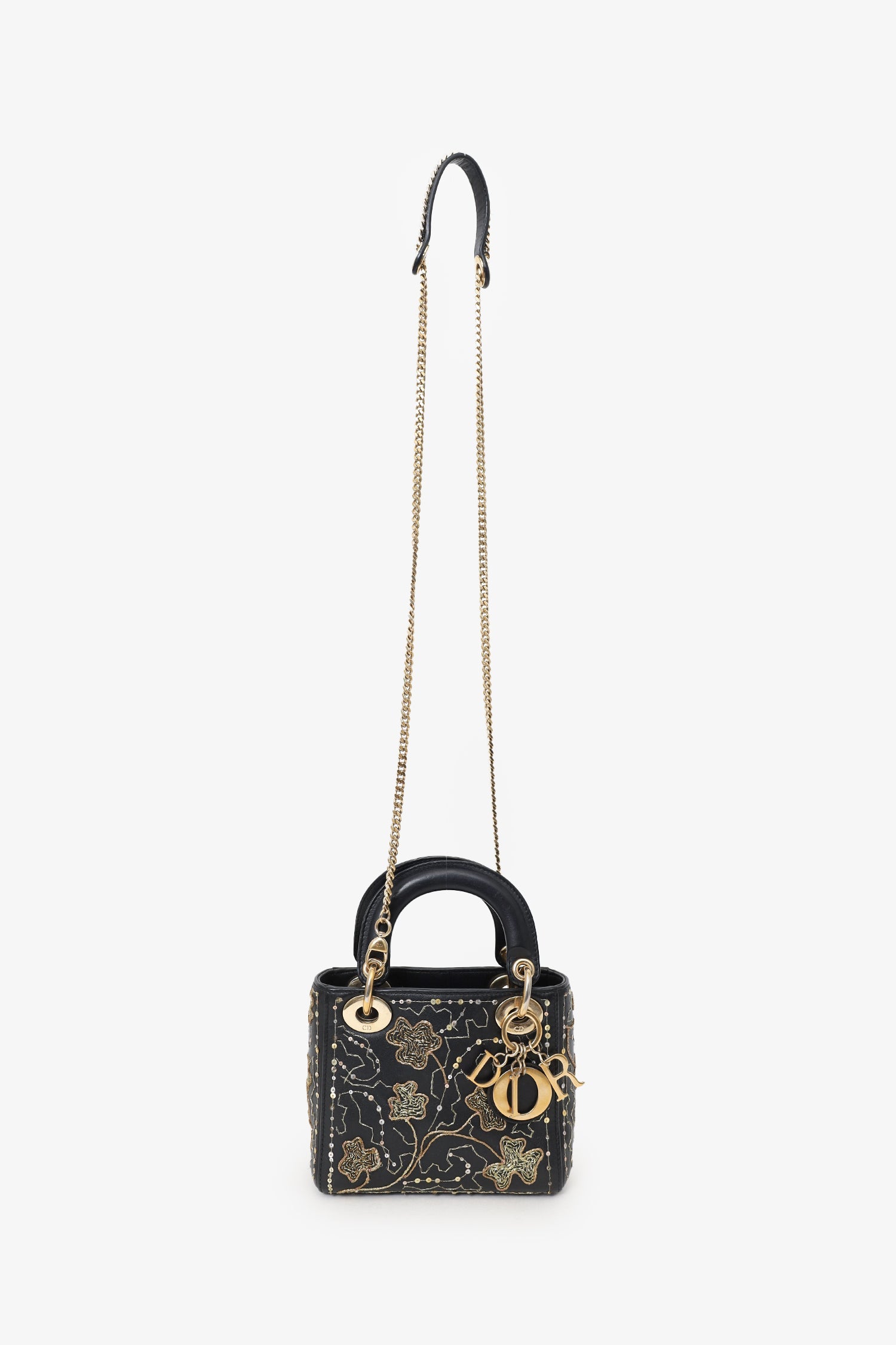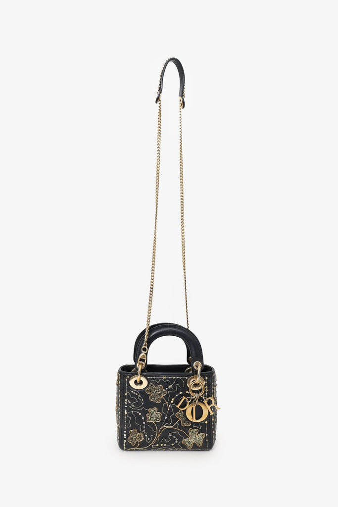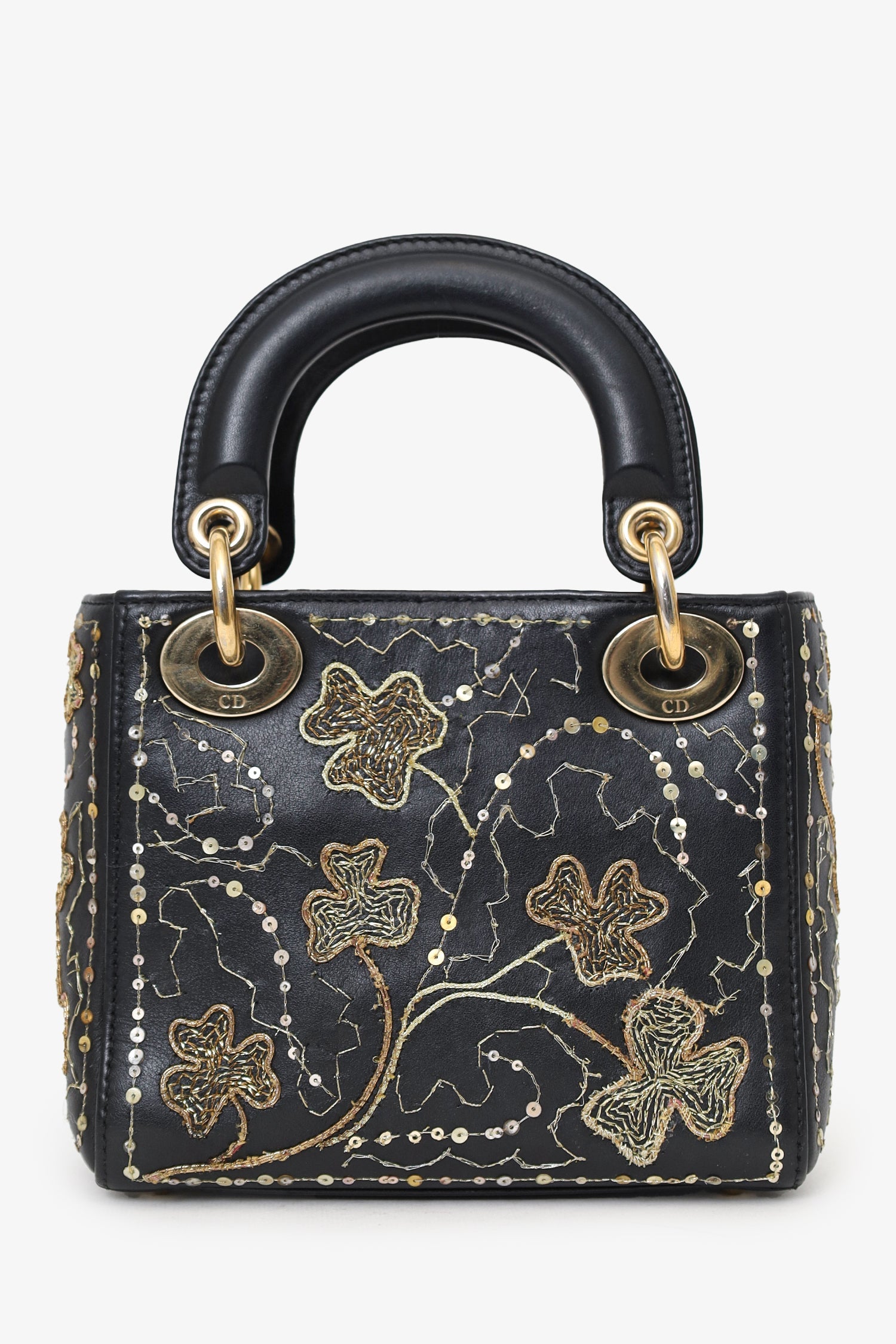 Christian Dior 2018 Black Leather Gold 'Clovers' Embroidered Mini Lady Dior