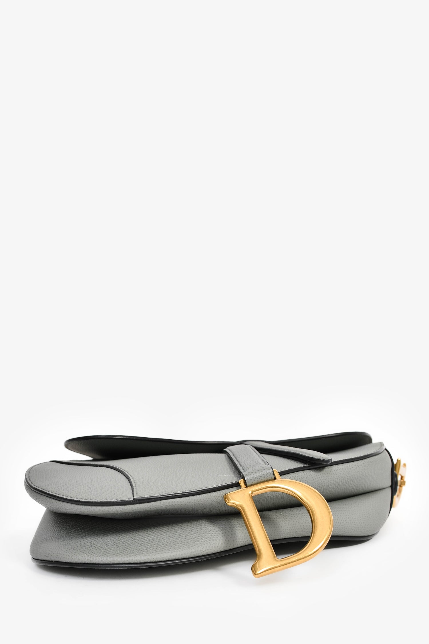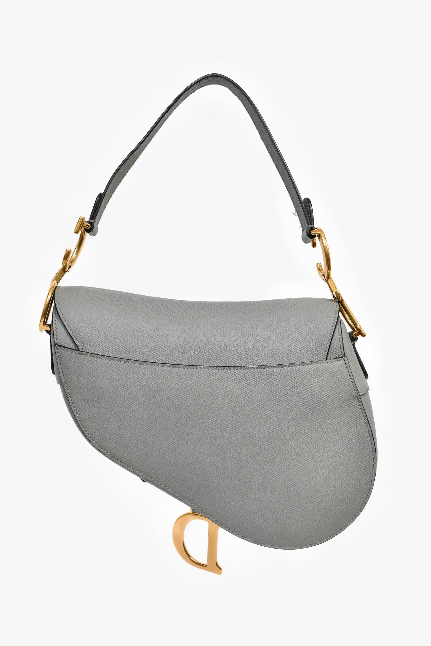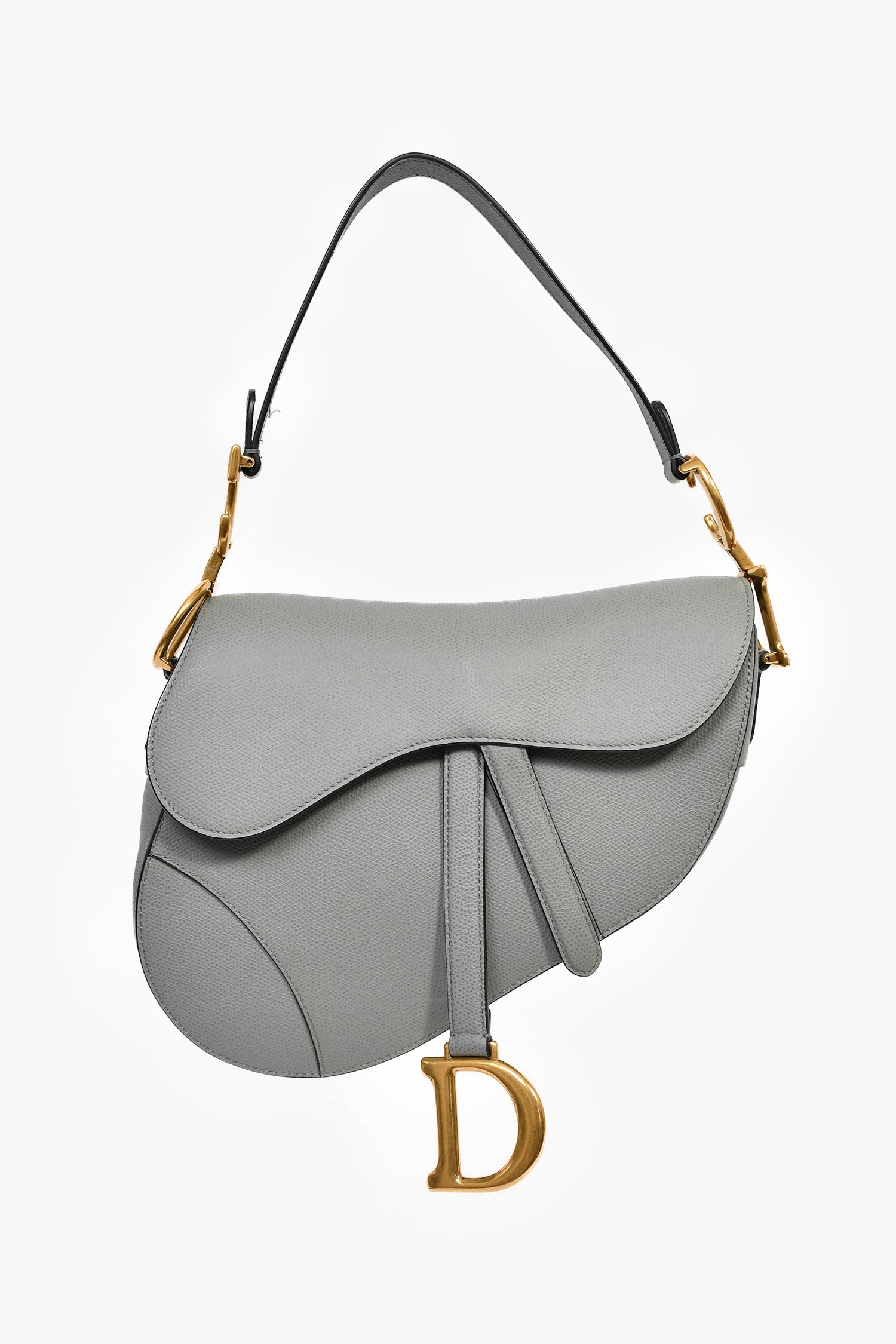 Christian Dior 2019 Grey Leather Classic Saddle Bag. Front fold-over flap with magnetic button closure. Single shoulder strap. Suede-lined interior. Single interior wall zip pocket. Gold-tone hardware. Tonal stitching.