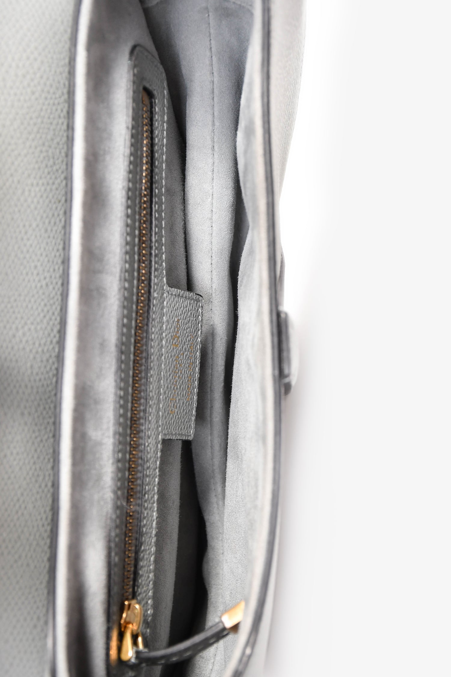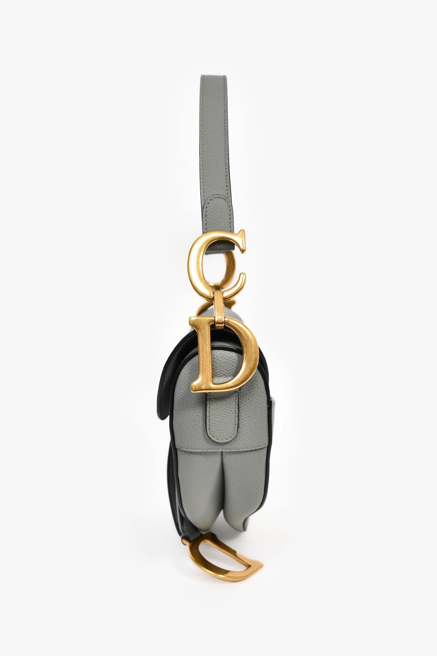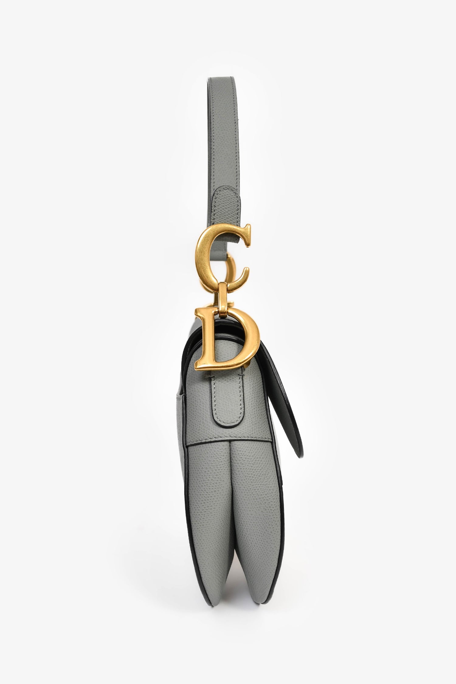 Christian Dior 2019 Grey Leather Classic Saddle Bag. Front fold-over flap with magnetic button closure. Single shoulder strap. Suede-lined interior. Single interior wall zip pocket. Gold-tone hardware. Tonal stitching.