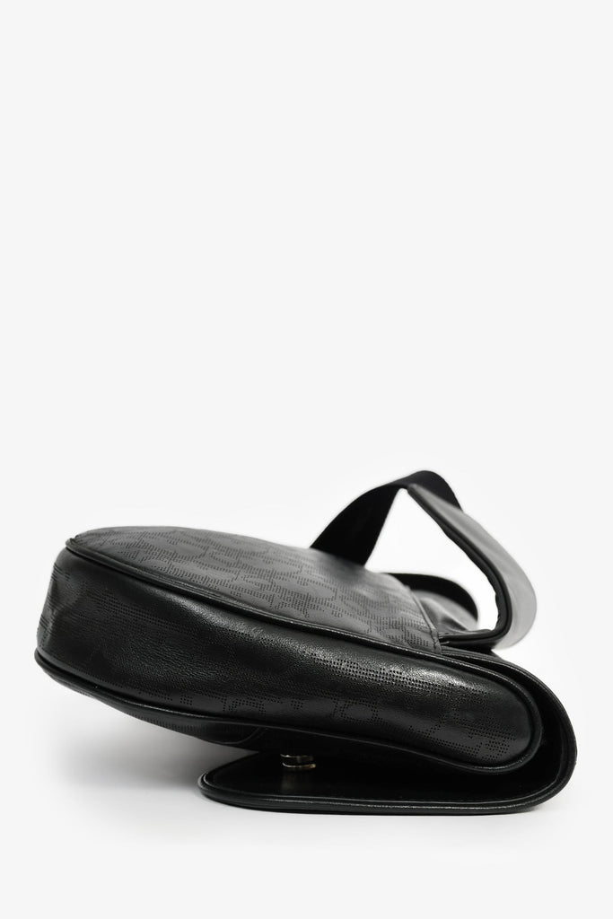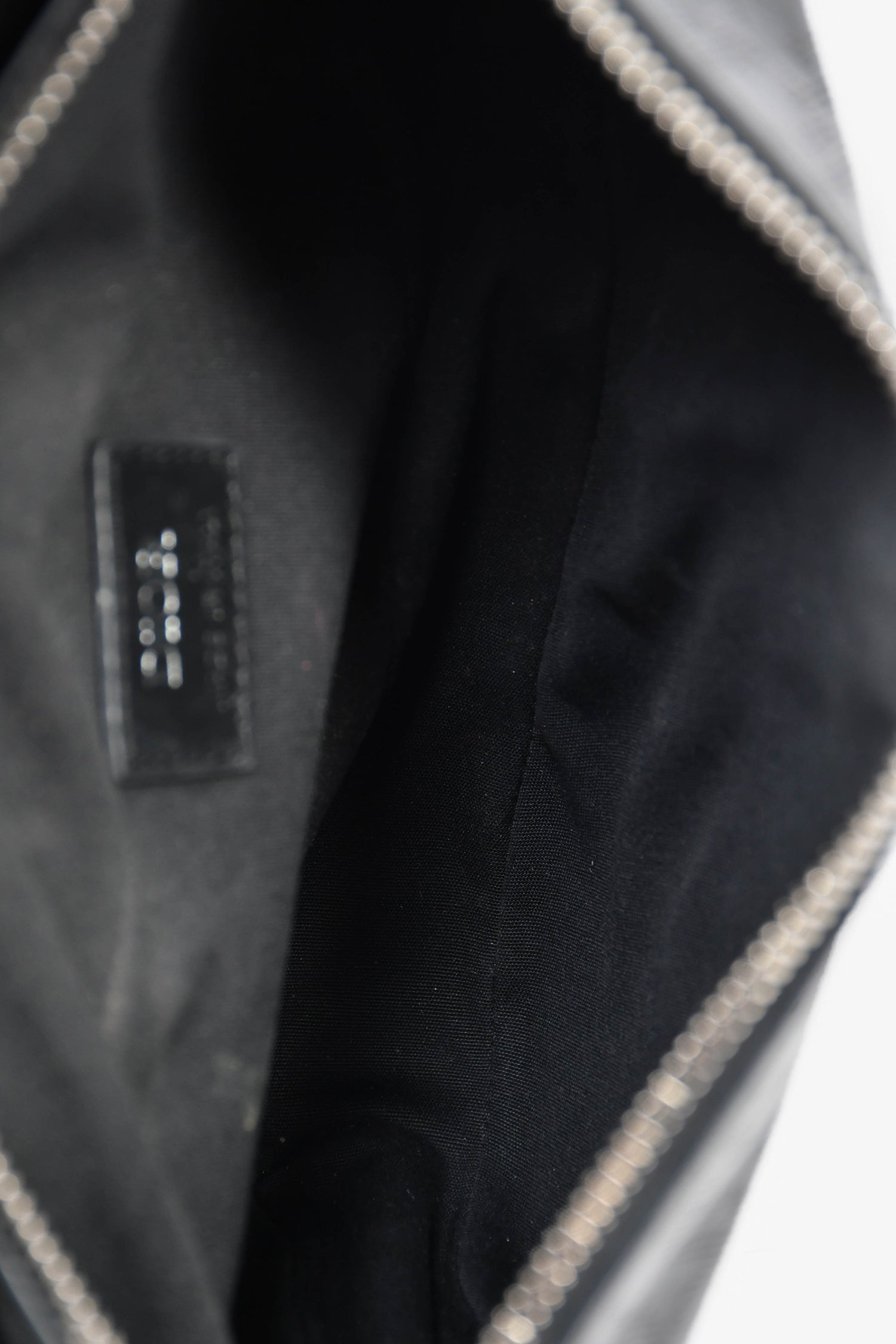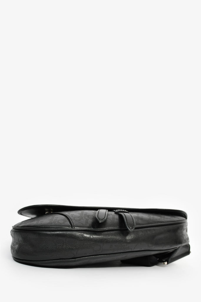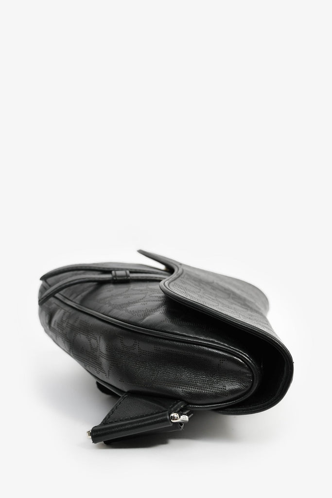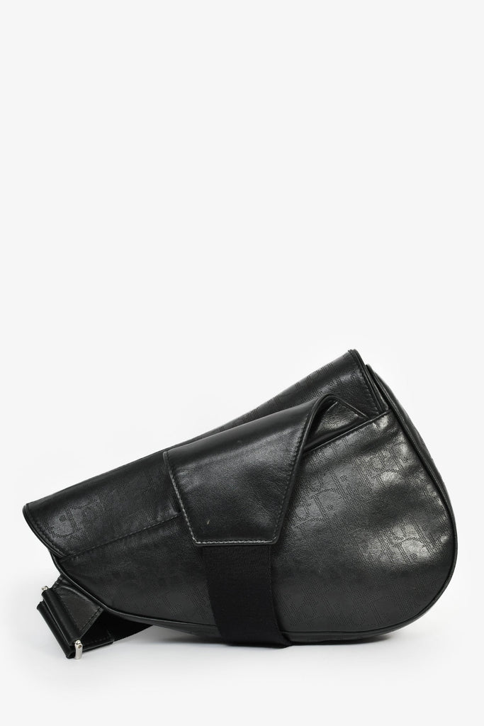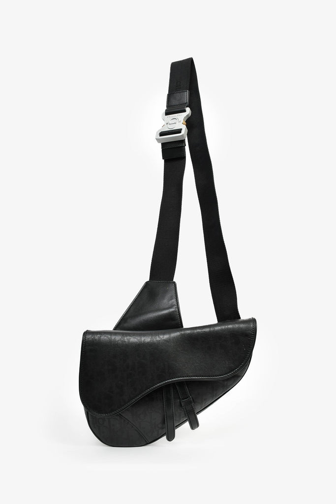 Christian Dior 2020 Black Oblique Leather Saddle Bag. Front fold-over 'sadde' flap with a magnetic closure. Concealed zipper. Crossbody strap with a snap buckle. Leather trim. Lined interior. Silver-tone hardware. Tonal stitching.