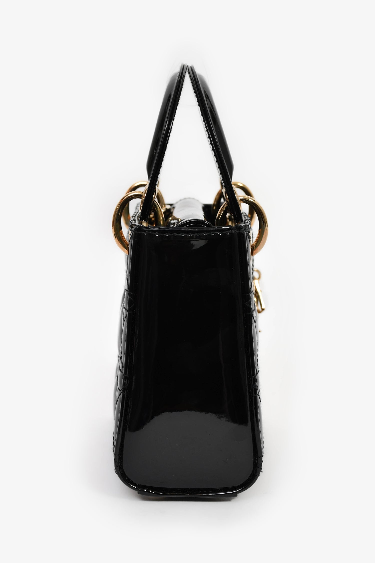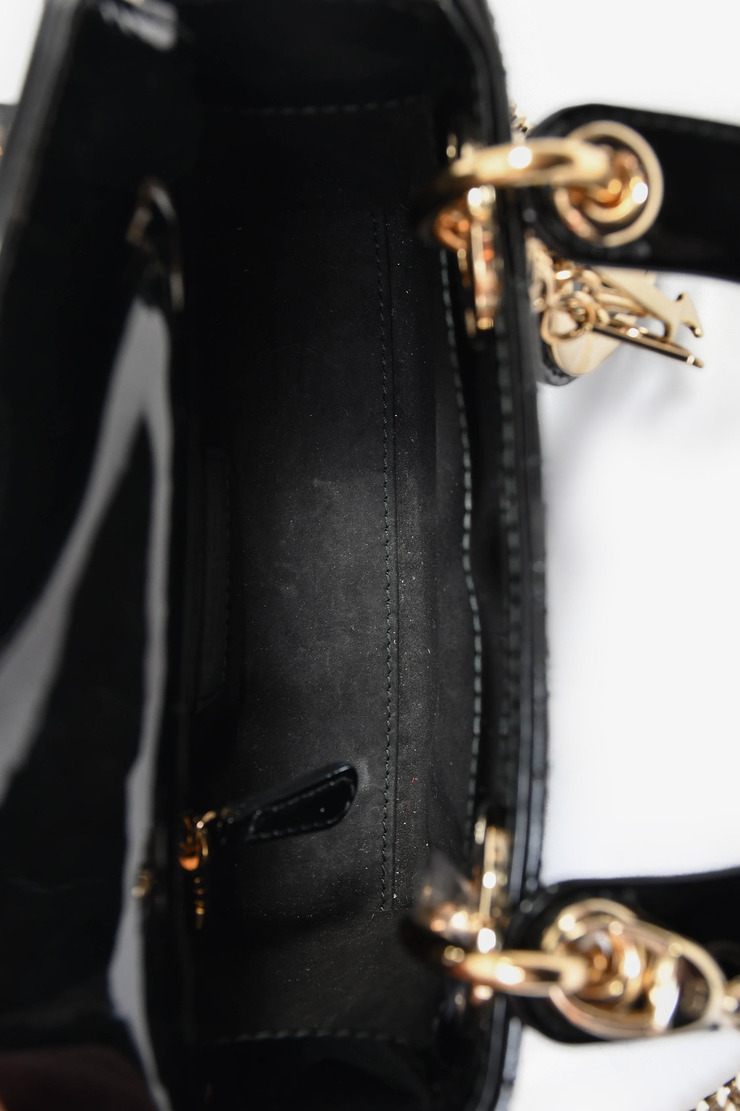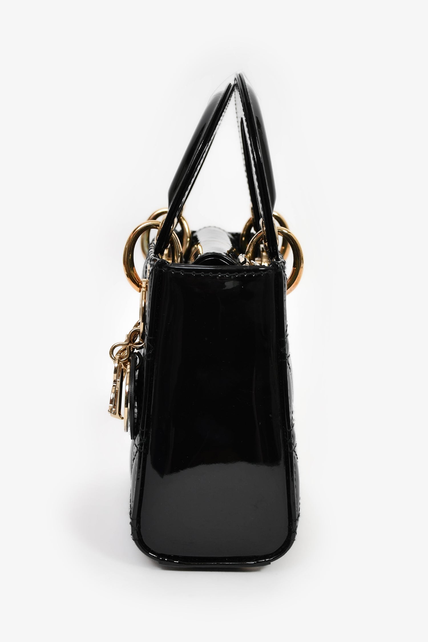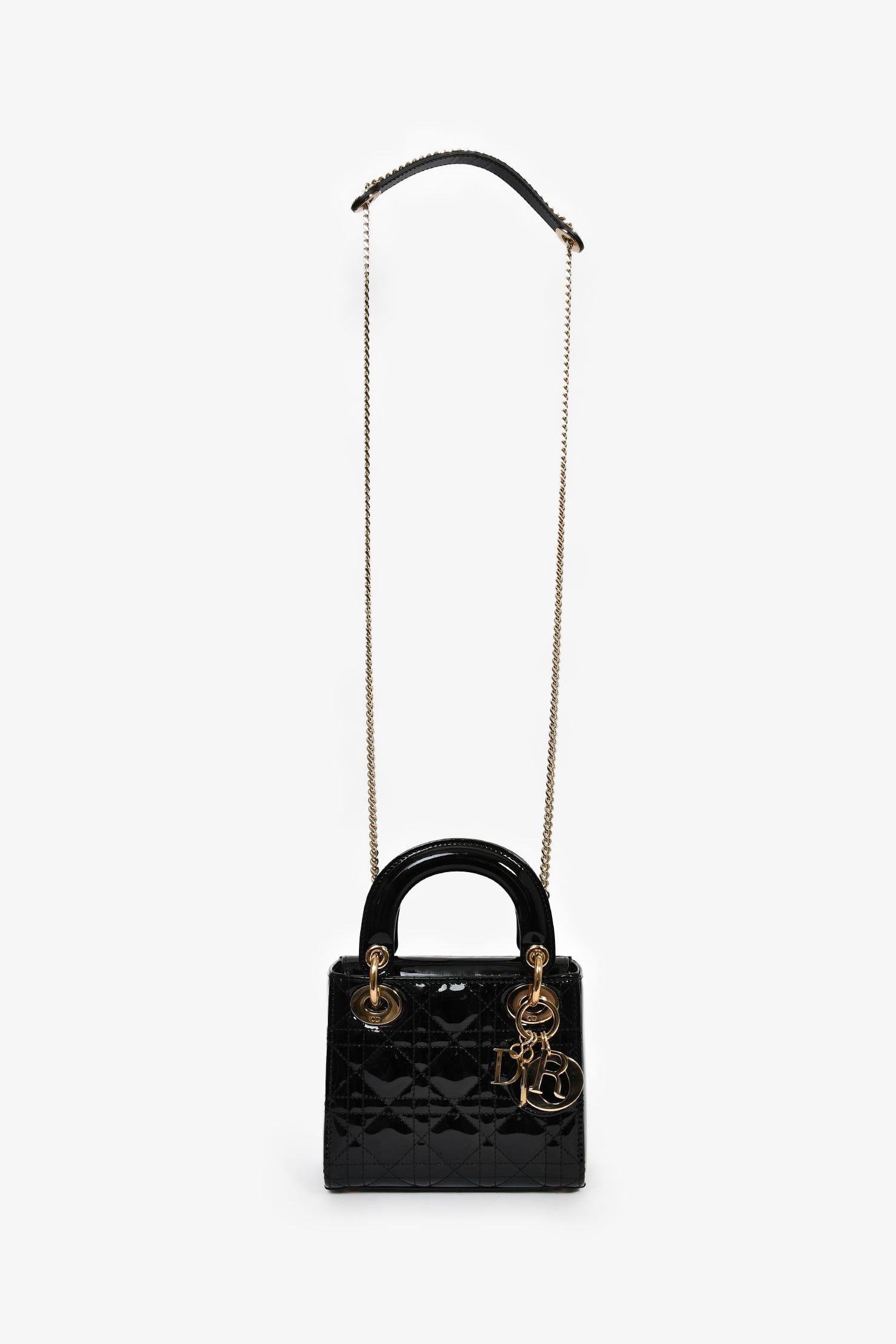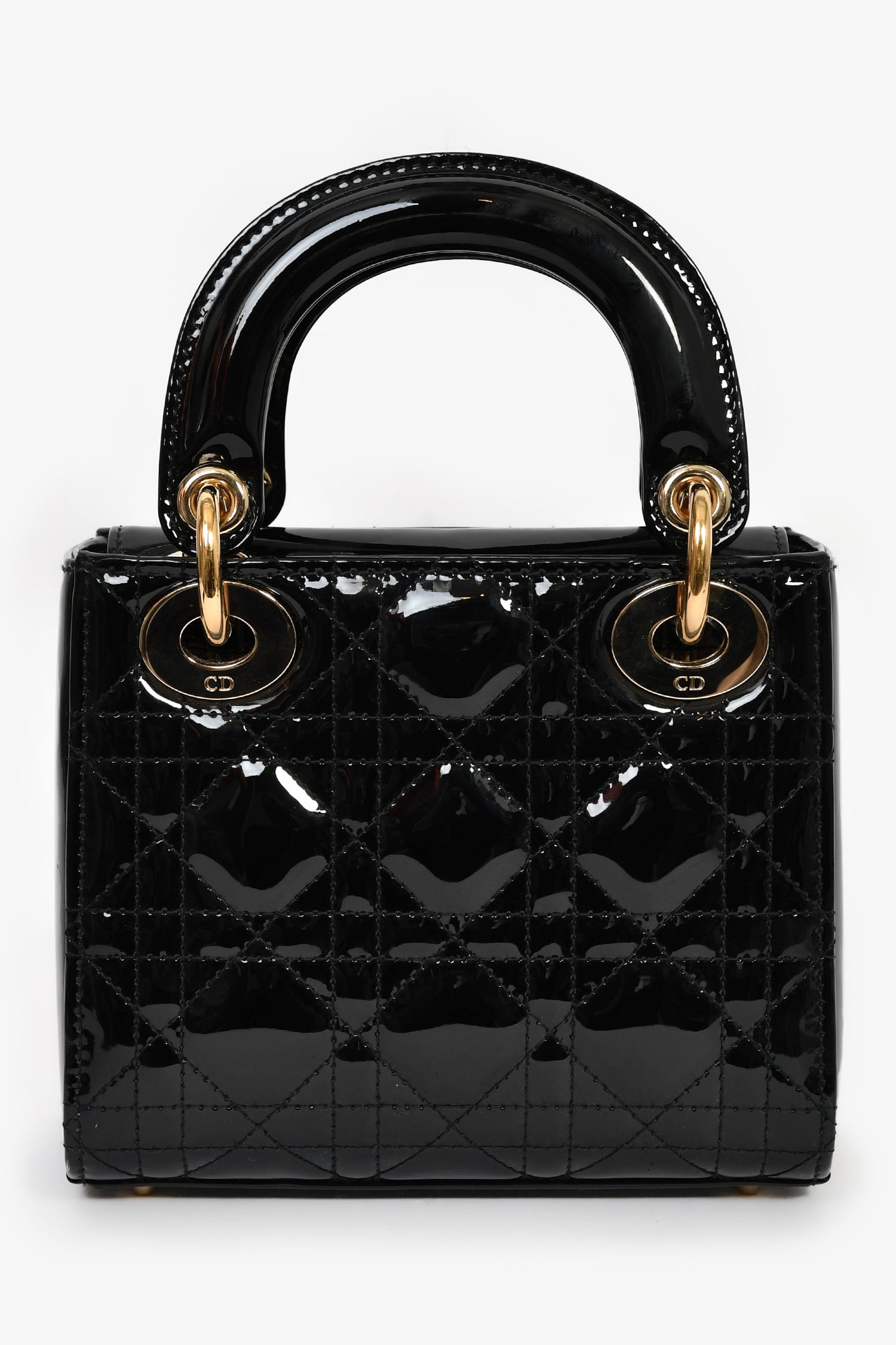 Christian Dior 2020 Black Patent Leather Mini Lady Dior Bag. Dual rolled top handles. Top interior fold-over flap. Protective base studs. Chain-link and patent shoulder straps. Suede-lined interior with 1 zip compartment. Gold-tone hardware. Tonal stitching.