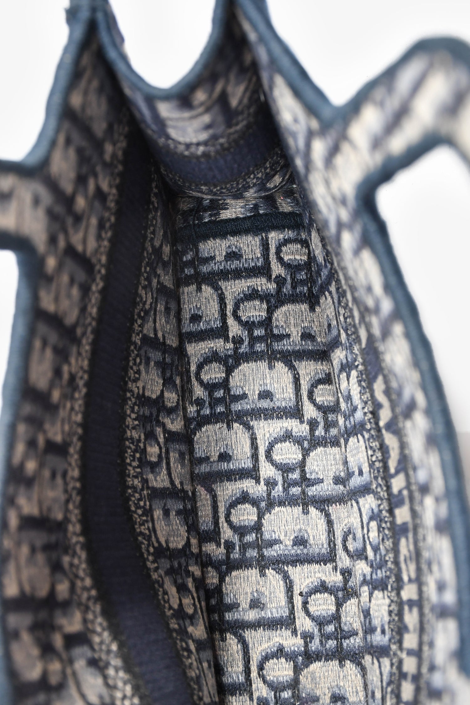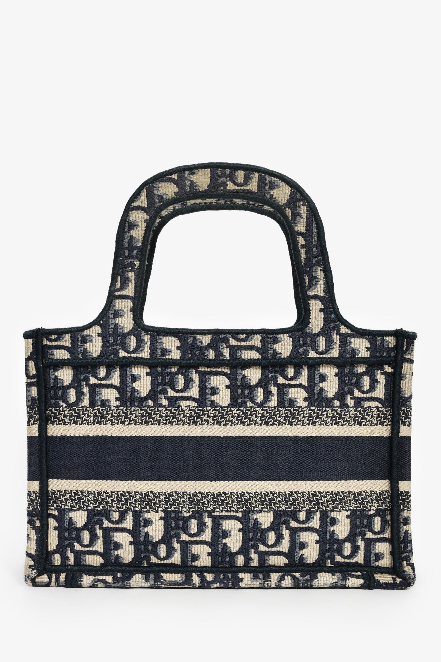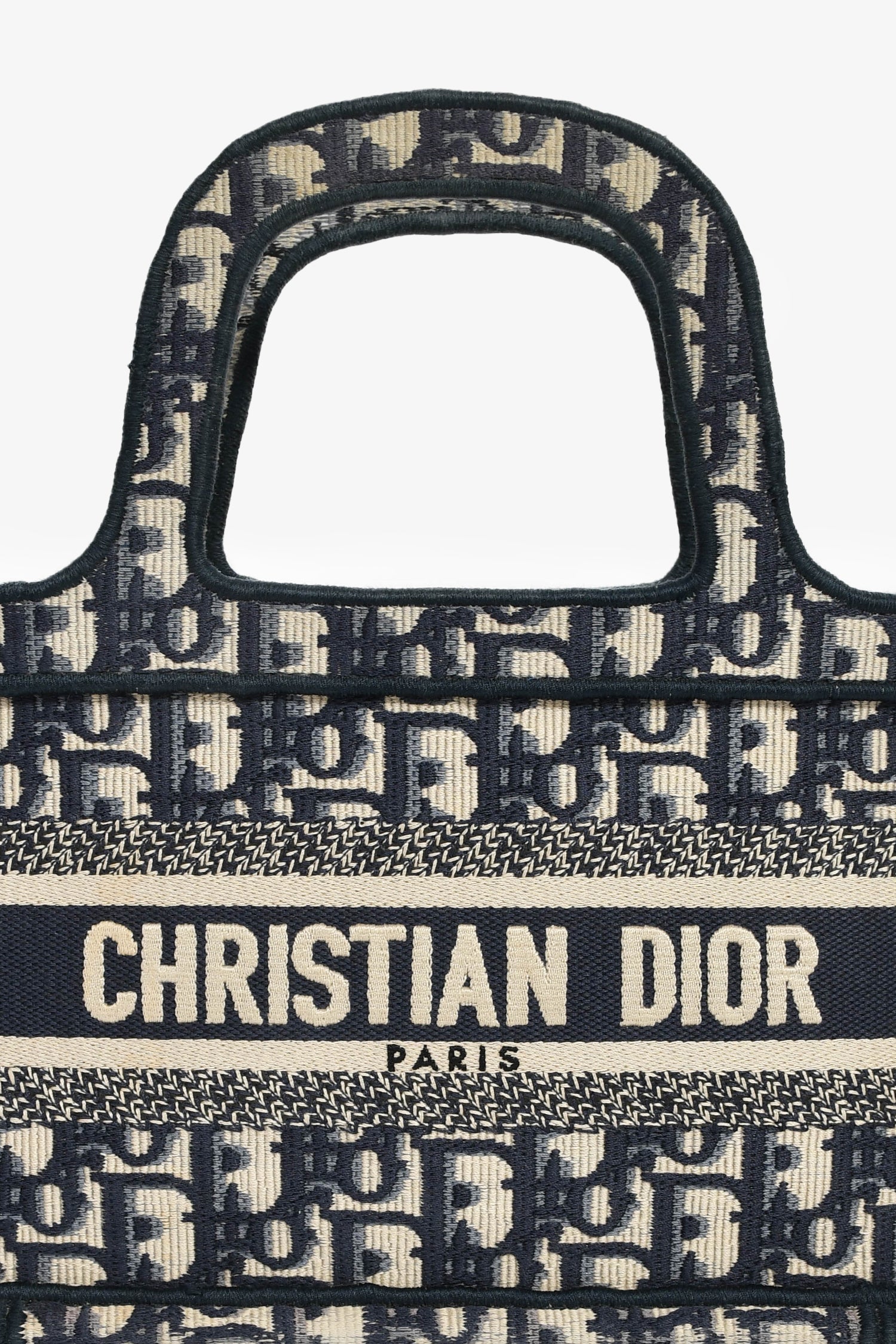 Christian Dior 2020 Navy Oblique Mini Book Tote. Open top handle straps. Open interior. Tonal stitching.