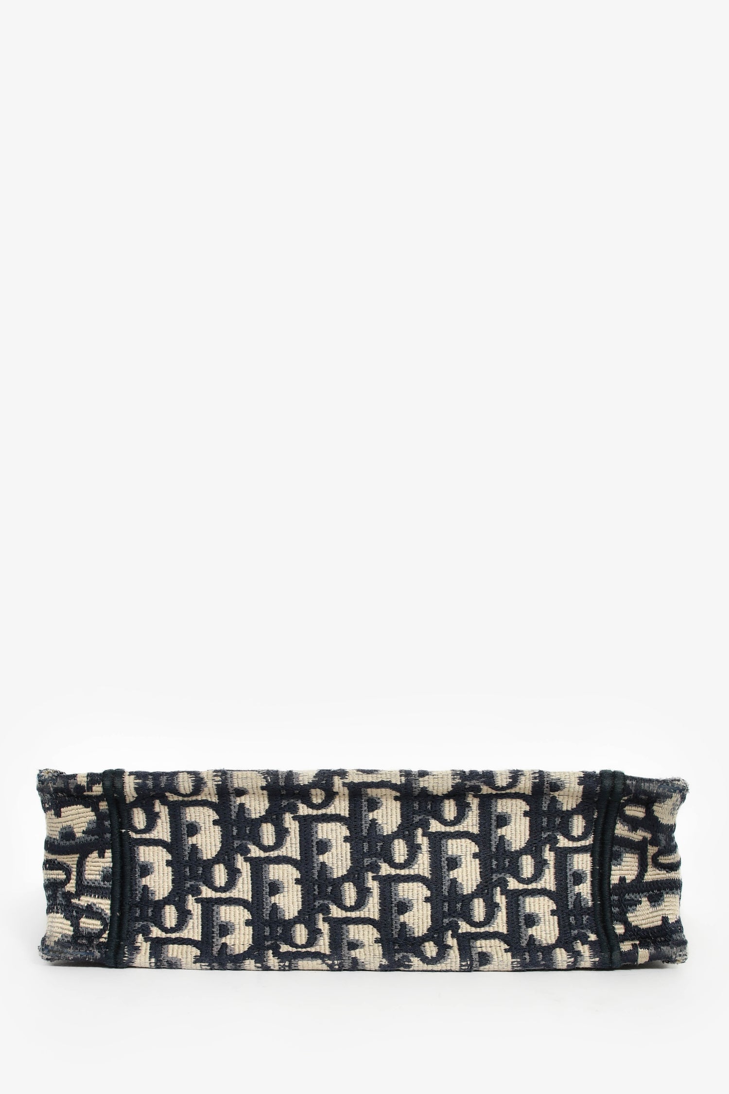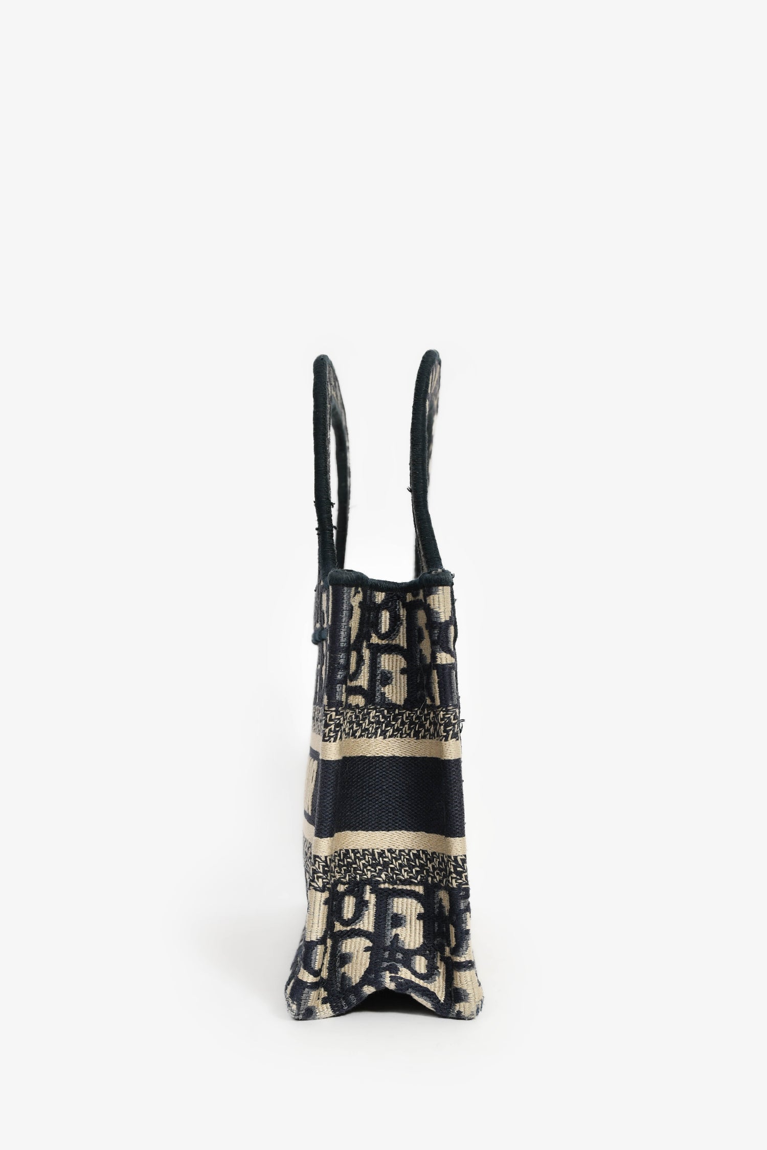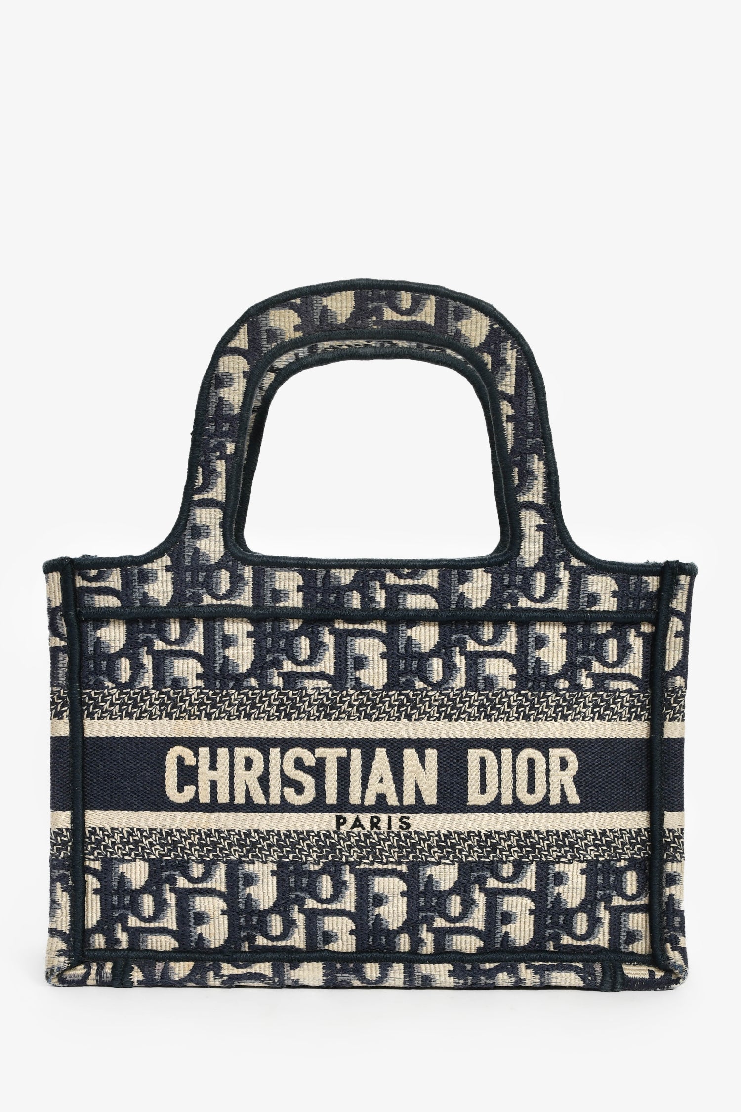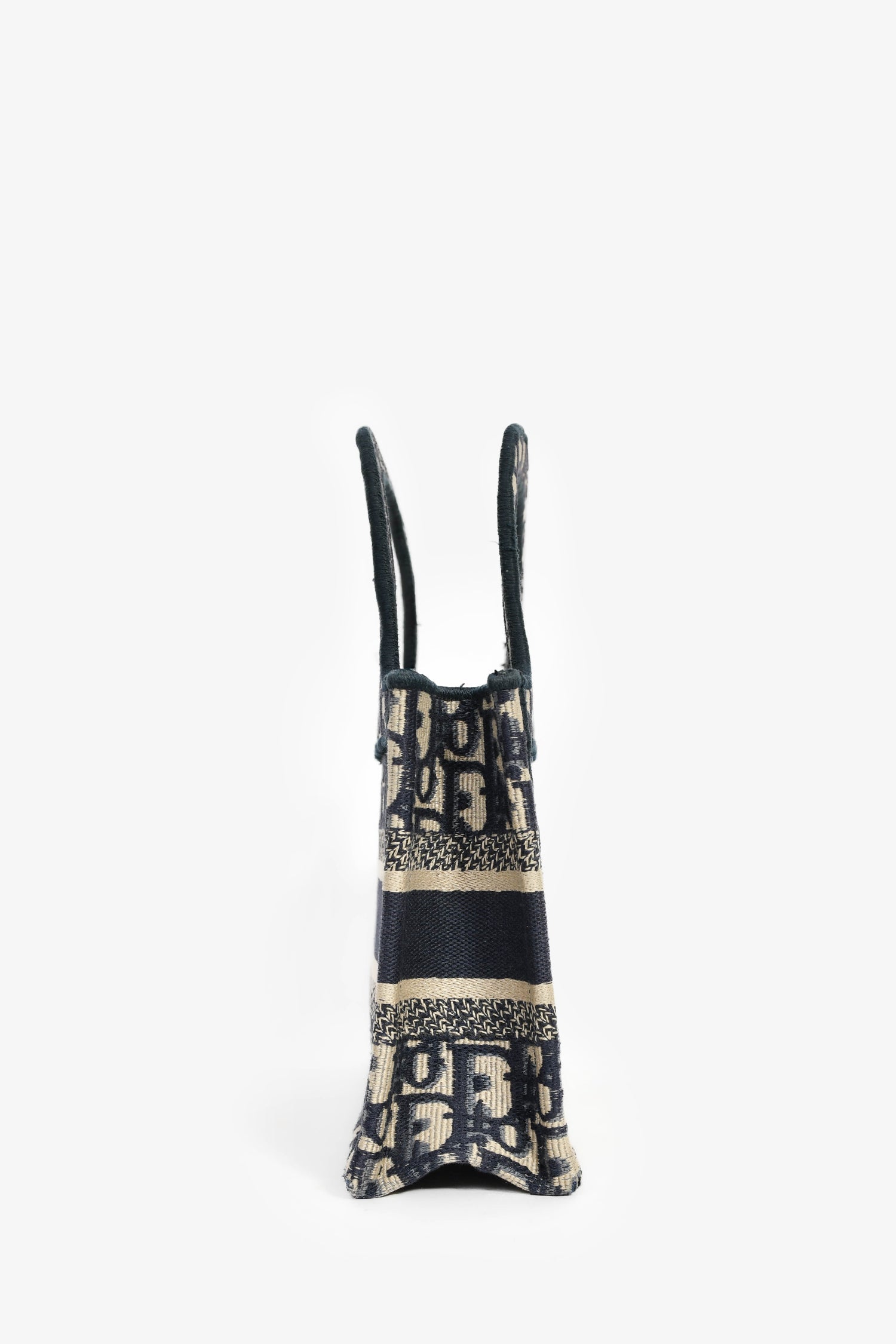 Christian Dior 2020 Navy Oblique Mini Book Tote. Open top handle straps. Open interior. Tonal stitching.
