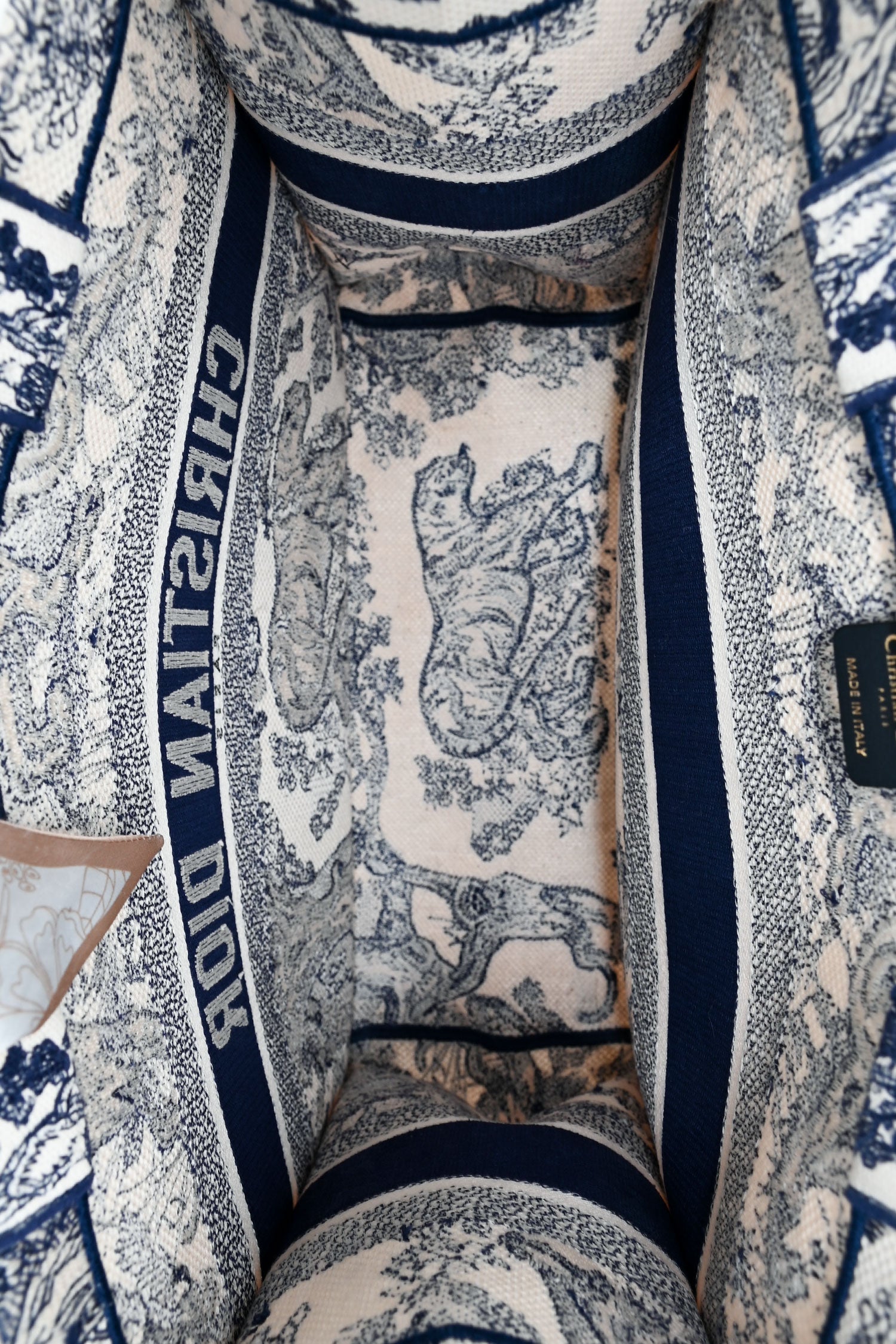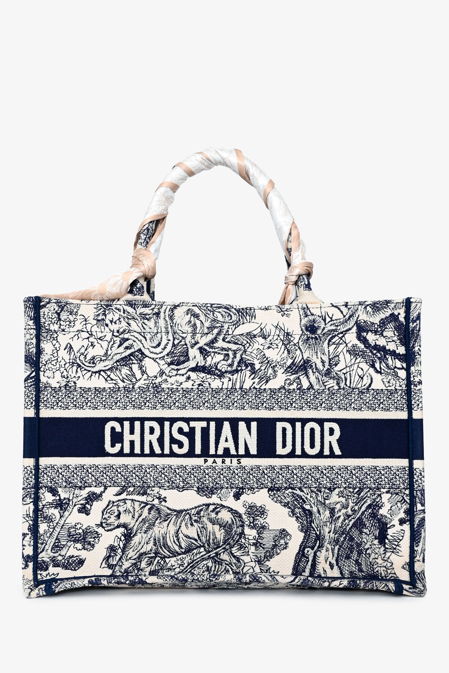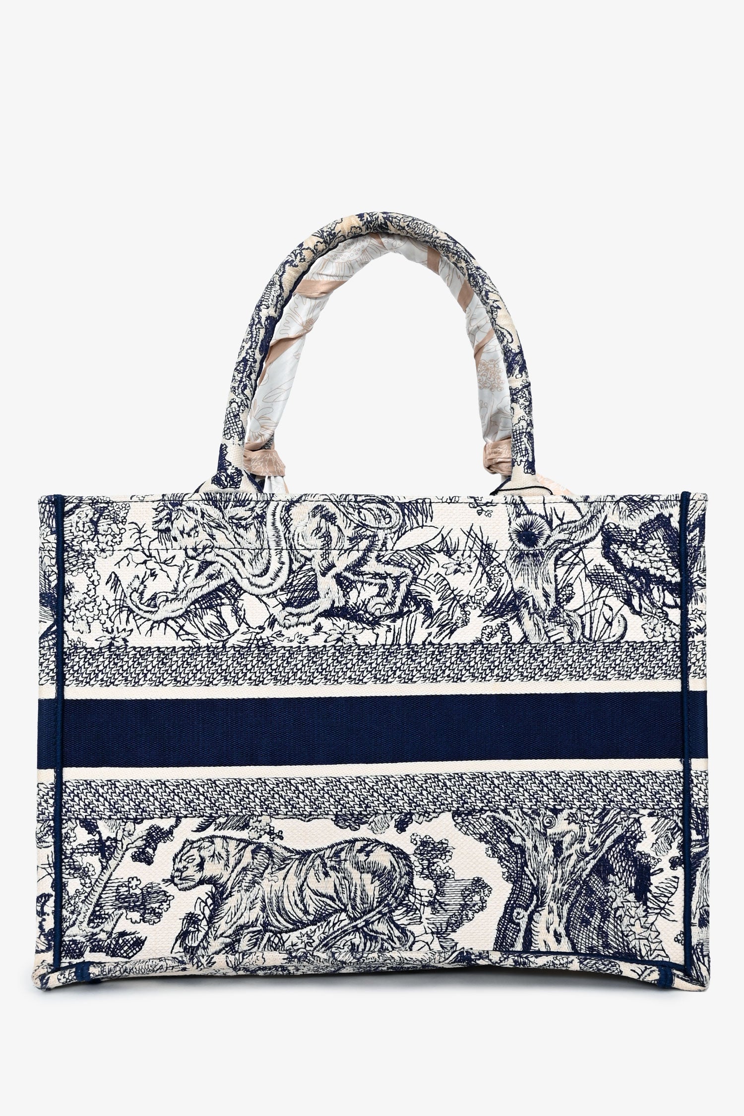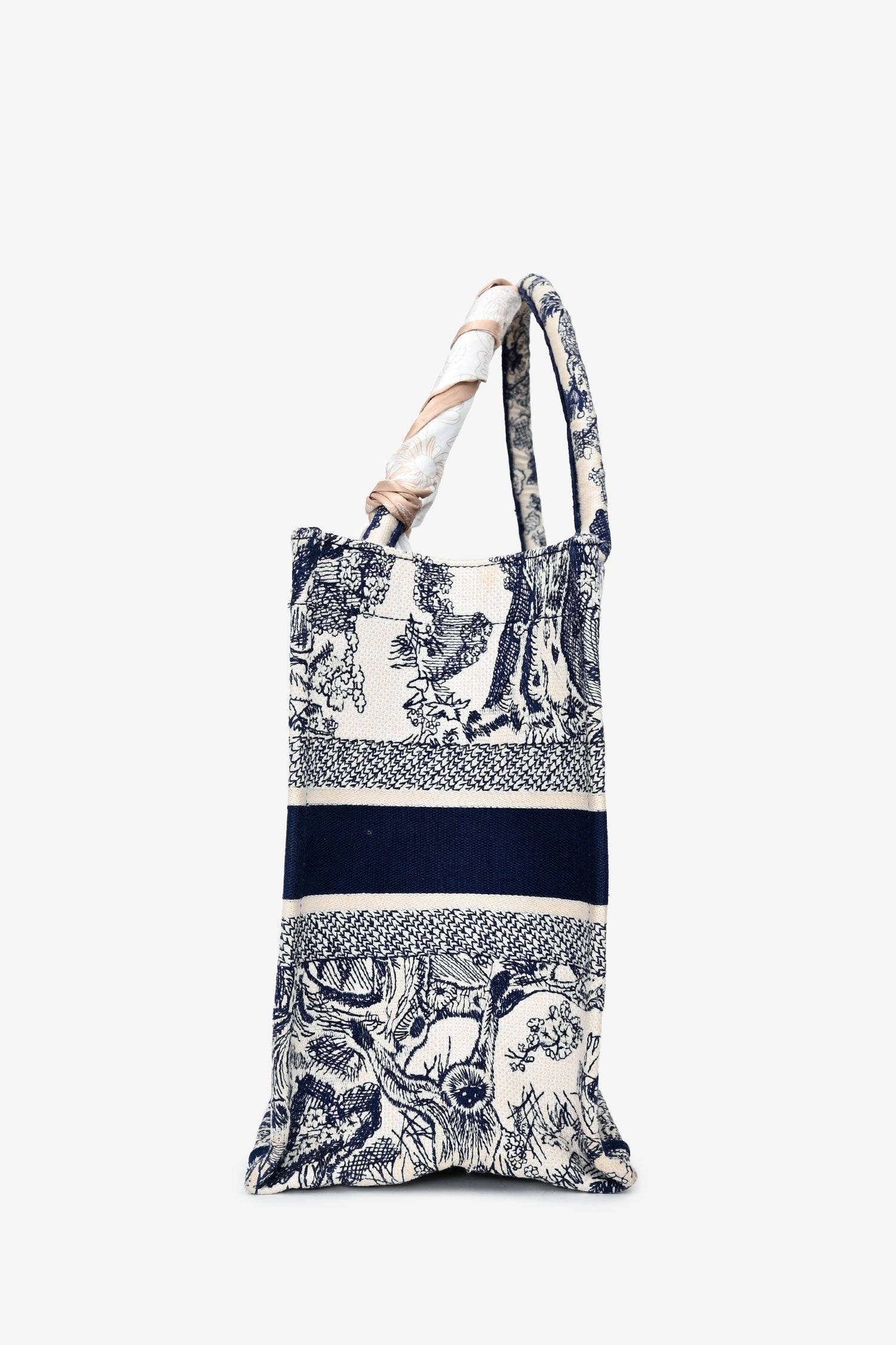 Christian Dior 2021 Navy/White Toile de Jouy Embroidered Medium Book Tote. Open top. Dual embroidered top handles. Non branded Twilly. Unlined interior. Tonal stitching.