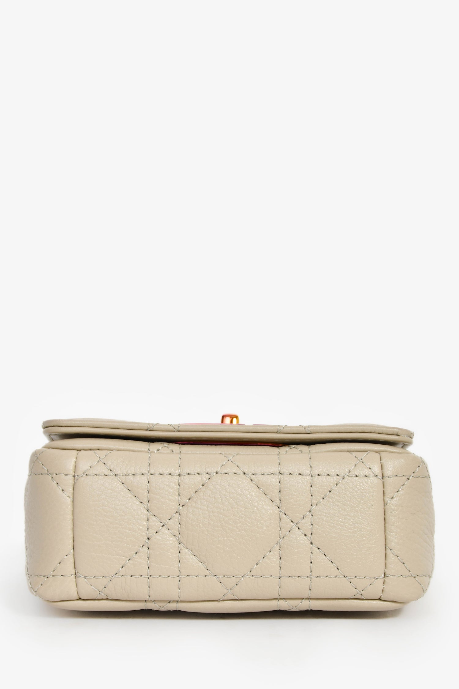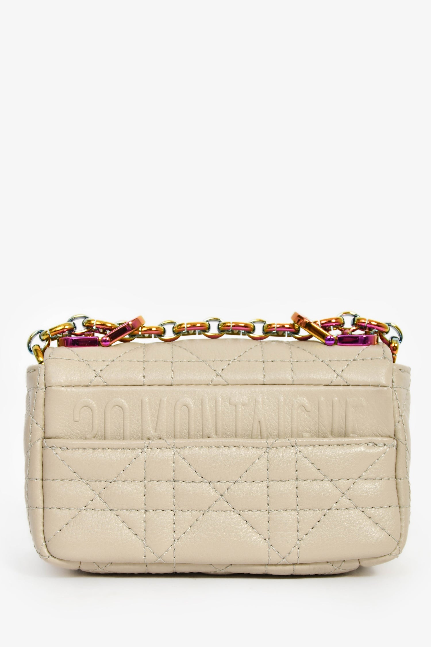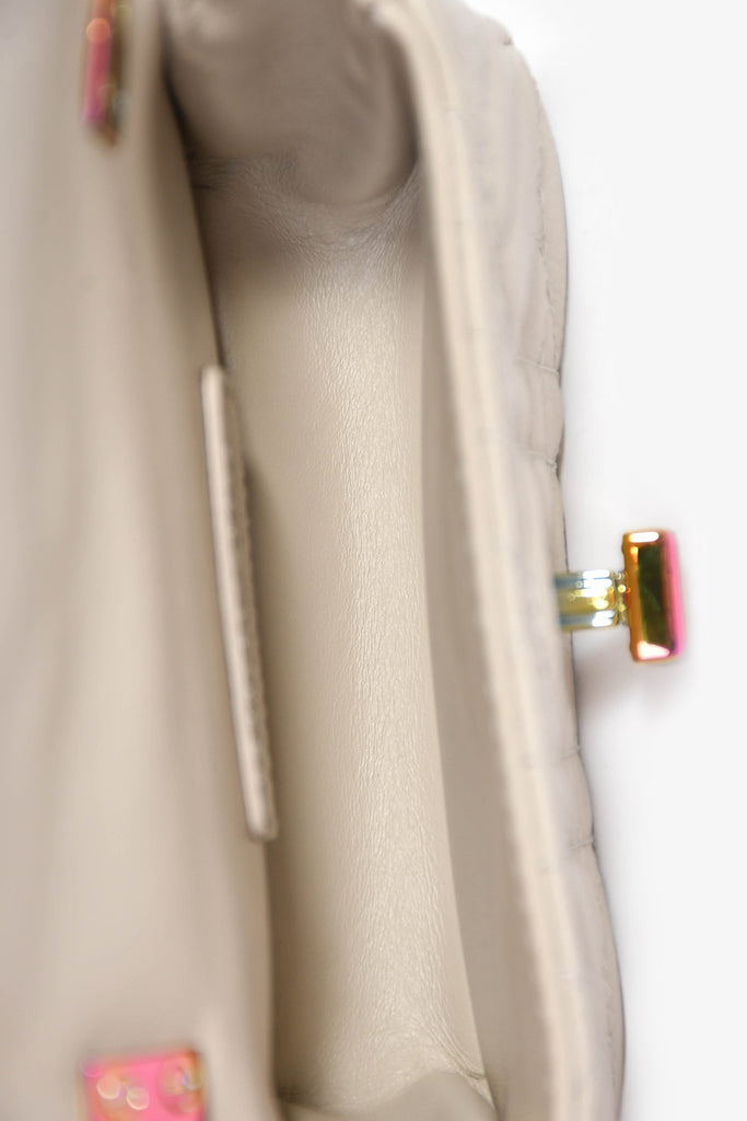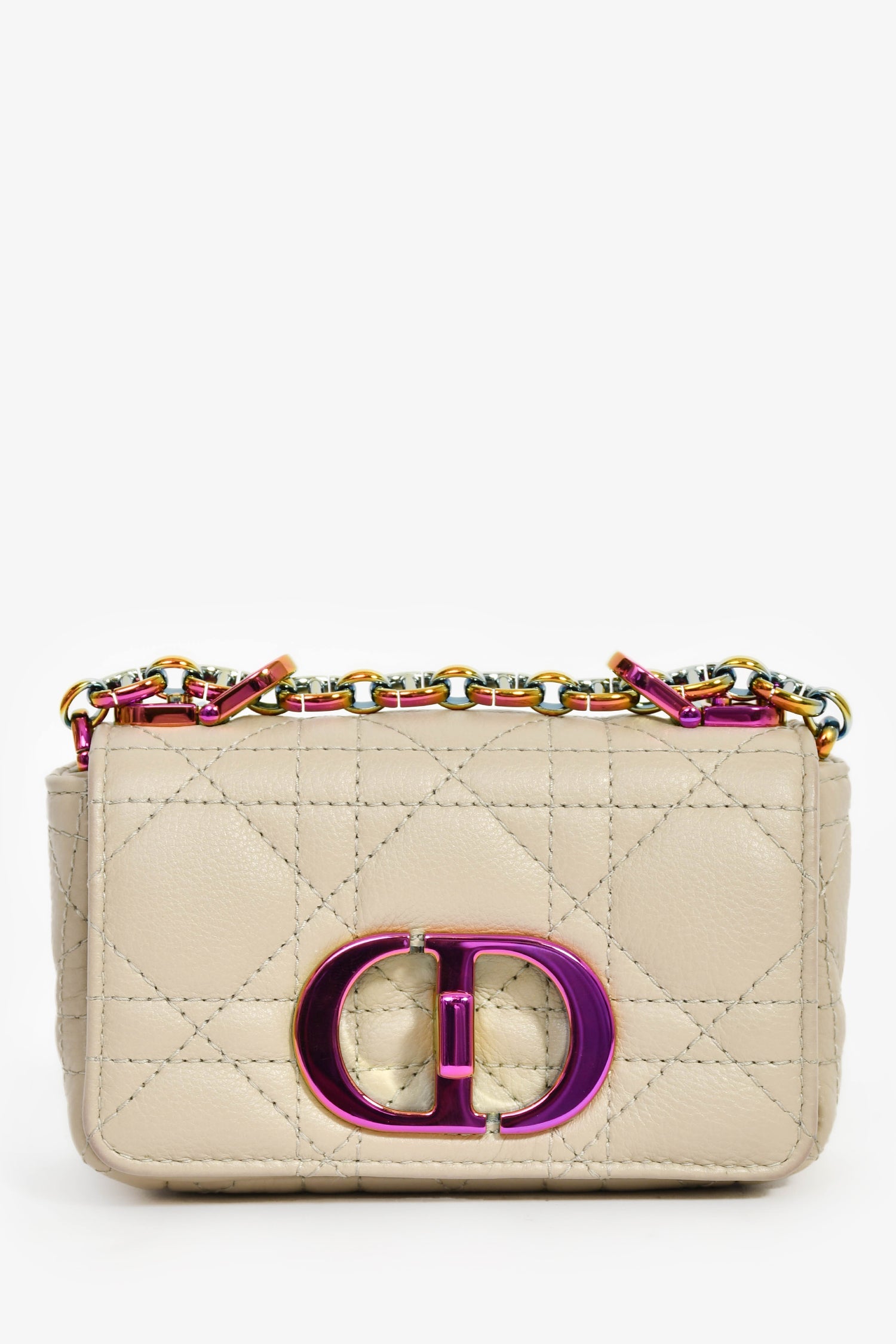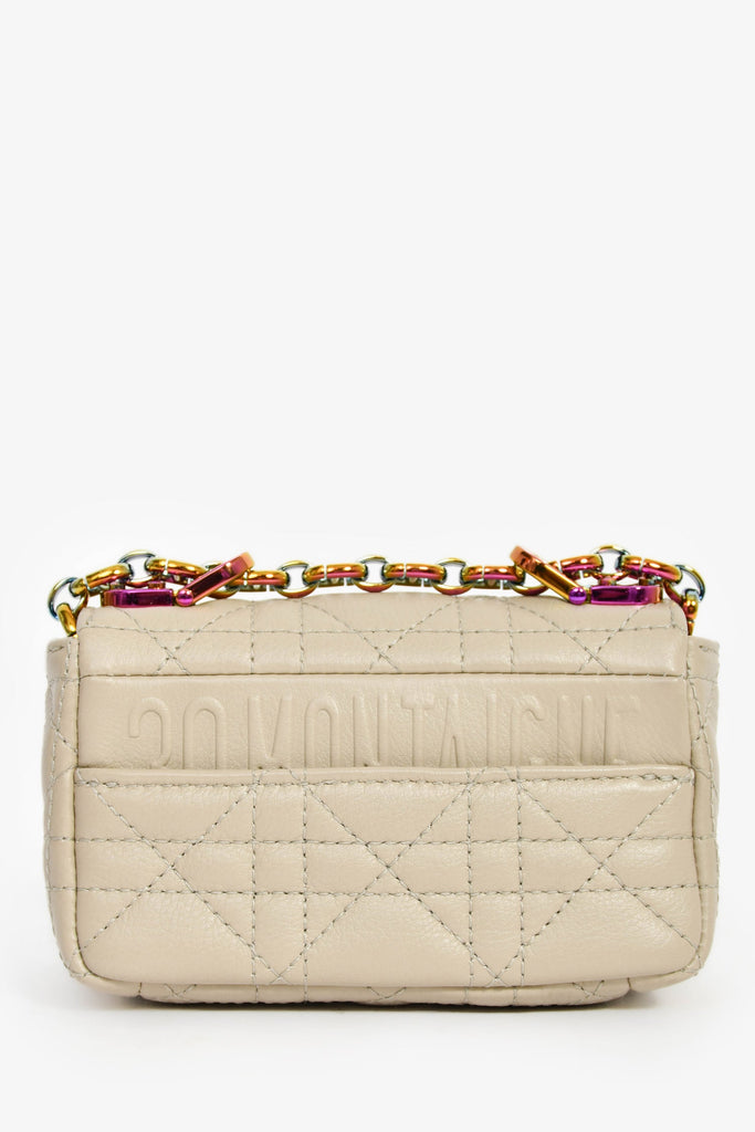 Christian Dior 2022 Grey Cannage Micro Caro Bag. Front fold-over flap with turn-lock closure. Slide-around and adjustable chain. Single interior compartment. Rear exterior slip pocket. Leather-lined interior. Chrome-tone hardware. Tonal stitching.