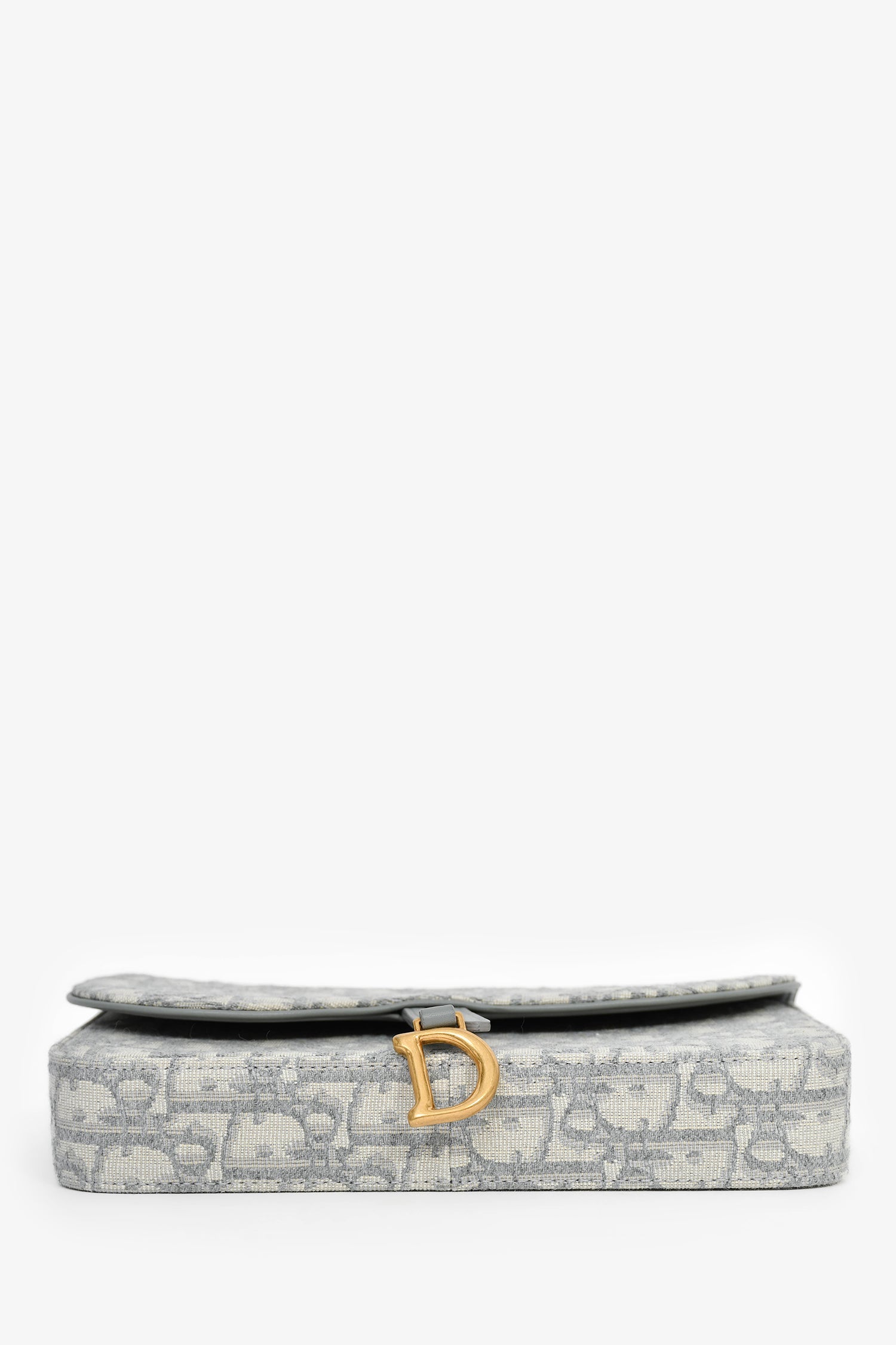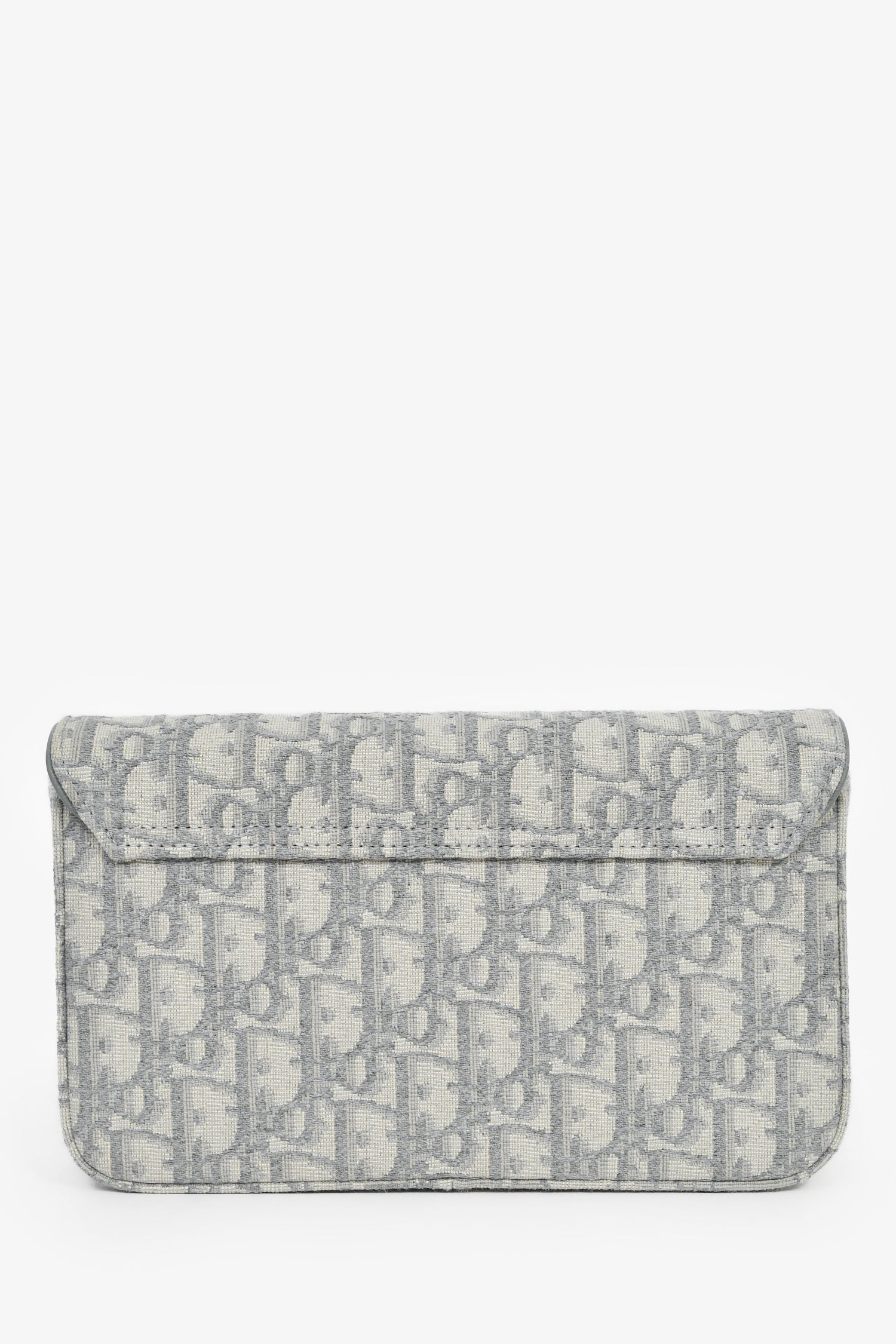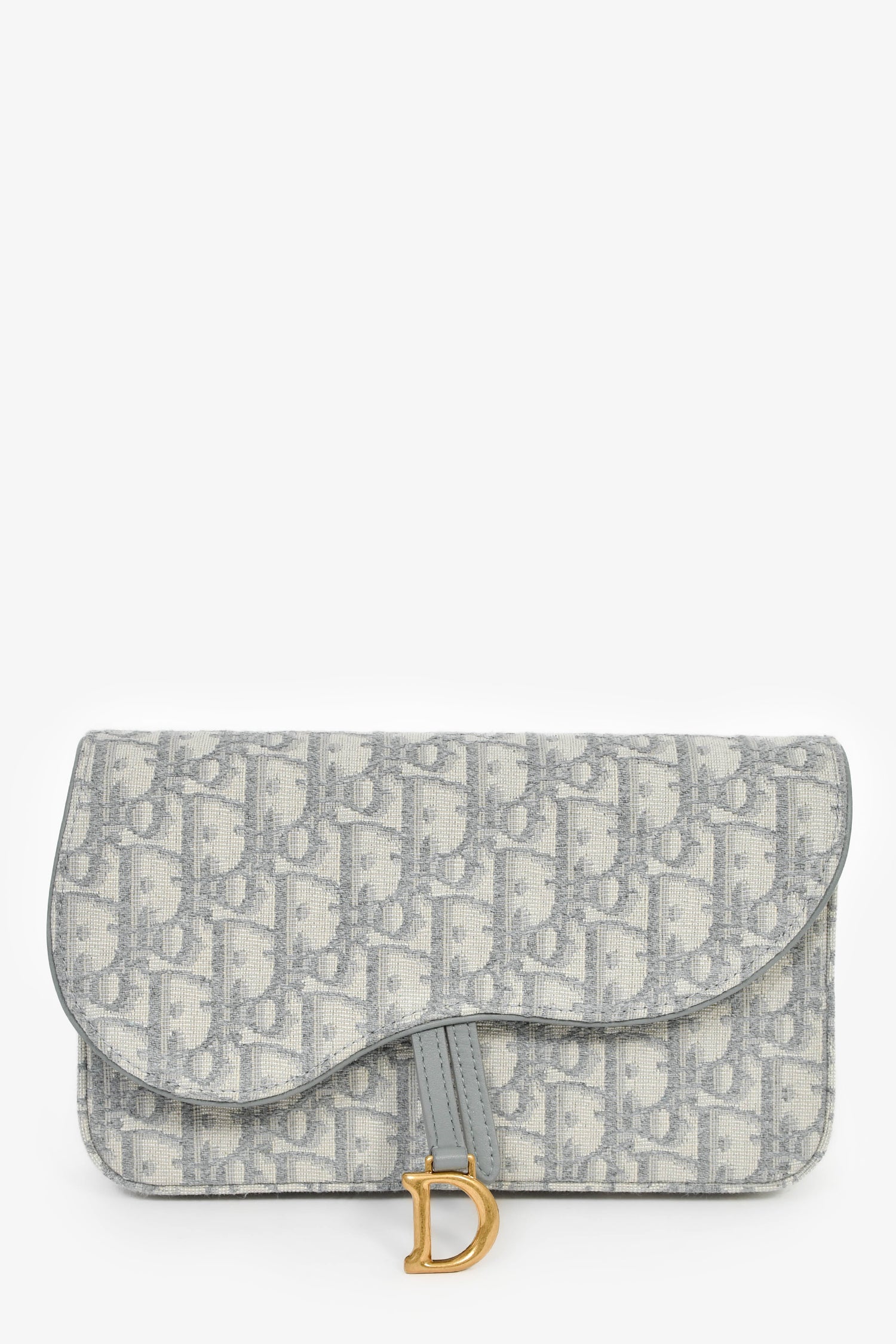 Christian Dior 2023 Grey Oblique Canvas Medium Saddle Pouch With Chain. Front fold-over flap with magnetic button closure. Textile-lined interior. Built-in chain strap. 2 wall compartments; 1 slip, 1 with zip closure. 6 card slots. Gold-tone hardware. Tonal stitching.