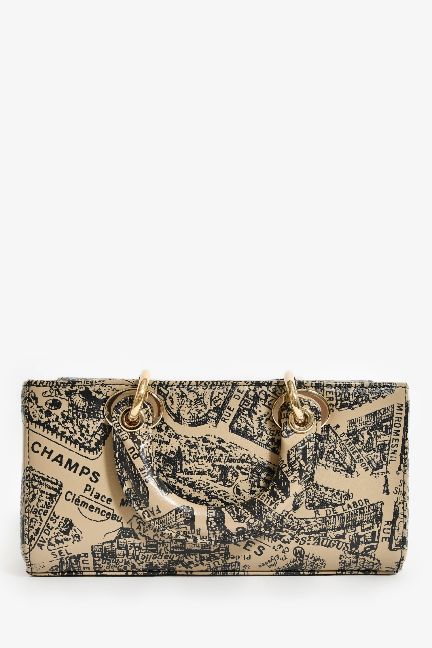 Christian Dior 2023 Taupe Leather 'Plan de Paris' Small Lady D-Joy Bag. Dual top handles. Top fold-over flap with magnetic closure. Single interior compartment with a wall slip pocket. Detachable and adjustable crossbody strap. Suede-lined interior. Gold-tone hardware. Tonal stitching.
