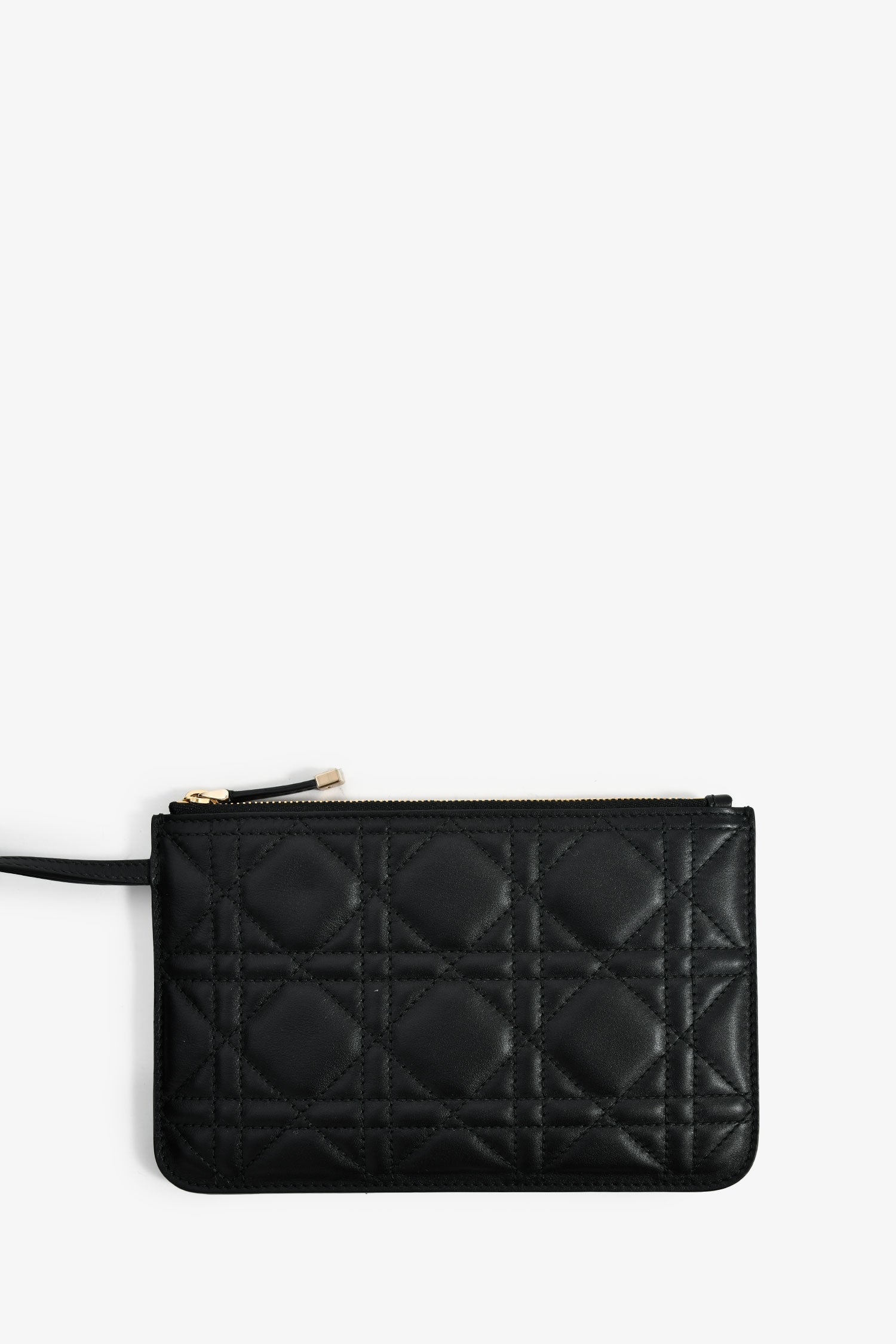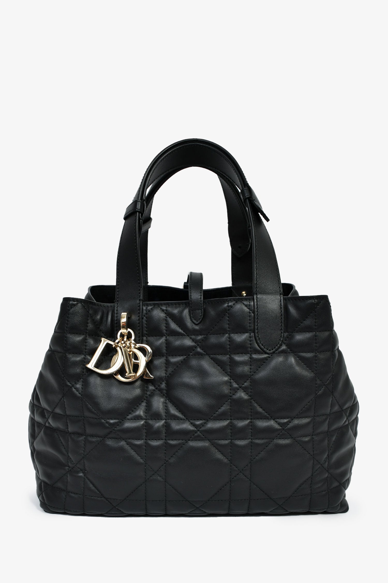 Christian Dior 2024 Black Cannage Lambskin Leather Medium 'Toujours' Bag. Top fold-over strap and interior latch closure. Dual handles. Suede-lined interior. Detachable interior zip pouch. "DIOR" charms on the handle. Gold-tone hardware. Tonal stitching.