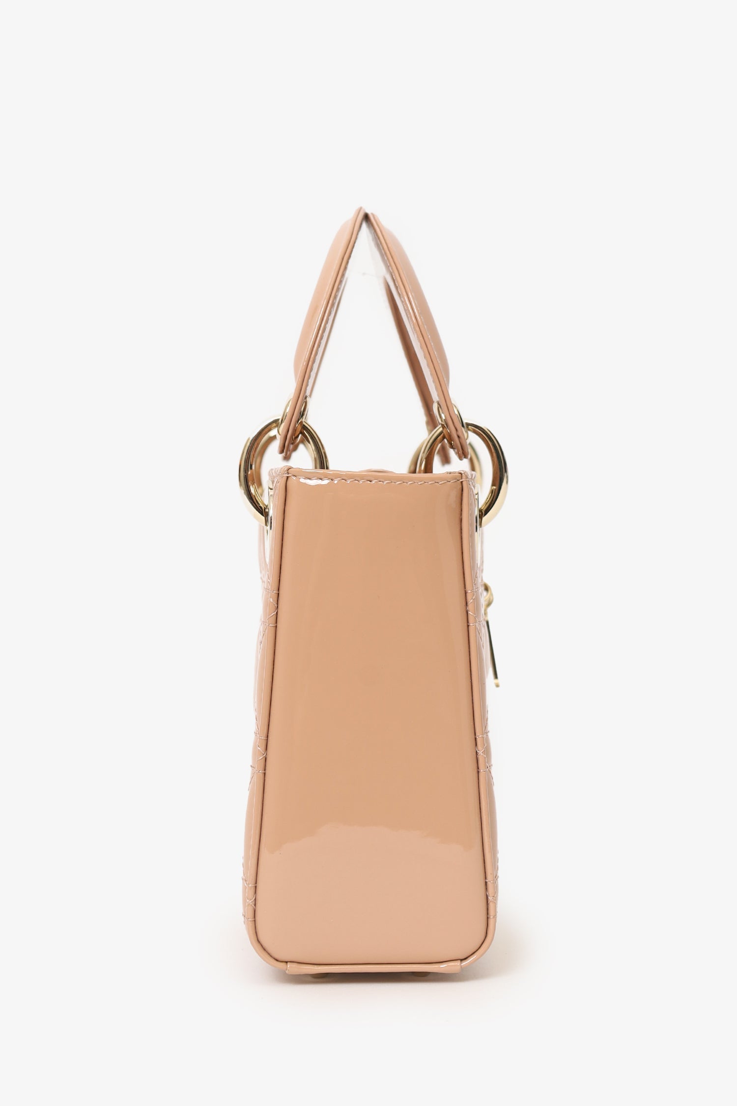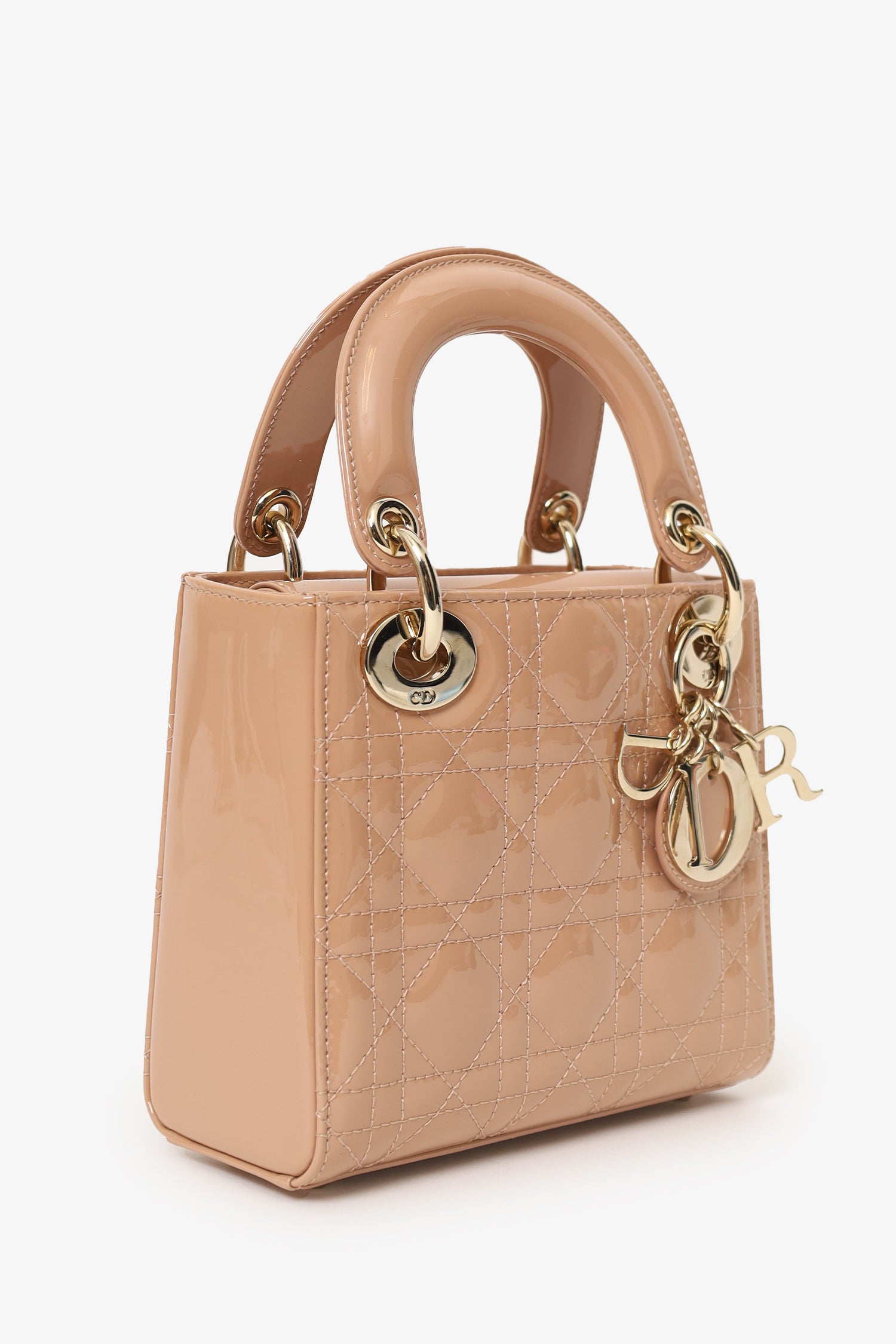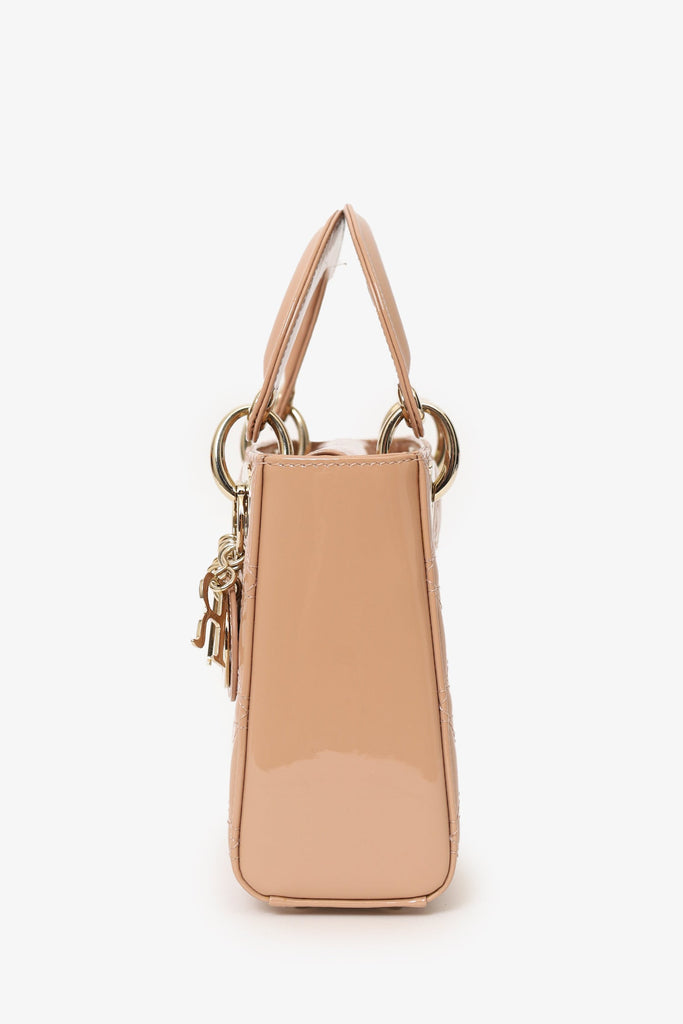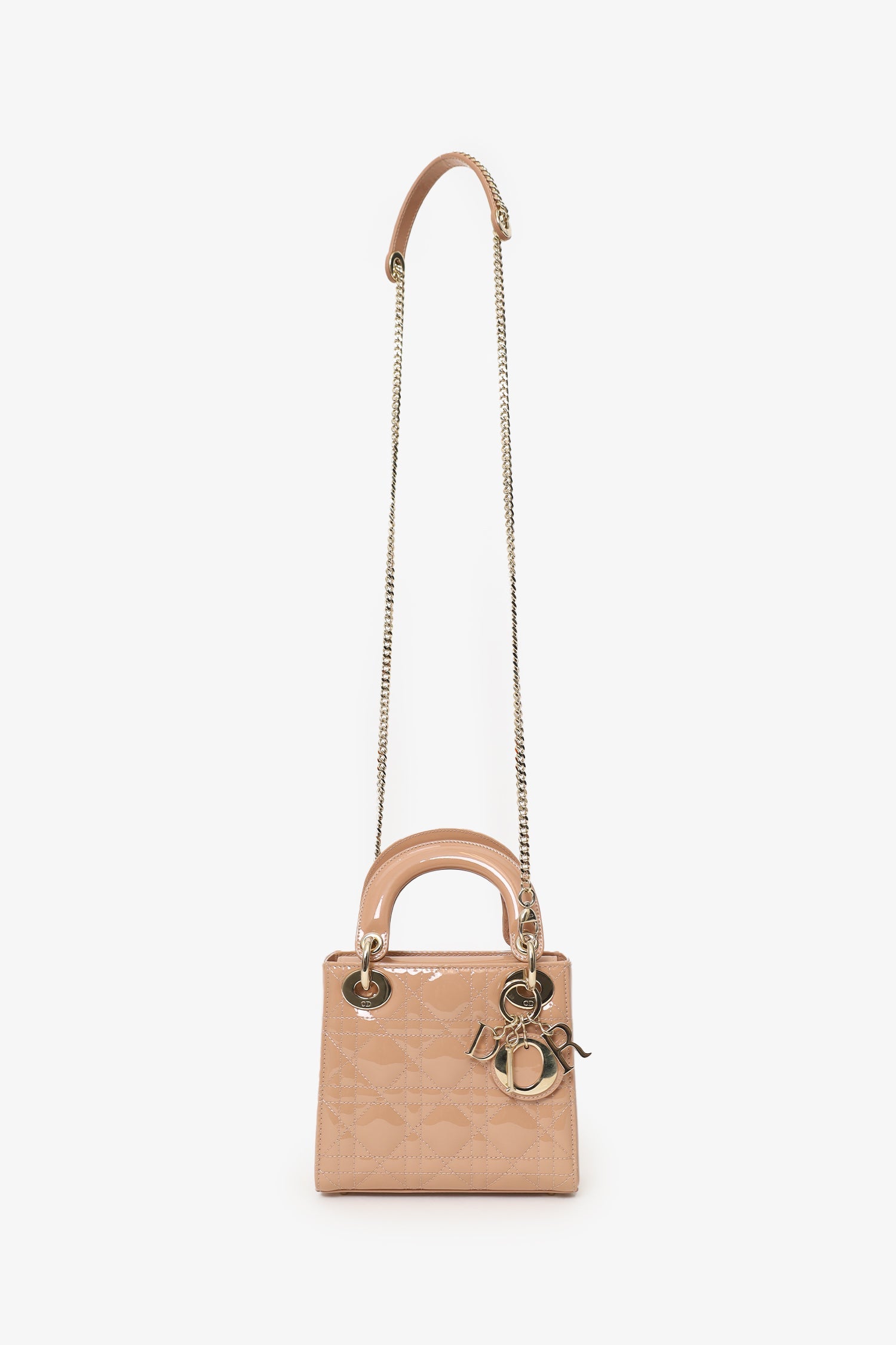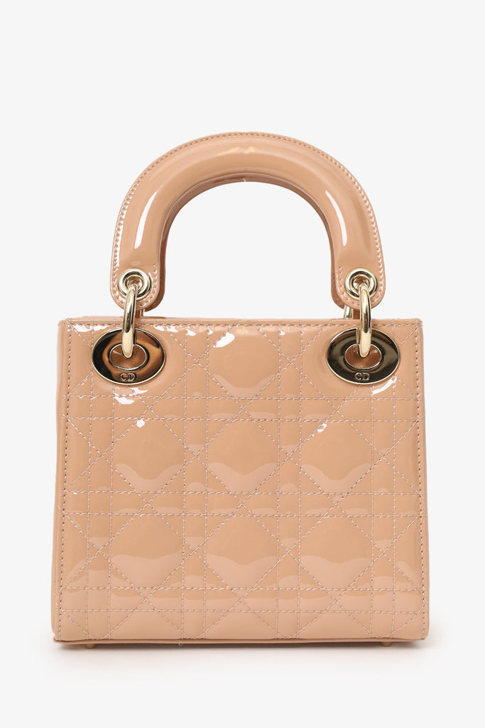 Christian Dior Beige Cannage Patent Leather Mini Lady Dior With Strap. Top interior fold-over flap. Twin top handles. Removable crossbody chainlink strap. Suede-lined interior. Single interior zip pocket. Protective studs at the bottom. Gold-tone hardware. Tonal stitching.