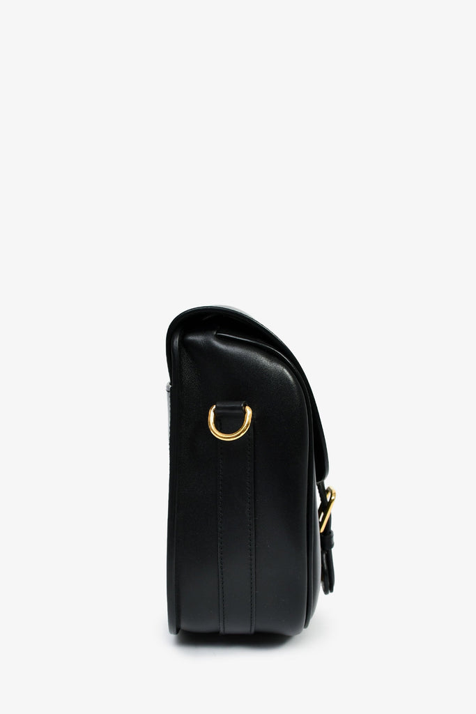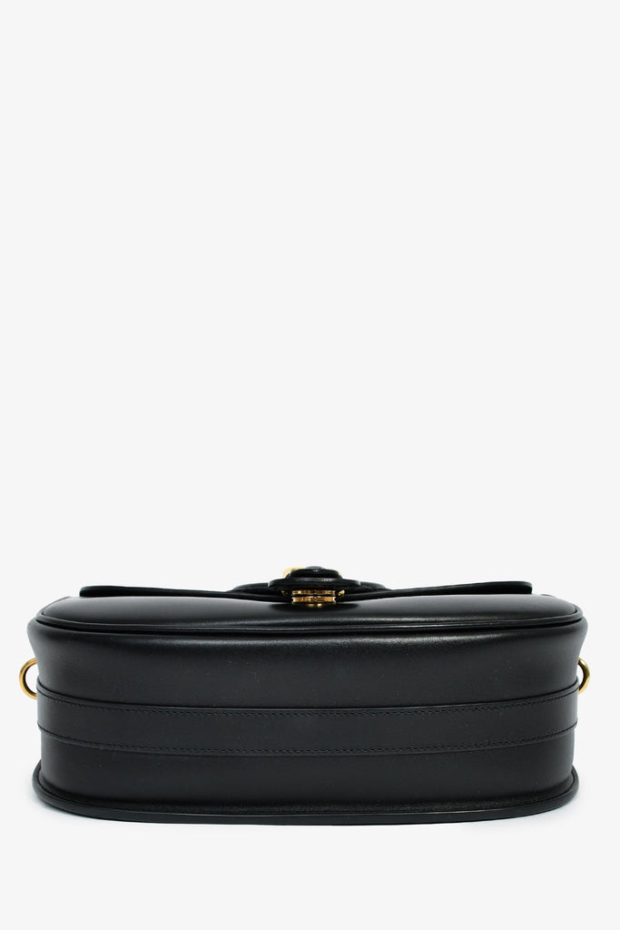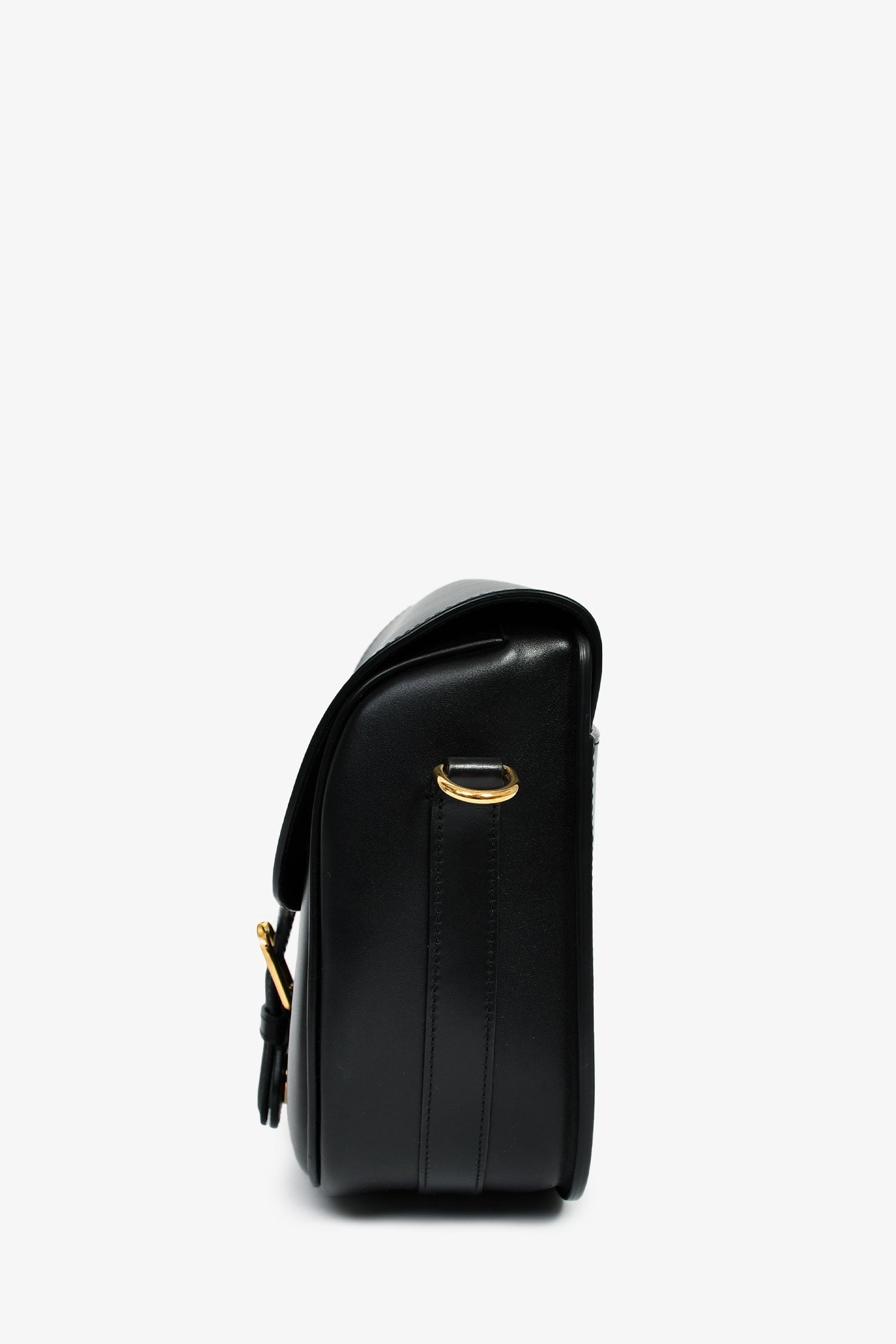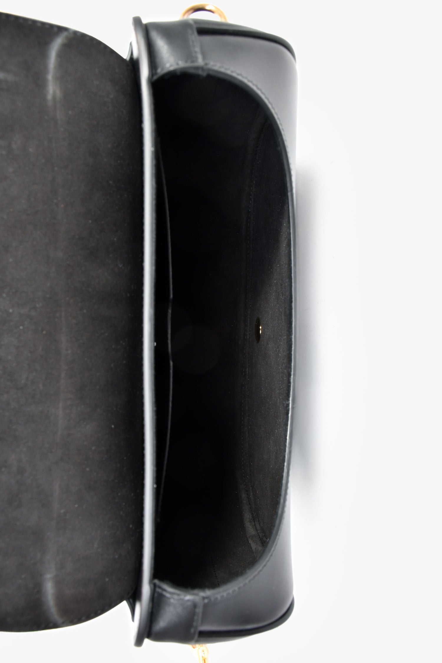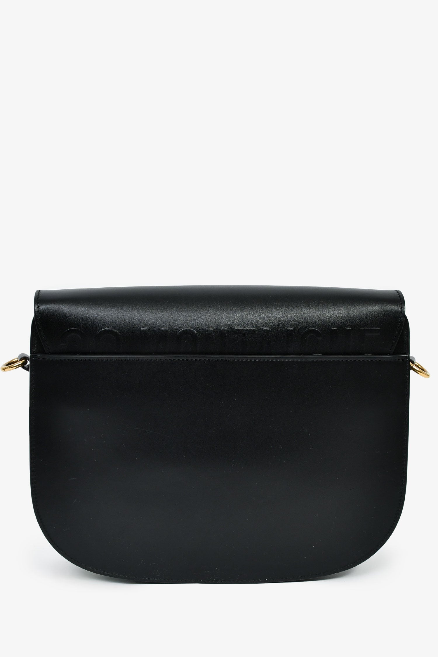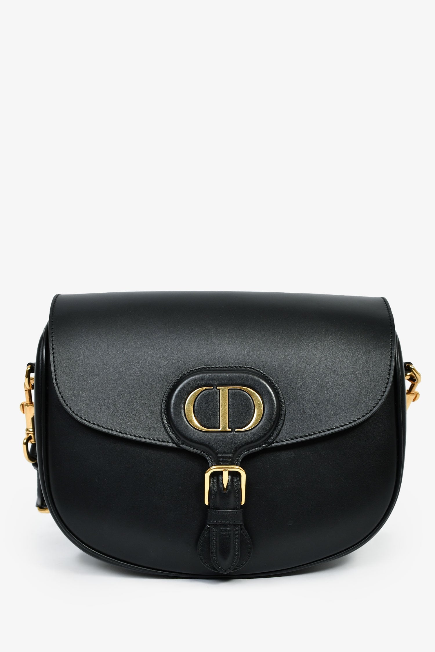 Christian Dior Black Leather Large Bobby Oblique Canvas Strap Crossbody Bag. Front fold-over flap with magnetic button closure. Detachable and adjustable crossbody strap. Suede-lined interior. 2 slip pockets;  1 at the interior, 1 at the rear exterior. Gold-tone hardware. Tonal stitching.