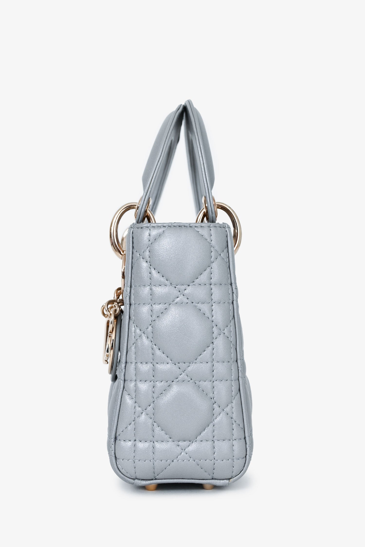 Christian Dior Grey Shimmer Leather Cannage Mini Lady Dior with Strap. Quilted cannage stitching. Dual top handles. Detachable leather and chain shoulder strap. Gold-tone hardware with charms. Top flap closure. Fabric interior with zipped pocket. Tonal stitching.