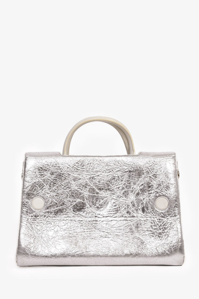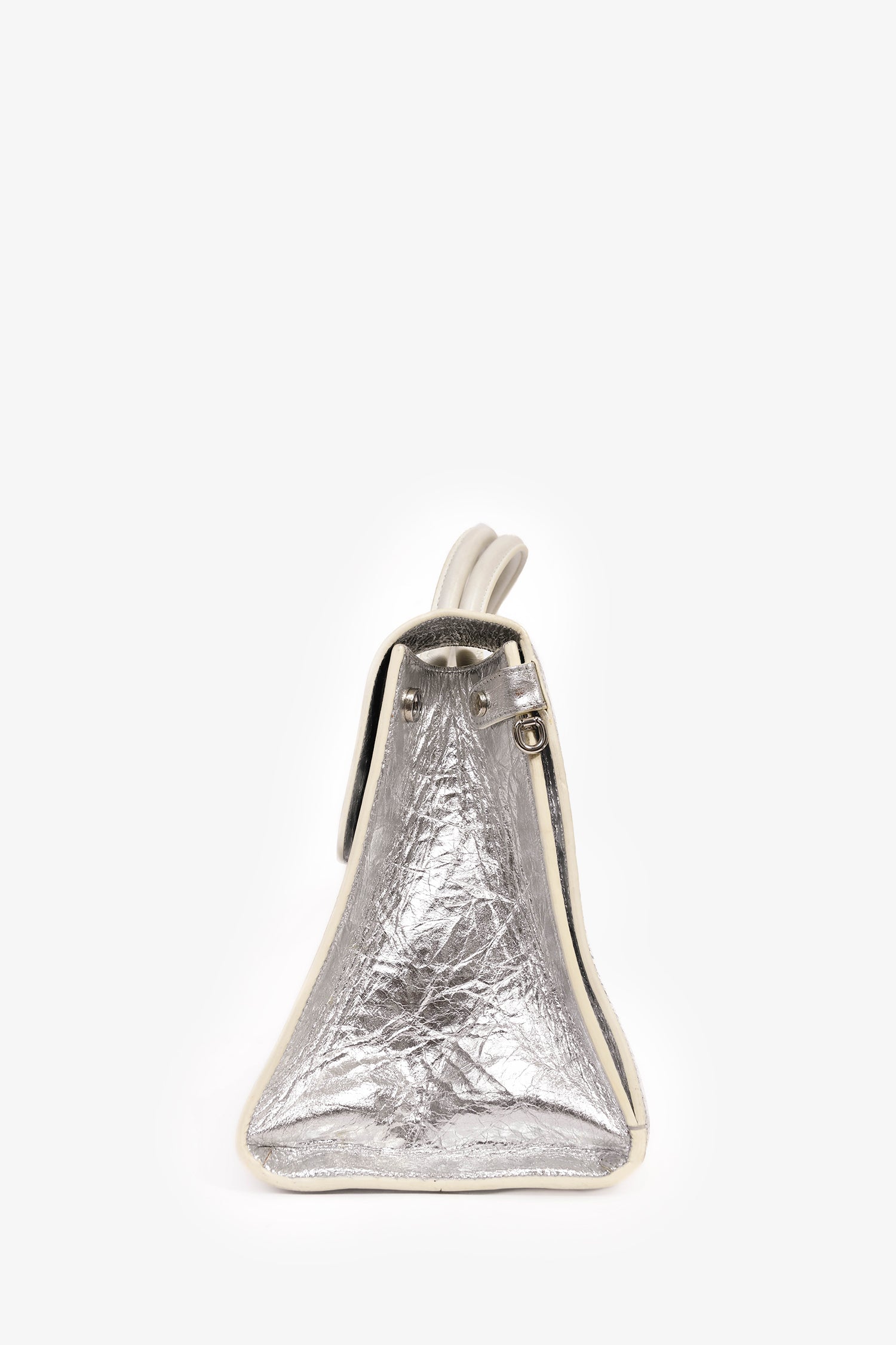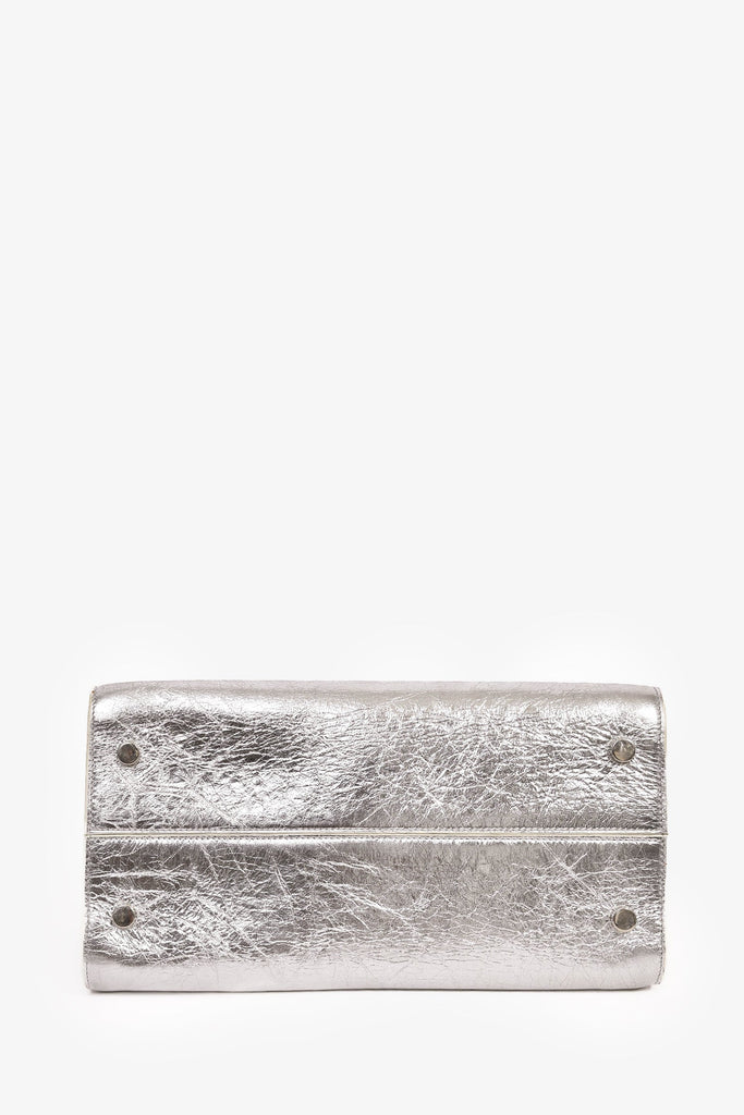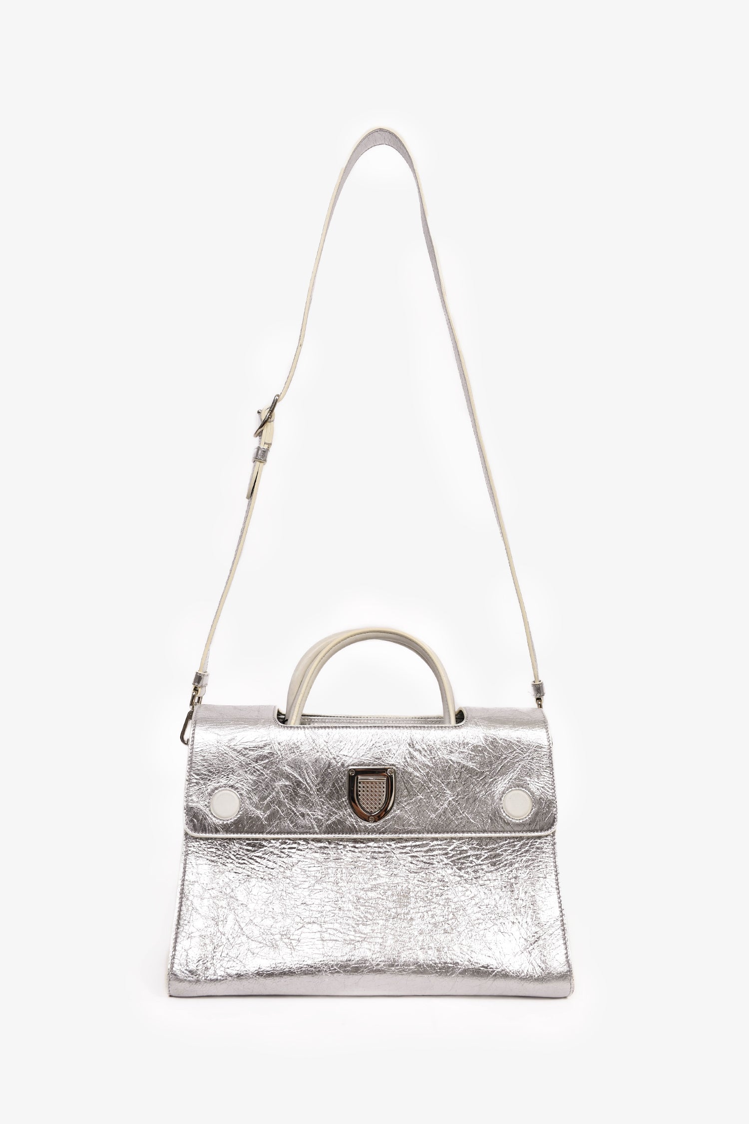 Christian Dior Silver Crinkle Leather 'Diorever' Medium Top Handle. Rolled leather top handles. Silver-tone hardware. Fold-over flap. Magnetic closures. Single fold-under flap. 3 interior pockets. Detachable strap. Tonal stitching.