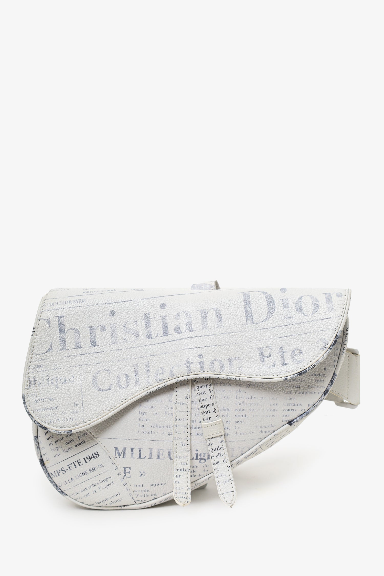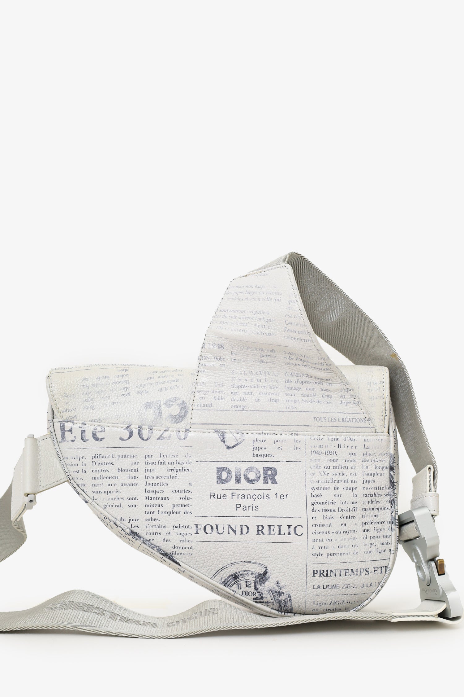 Christian Dior x Daniel Arsham 2019 White/Grey Newspaper Printed Saddle Bag. Front fold-over flap with magnetic snap-button closure. Top zip closure. Adjustable shoulder strap with rollercoaster buckle. Open lined interior. Silver-tone hardware. Tonal stitching.