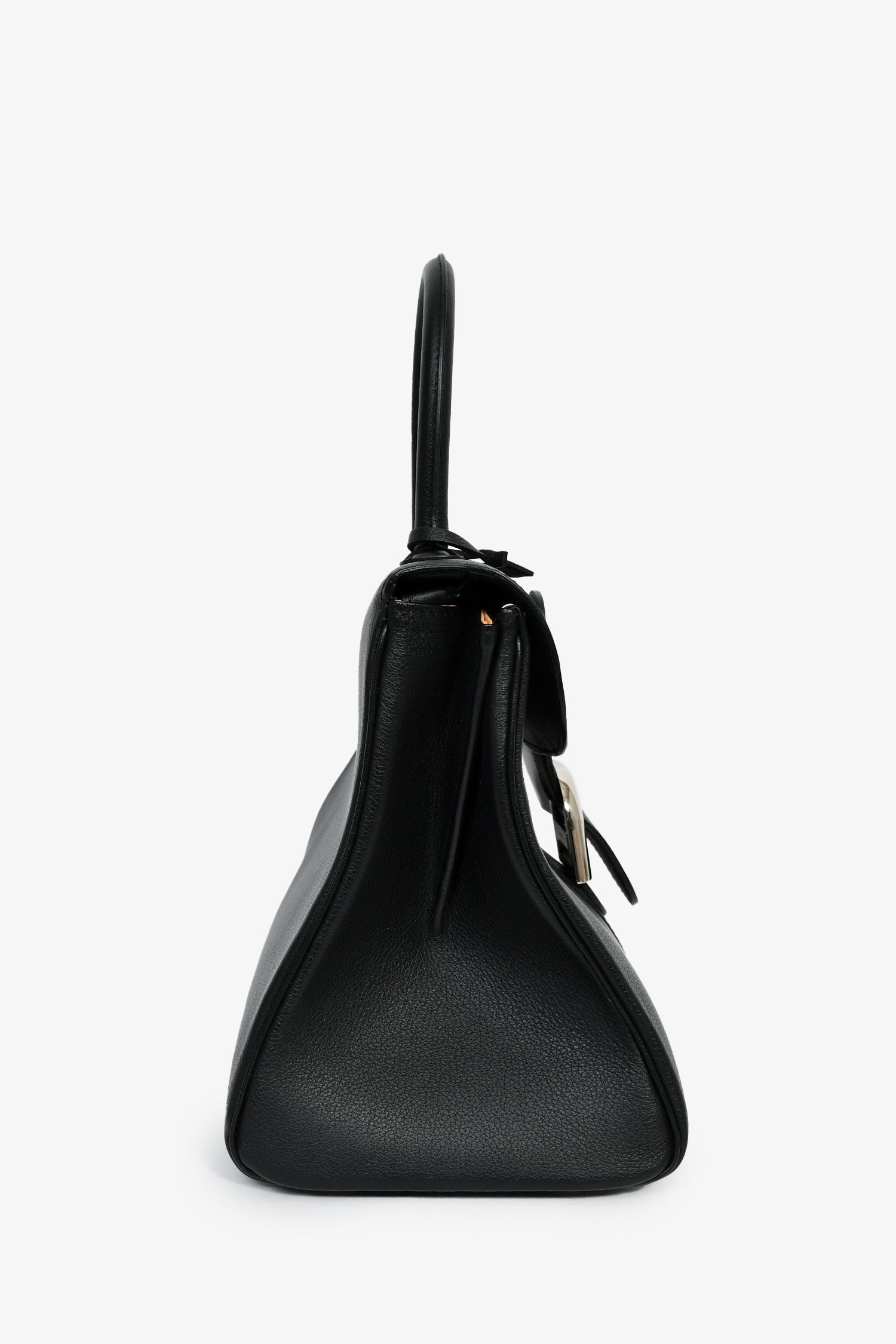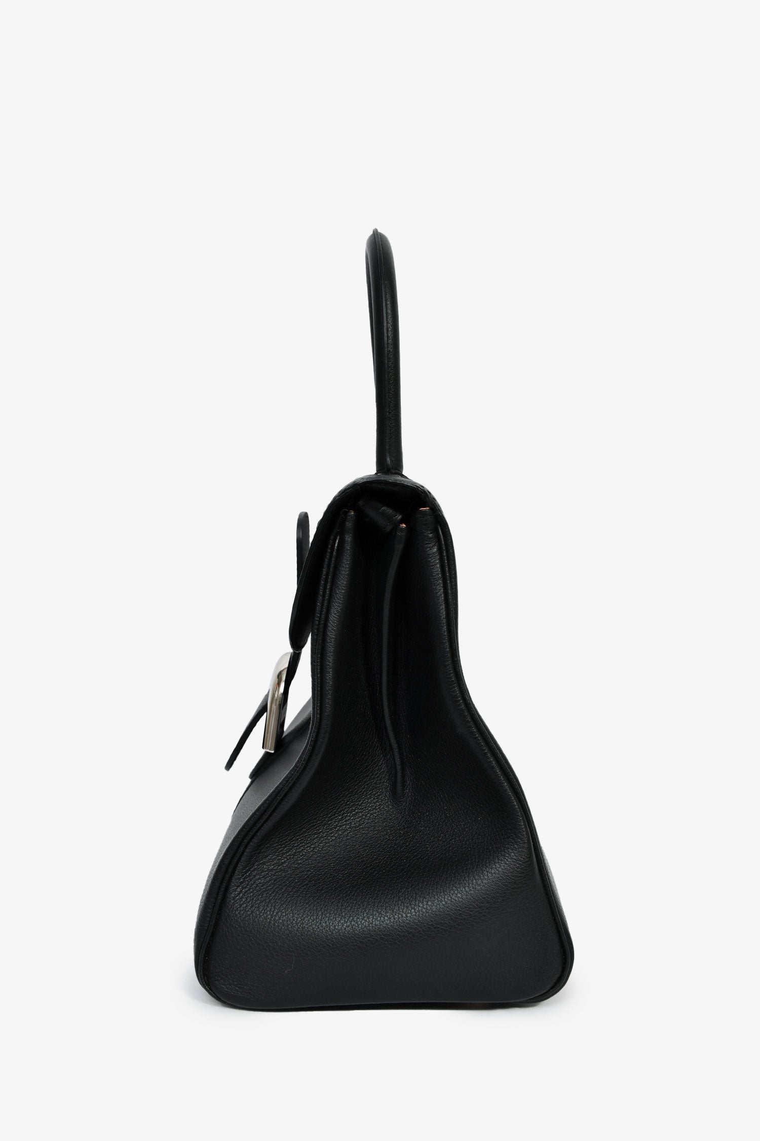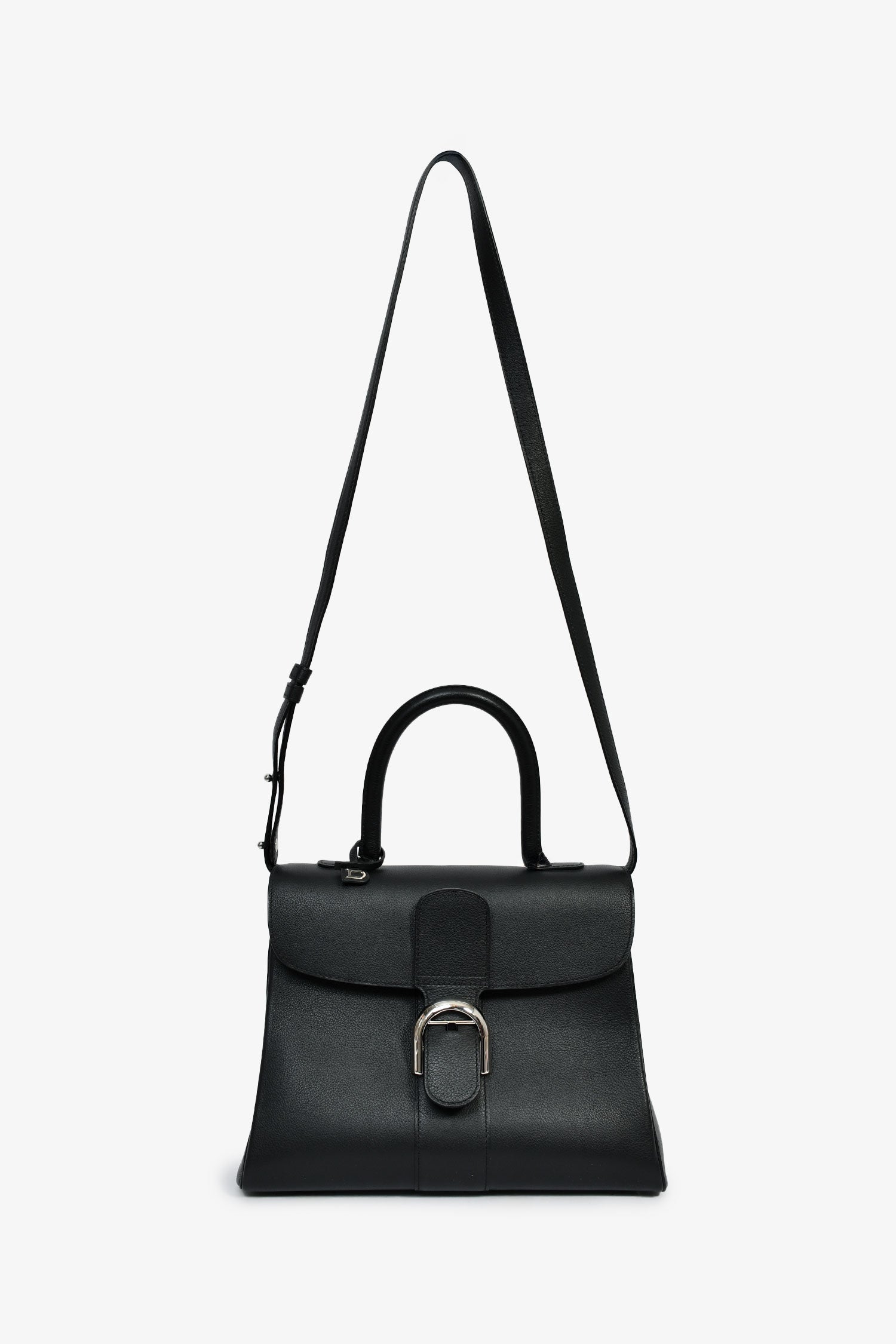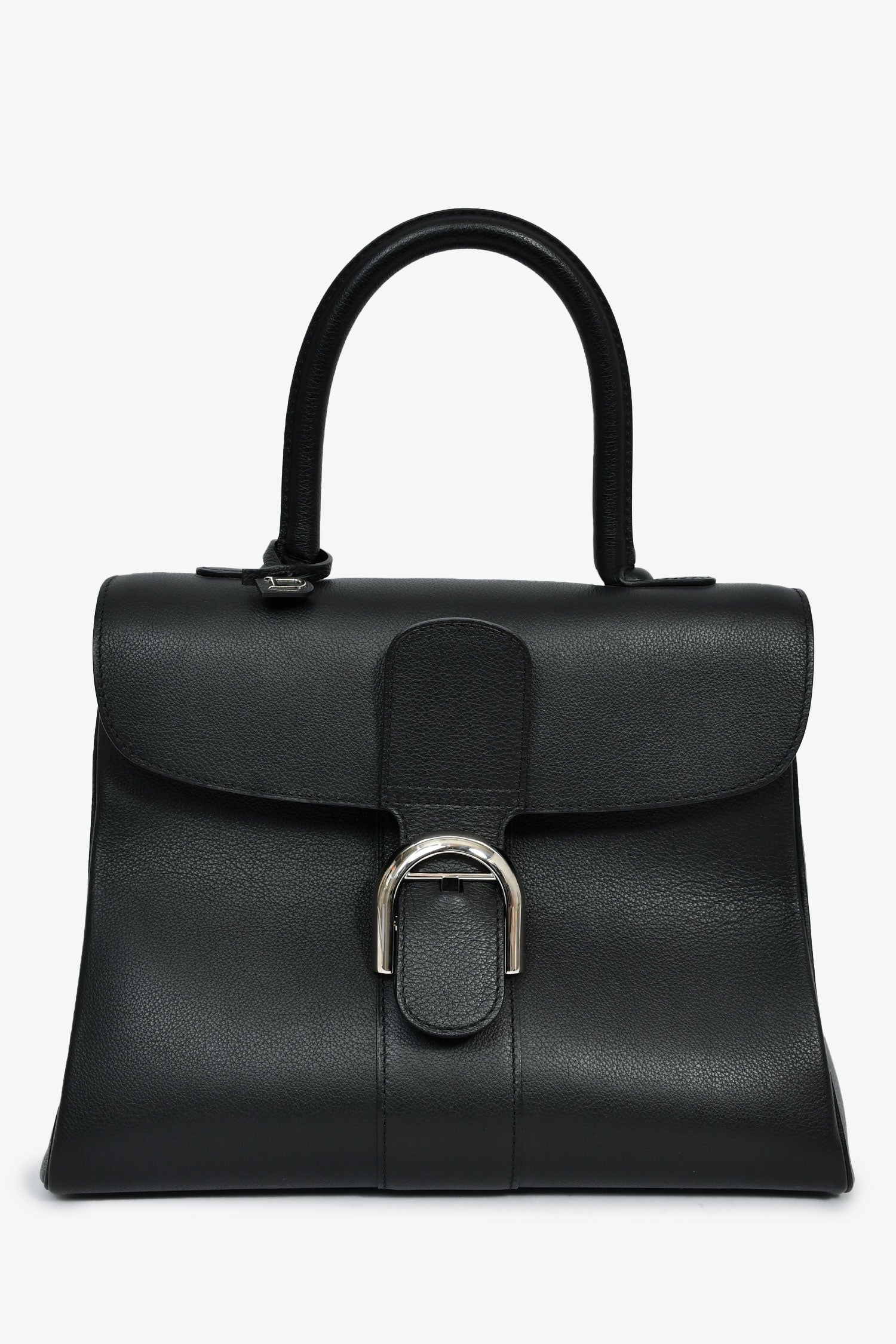 Delvaux Black Leather Brillant MM Top Handle Bag. Fold-over flap with a buckle closures. Single top handle and shoulder strap. 1 zip and 1 slip compartment. Silver-tone hardware. Tonal stitching.