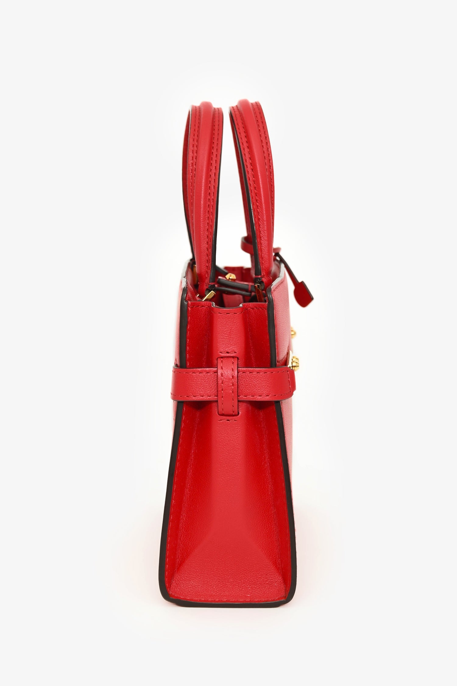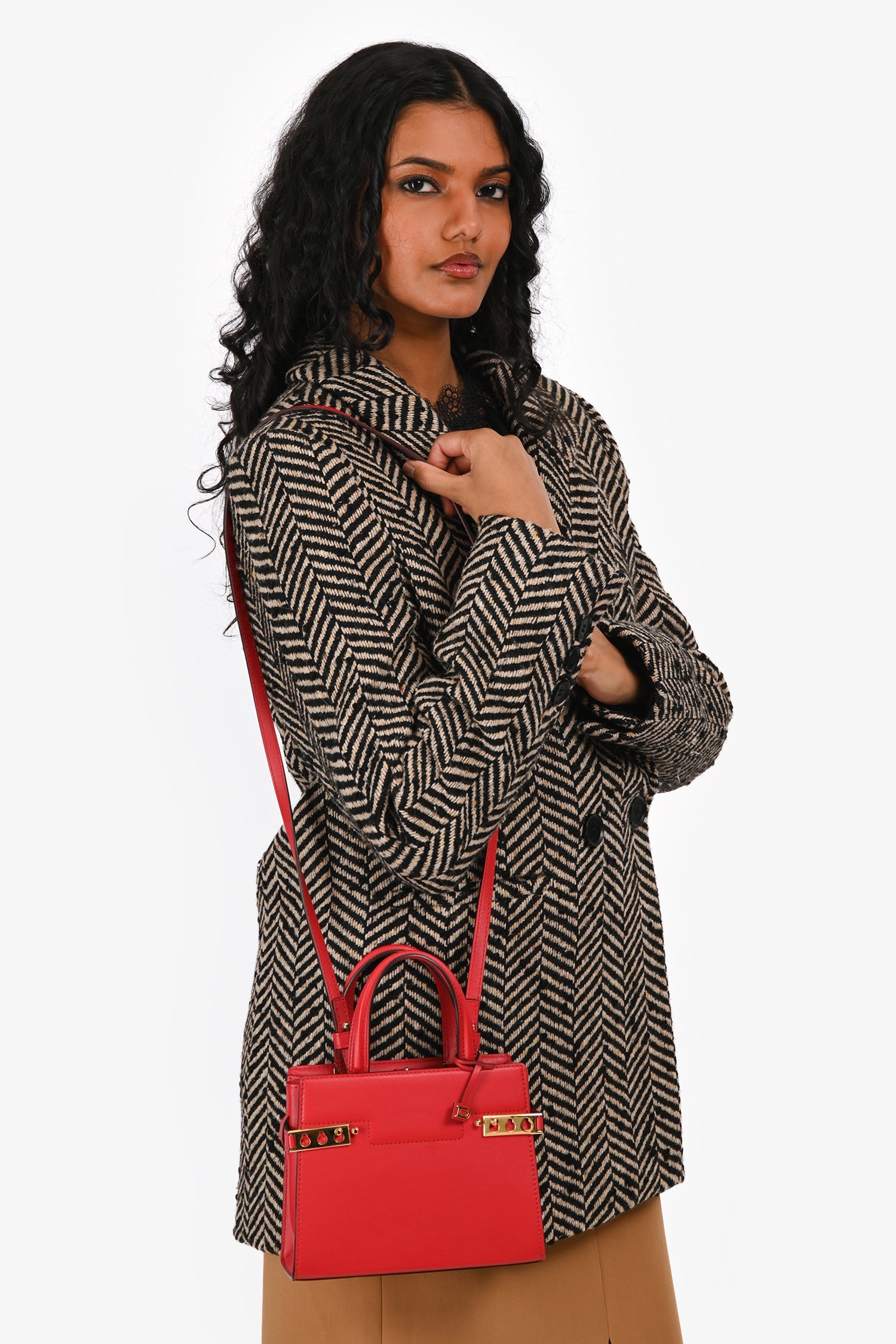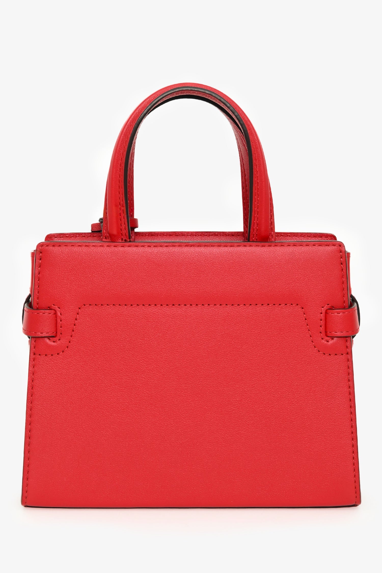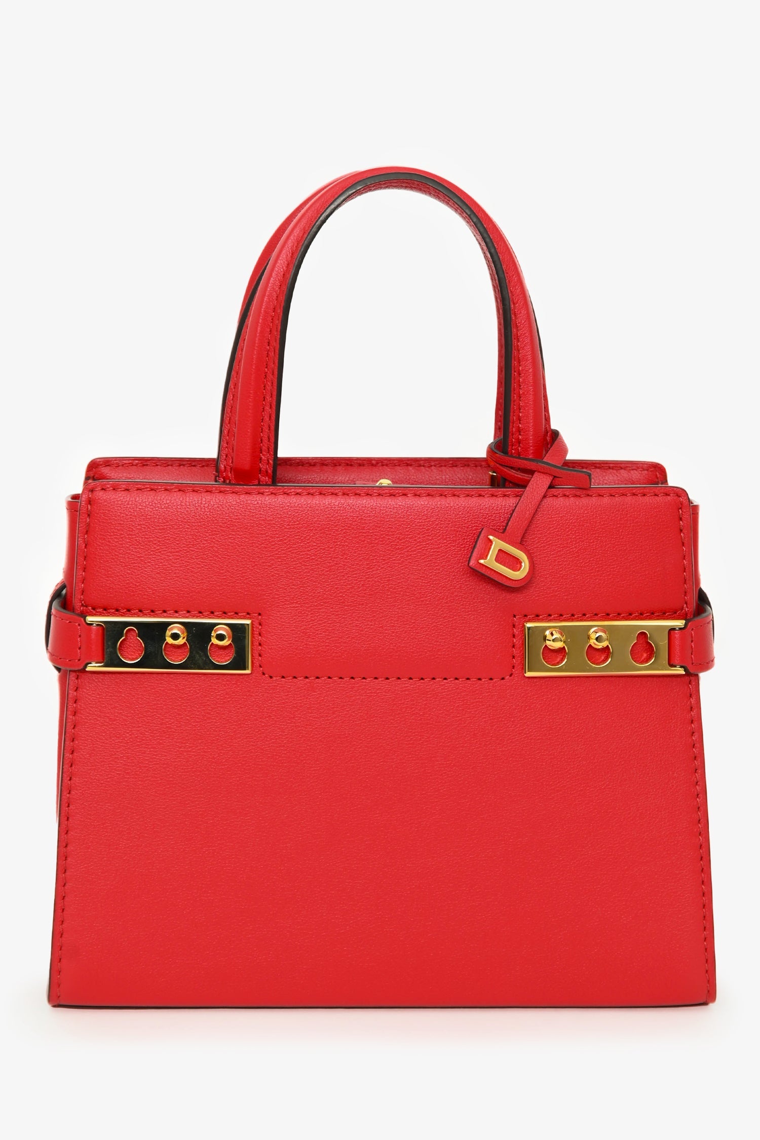 Delvaux Red Leather Tempete Crush PM Top Handle. Top concealed closure. Flat top handles and crossbody strap. Side pull tabs. Leather lined interior with a card slot. Gold-tone hardware. Tonal stitching.