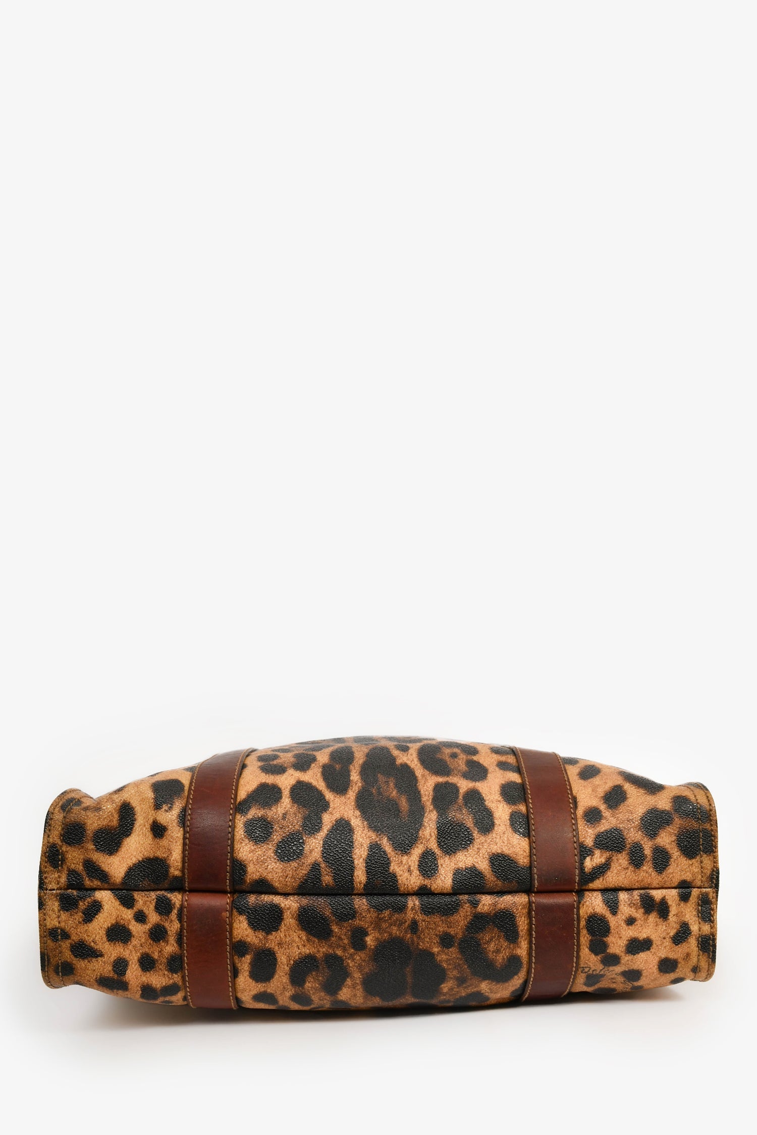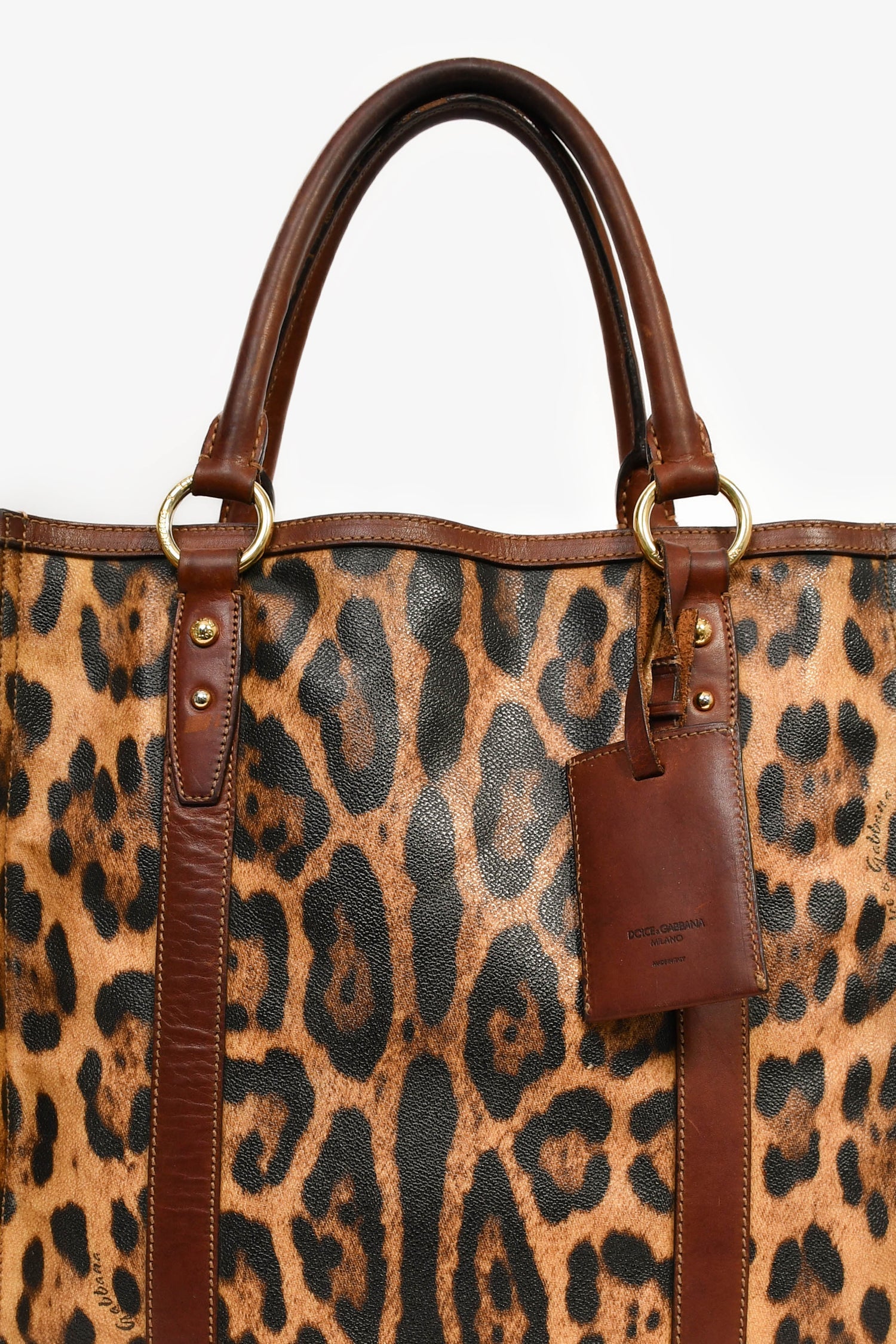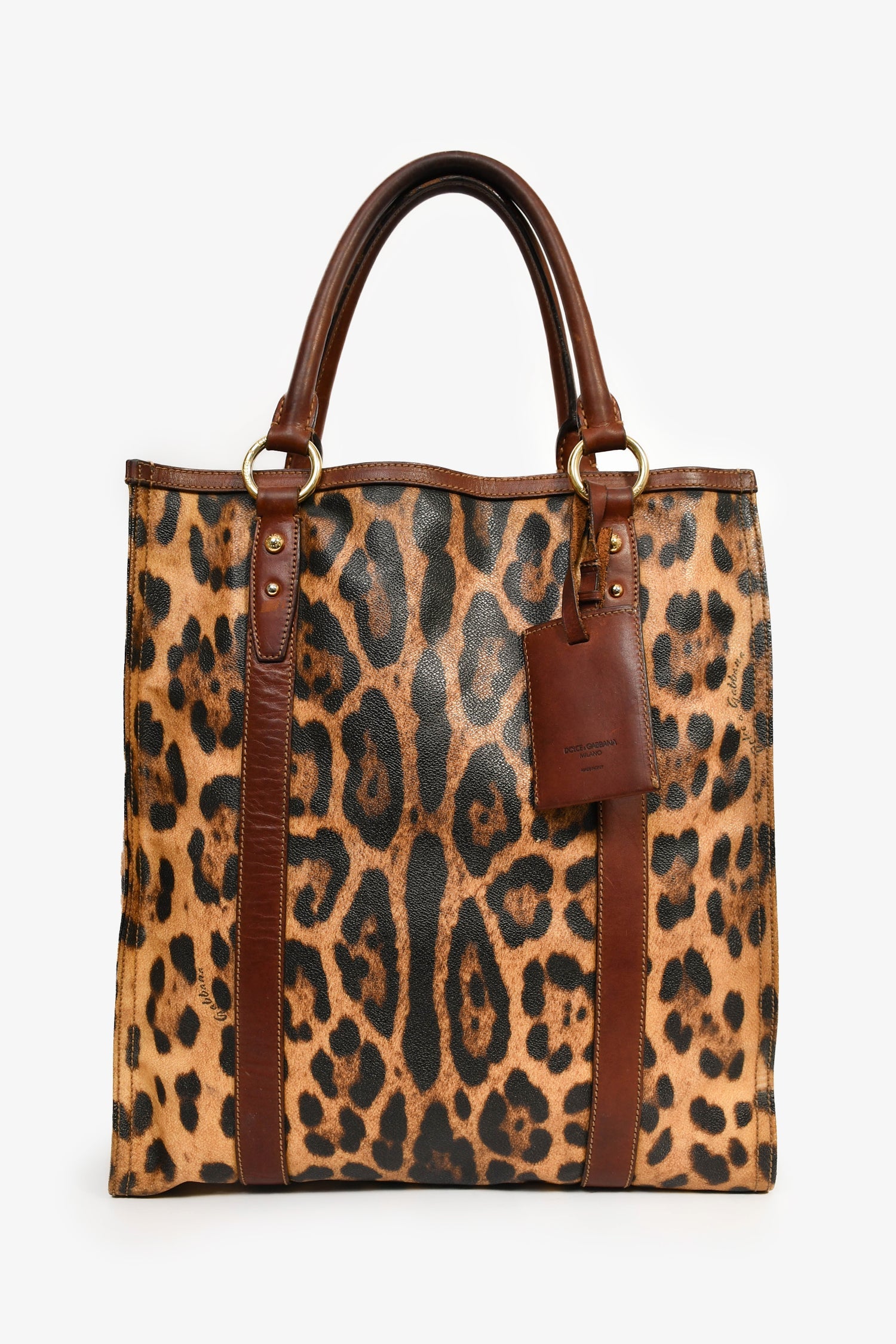 Dolce & Gabbana Brown Leopard Print Coated Canvas and Leather Shopper Tote. Dual handles. Top interior magnetic button closure. Beige textile interior lining. Two interior wall pockets; one slip and one with zip closure. Detachable luggage tag. Gold-tone hardware.