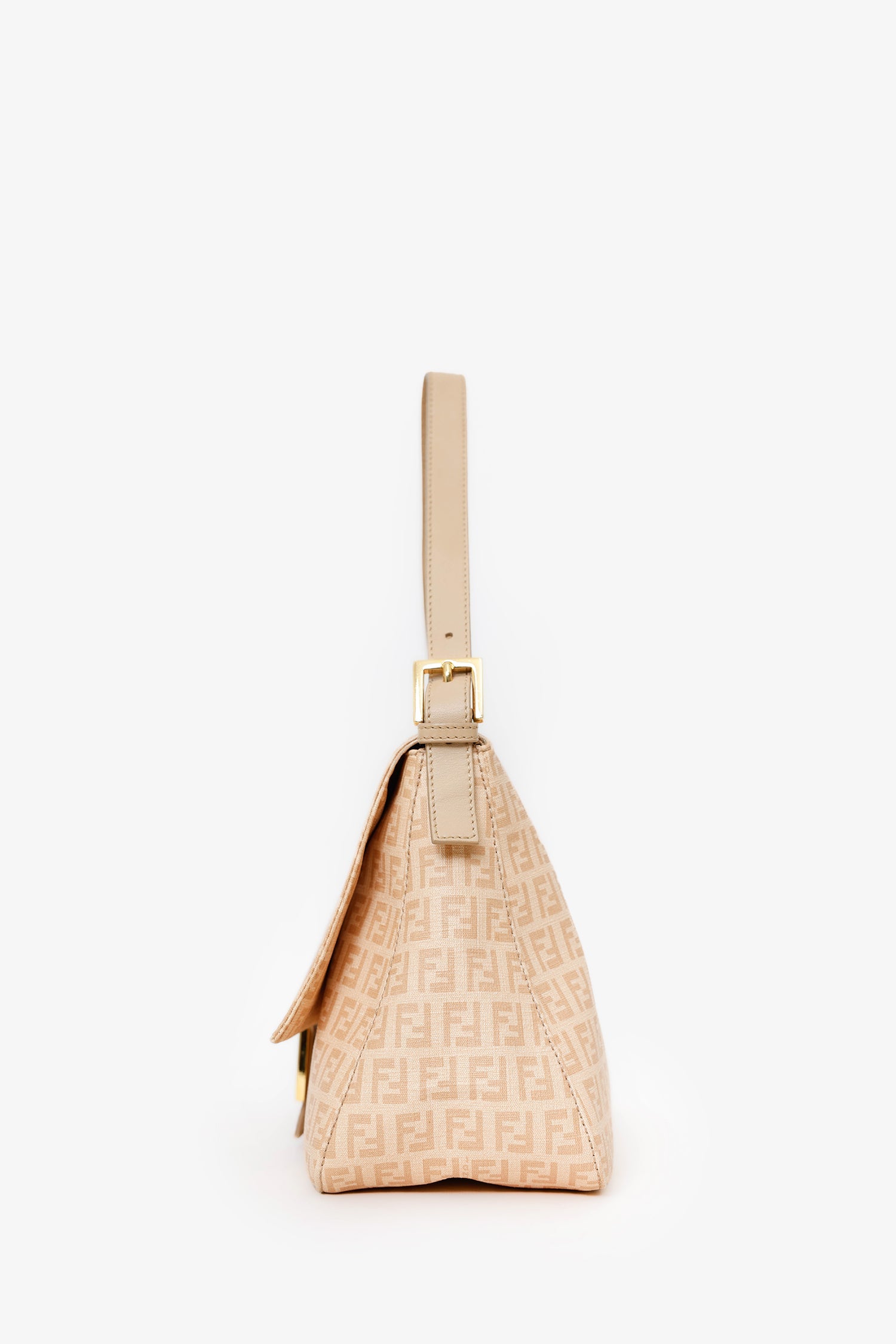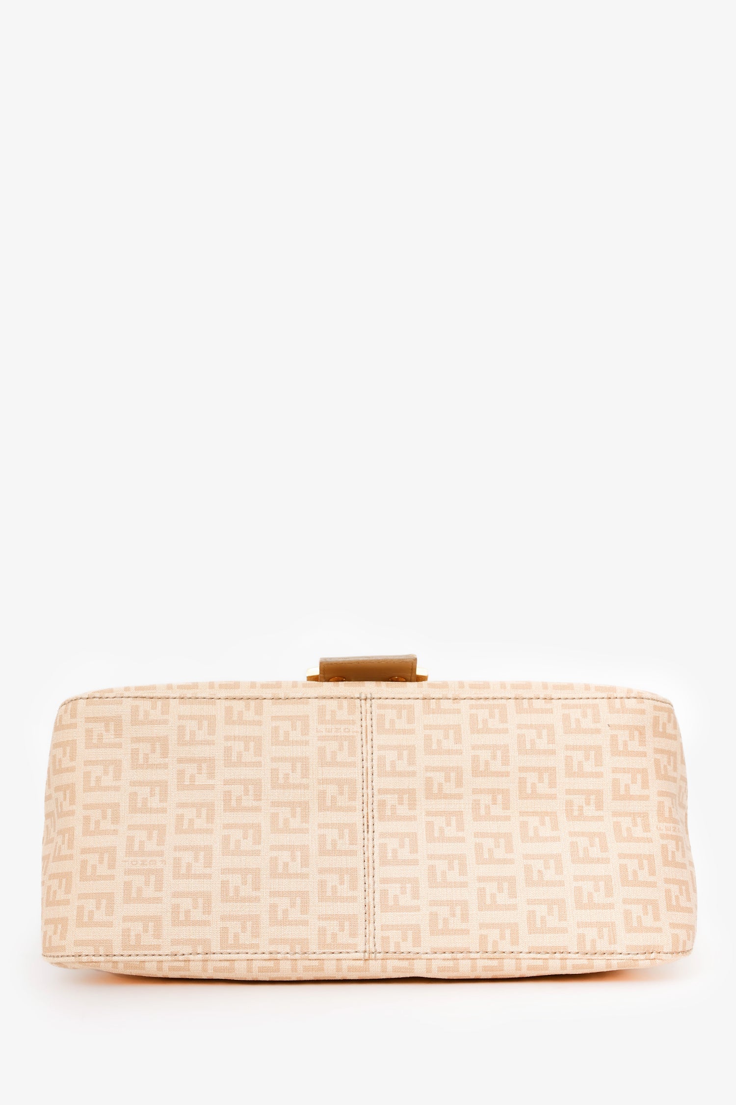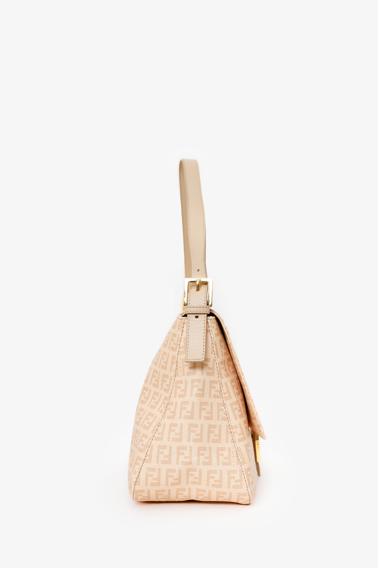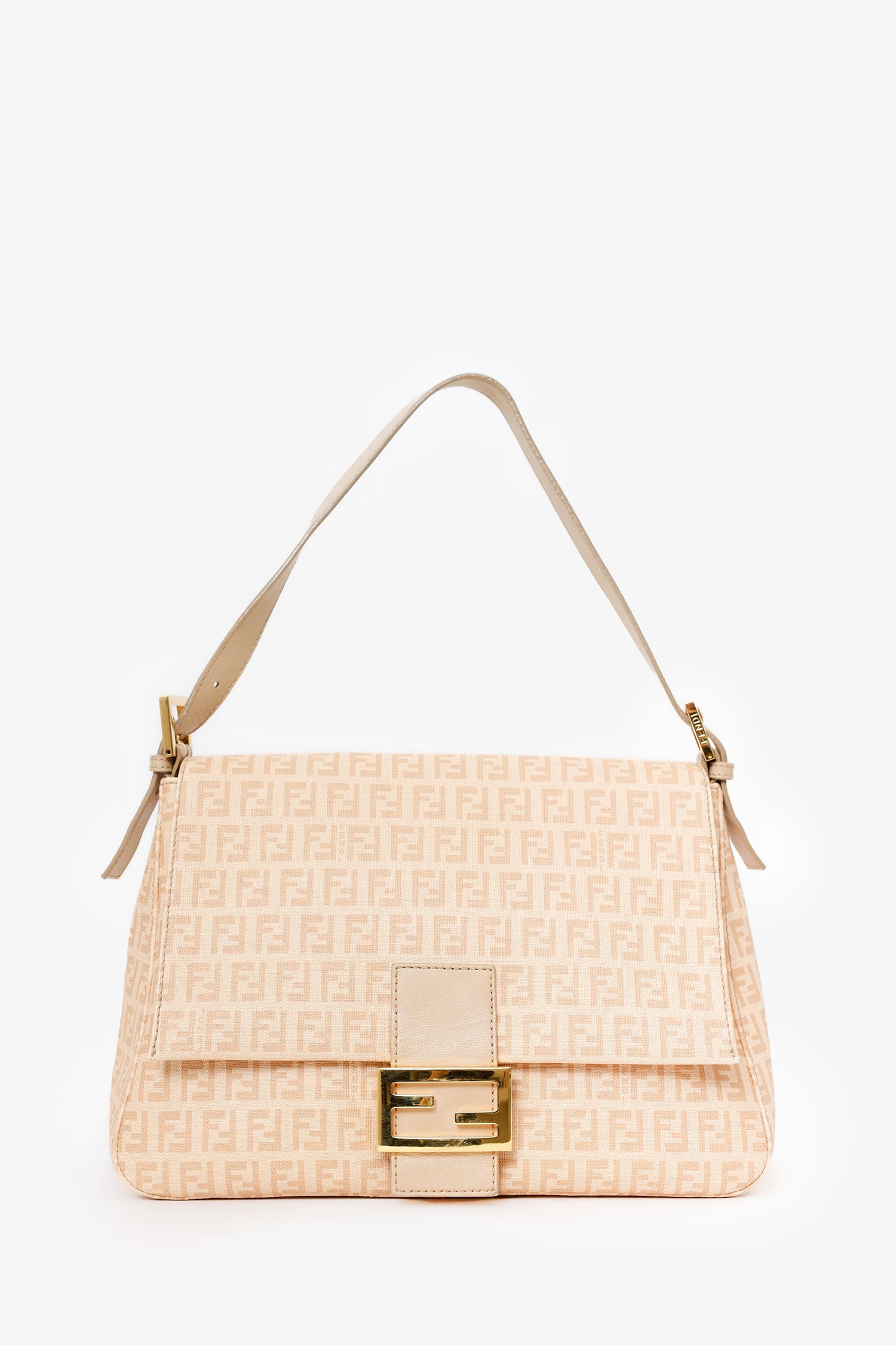 Fendi Beige FF Zucca Mama Forever Baguette. Front-fold-over-flap with snap-button-up closure. Shoulder strap with adjustable pull-through buckle closure. Lined interior with single rear zip-up pocket. Gold-tone hardware. Tonal stitching.
