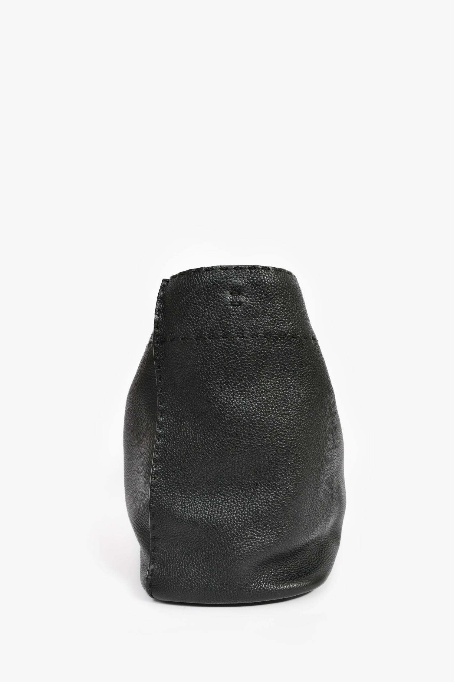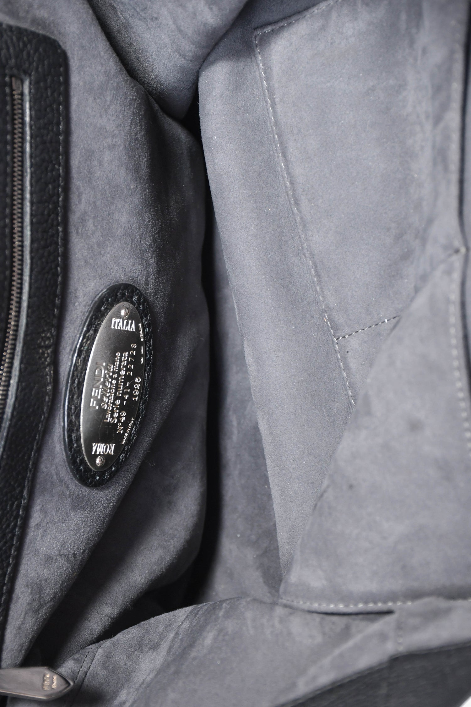 Fendi Black Leather Selleria Anna Bucket Bag with Strap. Top interior latch closure. Protective base studs. Interchangeable and detachable top handle and strap (adjustable). Lined interior. 3 interior wall pockets; 2 open, 1 with zip closure. Silver-tone hardware. Tonal stitching.