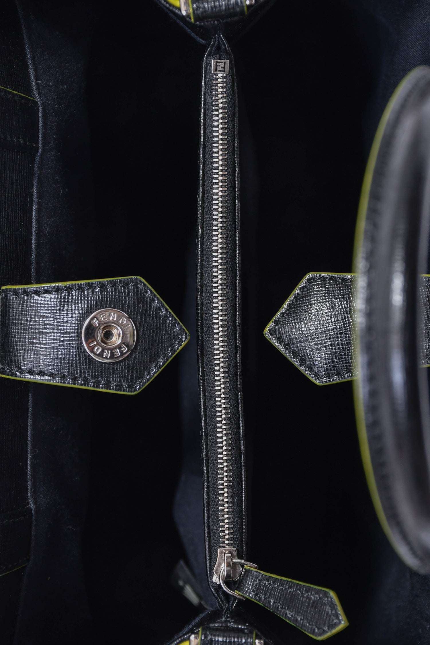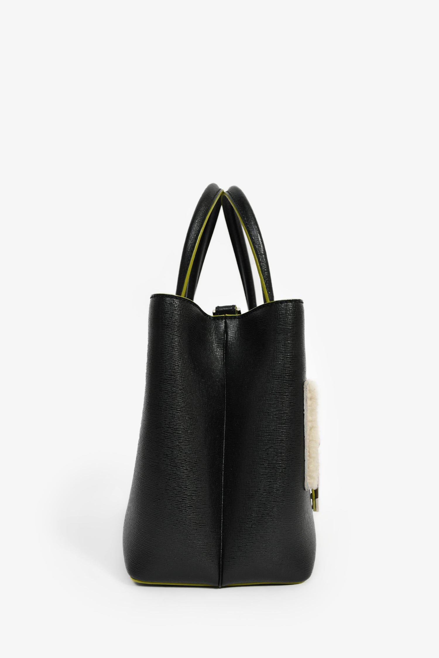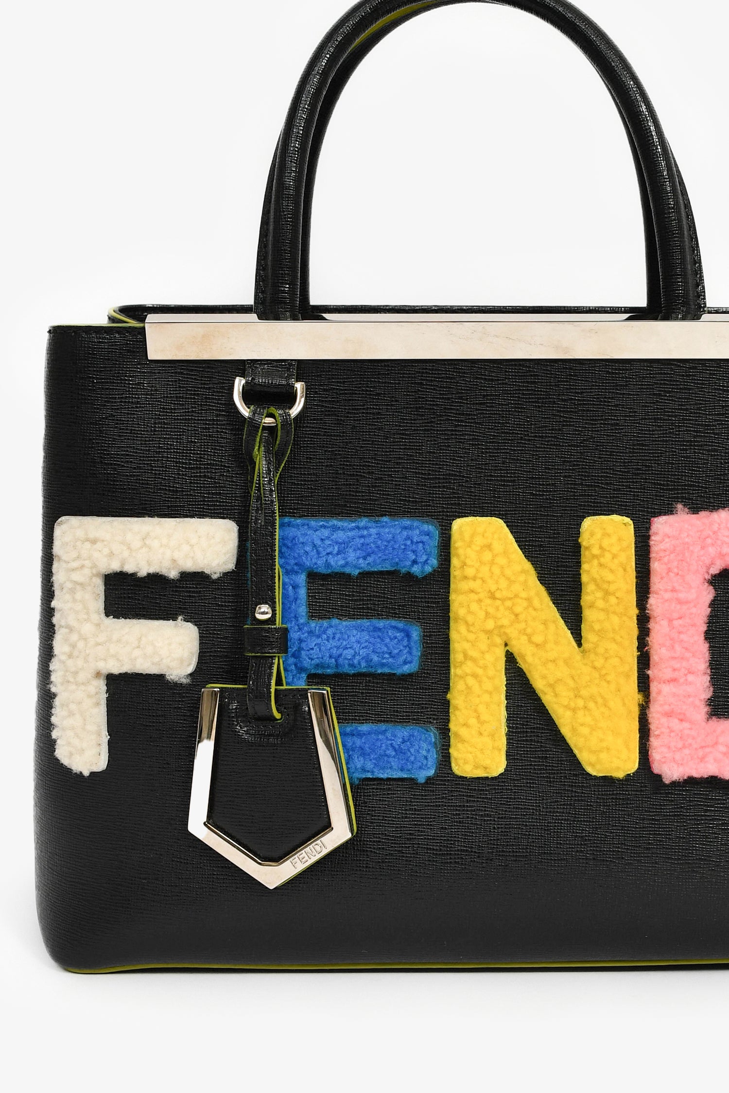 Fendi Black/Multi Shearling Petite '2Jours' Tote. Open top with concealed interior snap closures. Dual rolled handles. Adjustable leather strap. 2 interior and 1 zip compartment. Silver-tone hardware. Tonal stitching.
