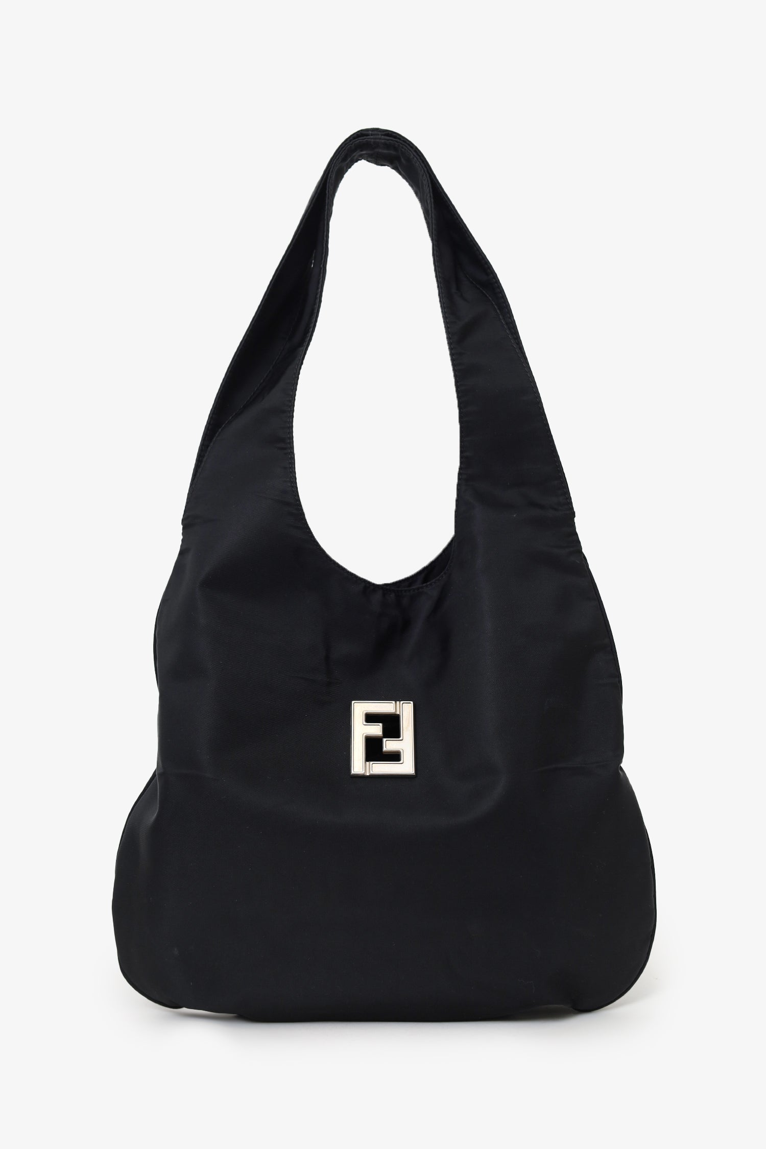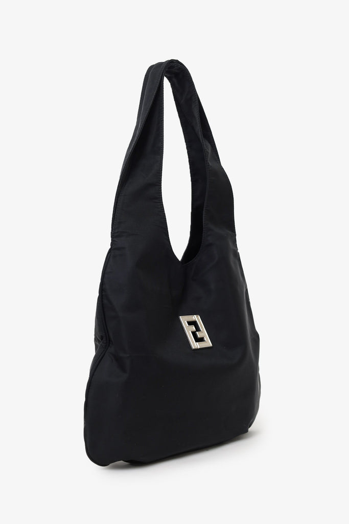 Fendi Black Nylon FF Hobo Shoulder Bag. Magnetic closure at top. Dual shoulder straps. Fabric-lined interior. Single interior zip pocket. Silver-tone hardware. Tonal stitching.