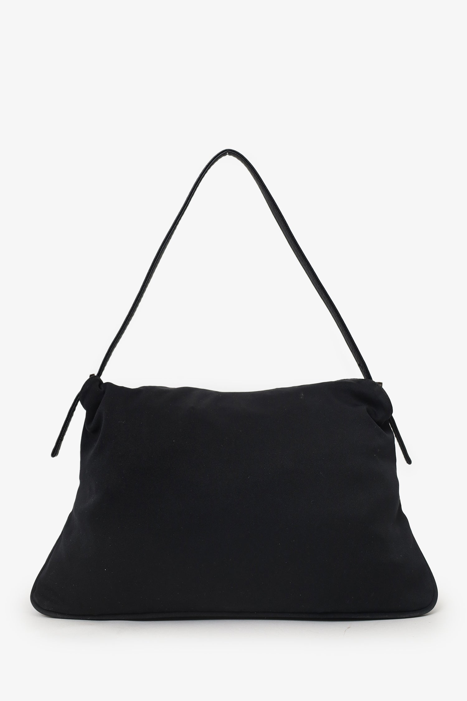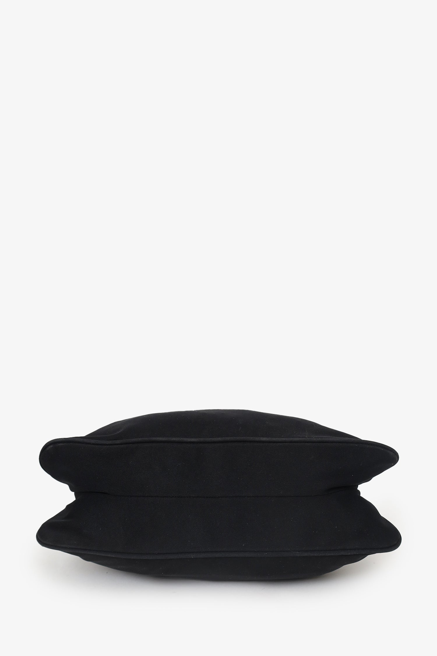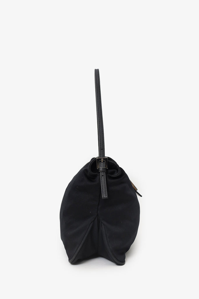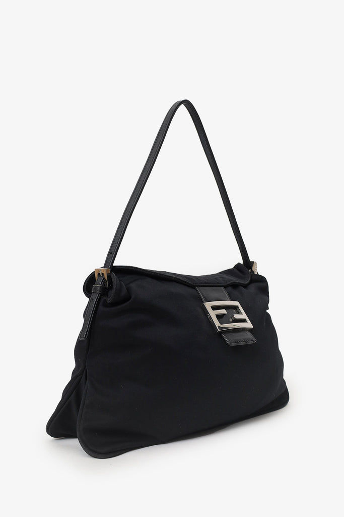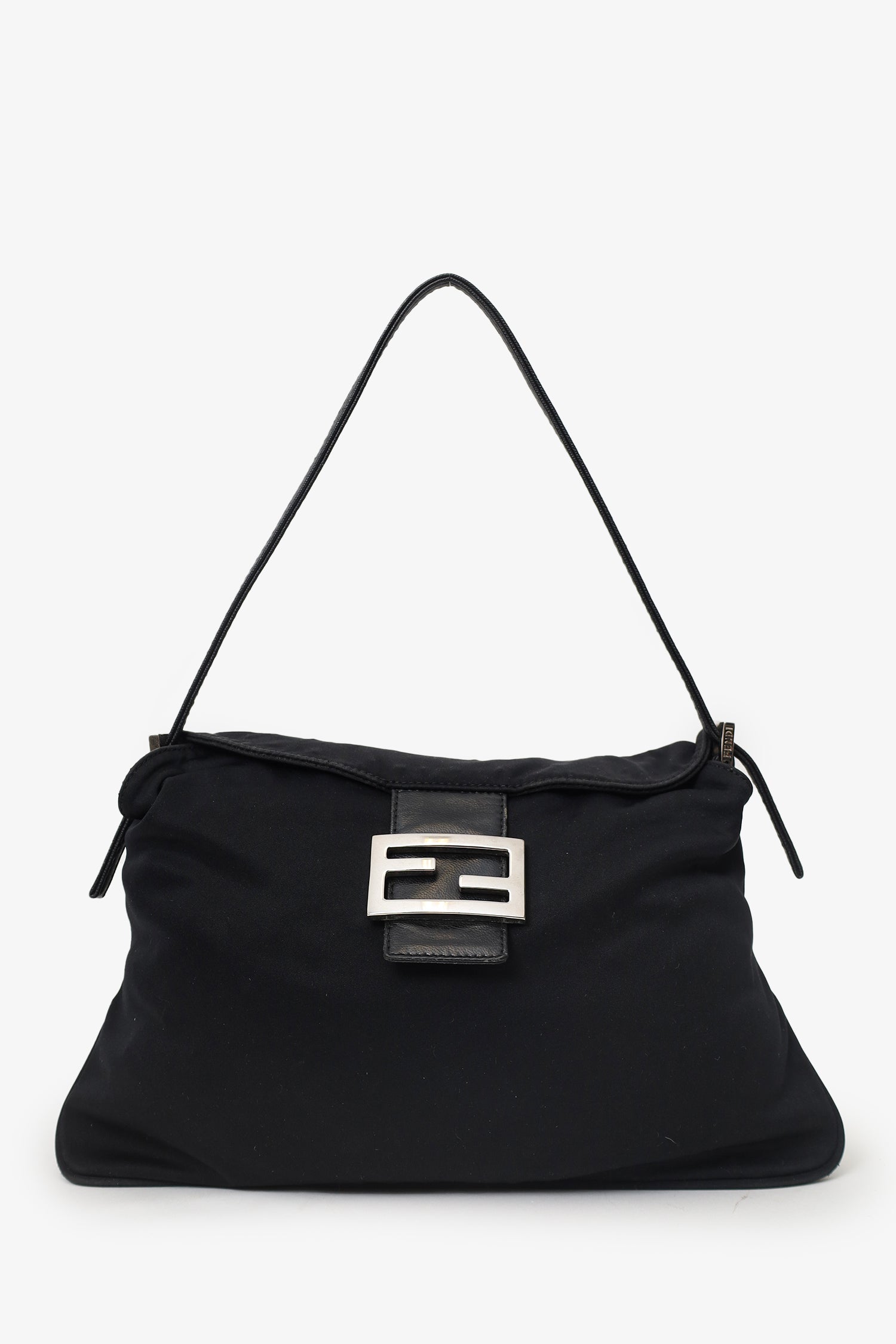 Fendi Black Nylon Mama Double Flap Baguette. Front fold-over flap. Leather shoulder strap with adjustable buckle closure. Single interior zip pocket. Silver-tone hardware. Tonal stitching.