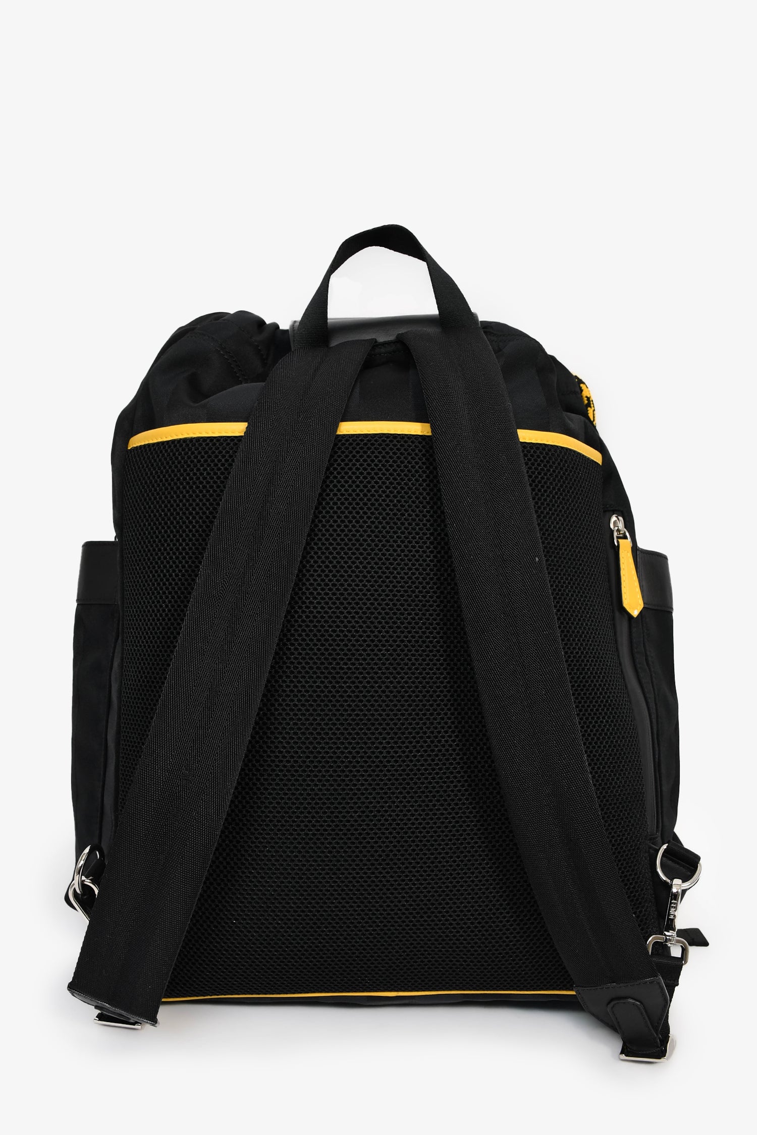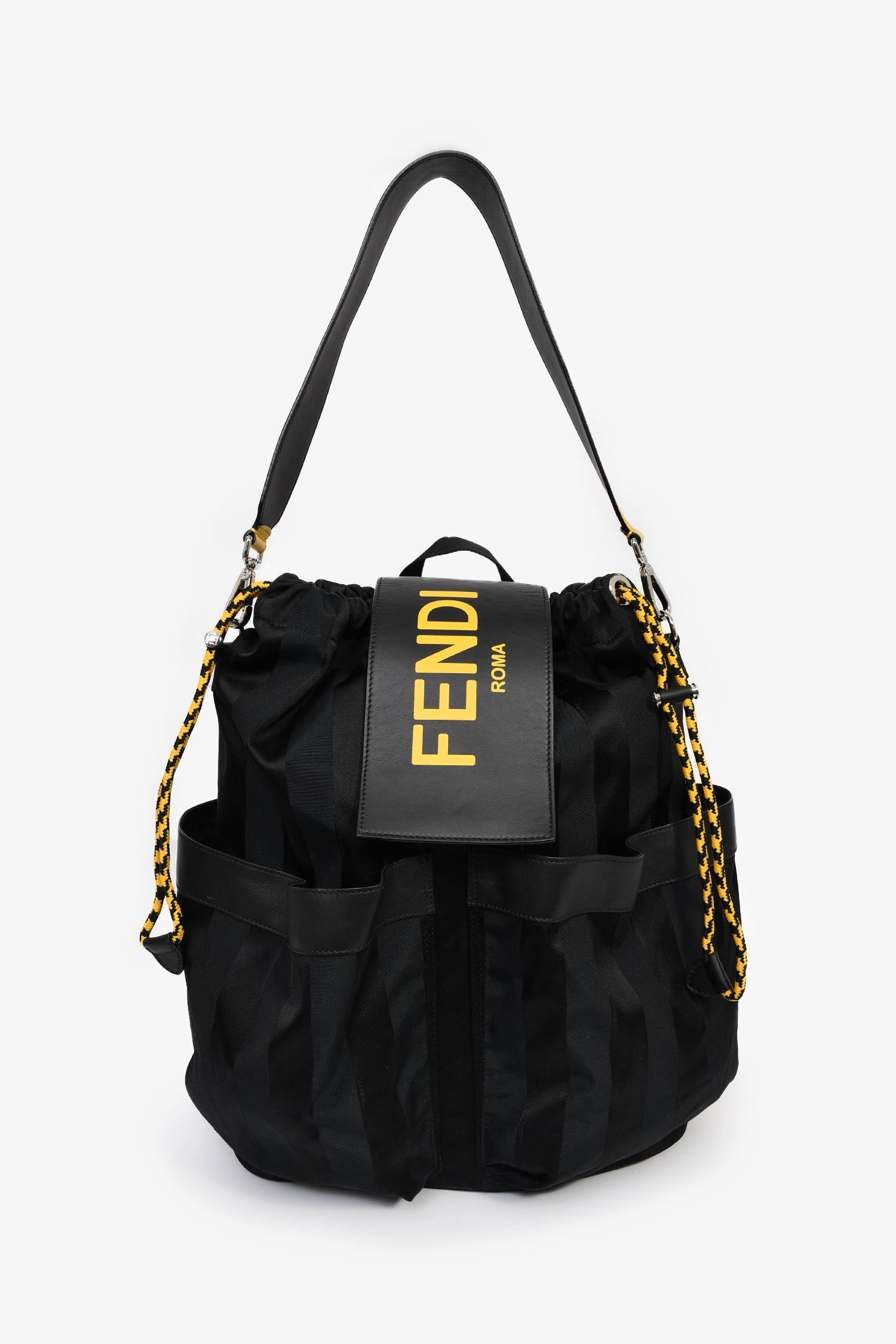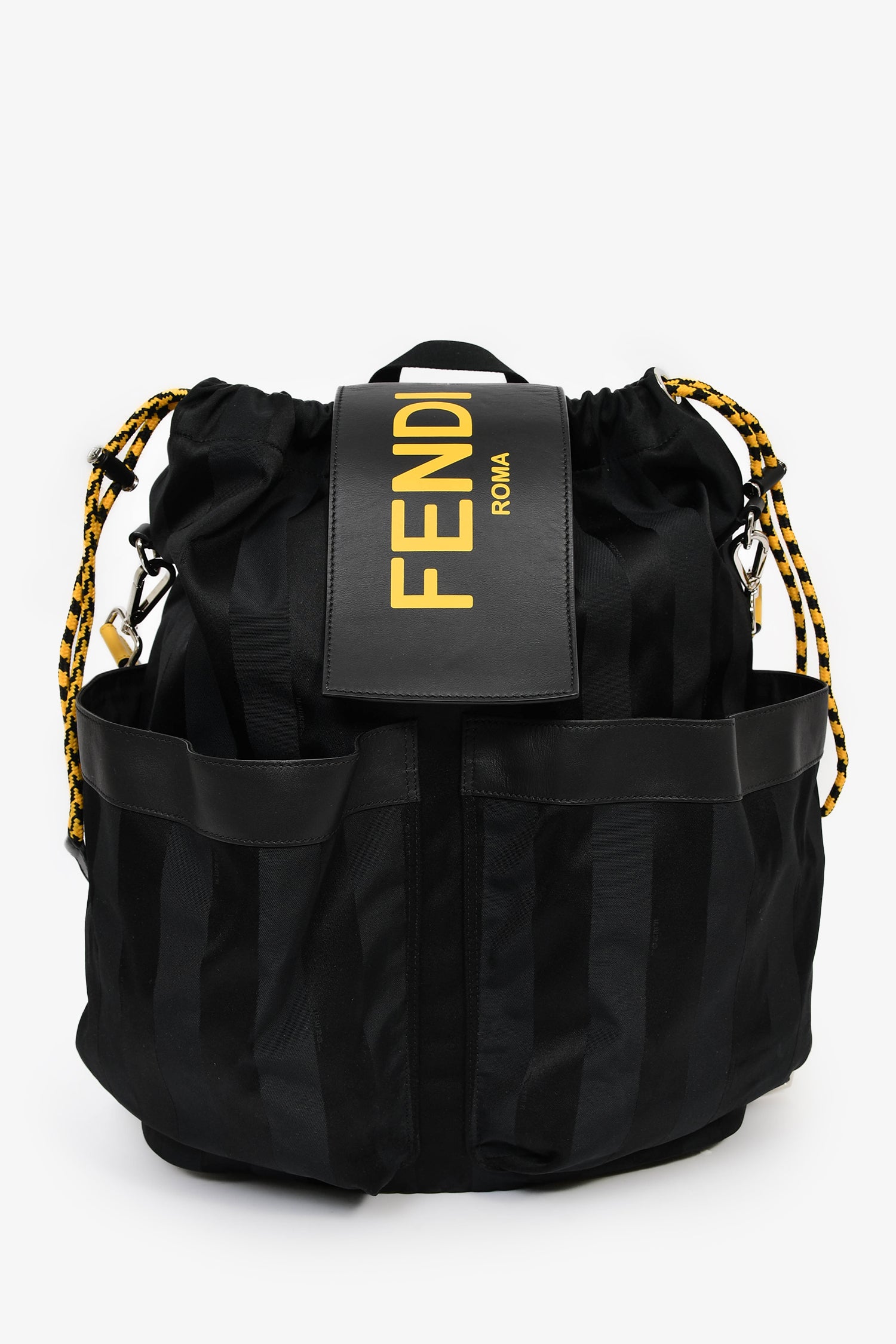 Fendi Black/Yellow Nylon/Leather Pequin Drawstring Backpack. Fold-over strap with adjustable pull tabs. 1 handle strap and 2 adjustable shoulder straps. 2 front pockets with velcro closures. Rear mesh slip compartment.  Lined interior with 1 zip. Silver-tone hardware. Tonal stitching.