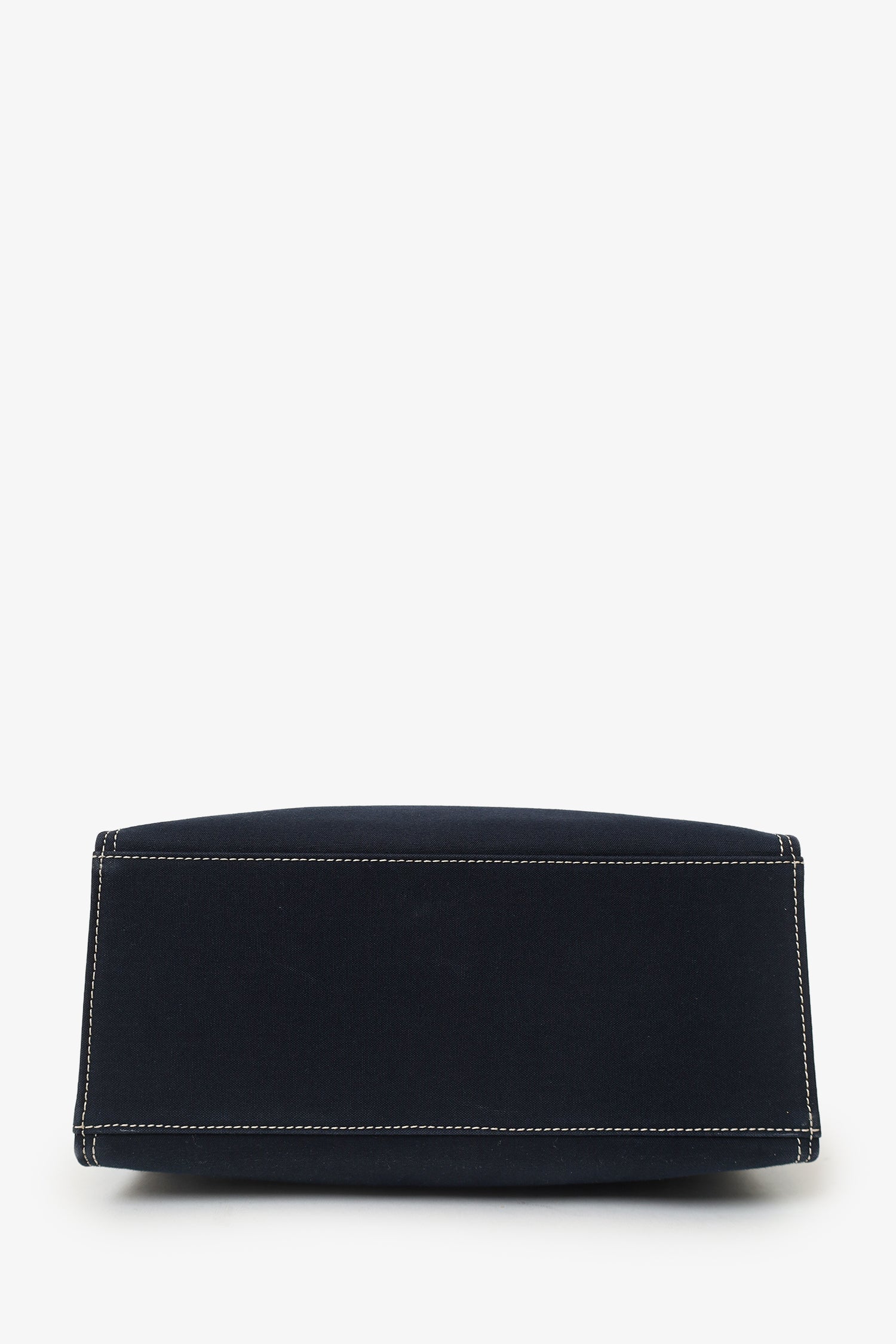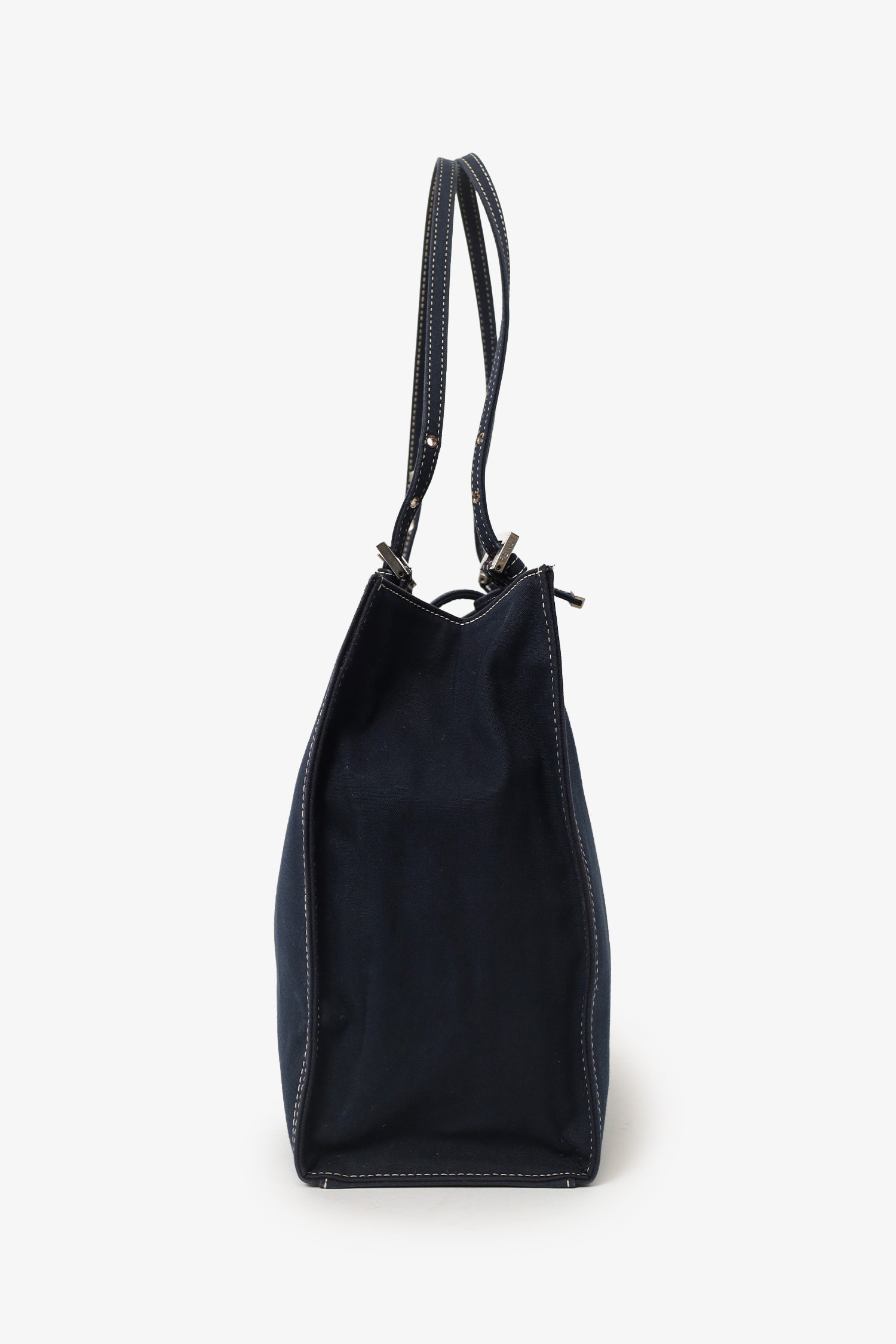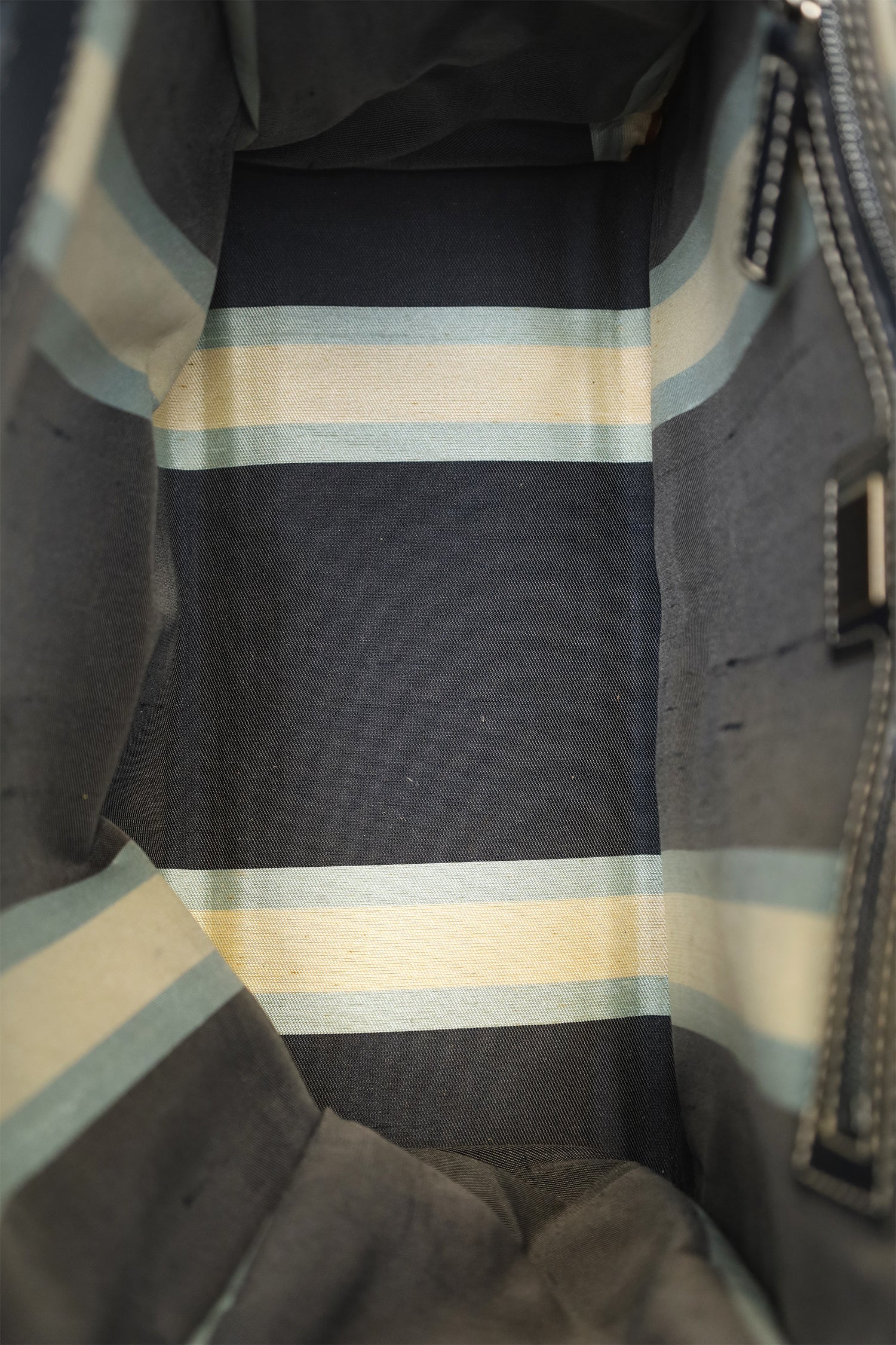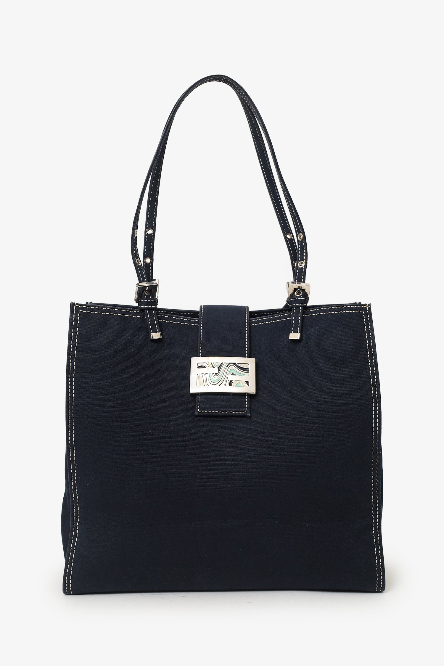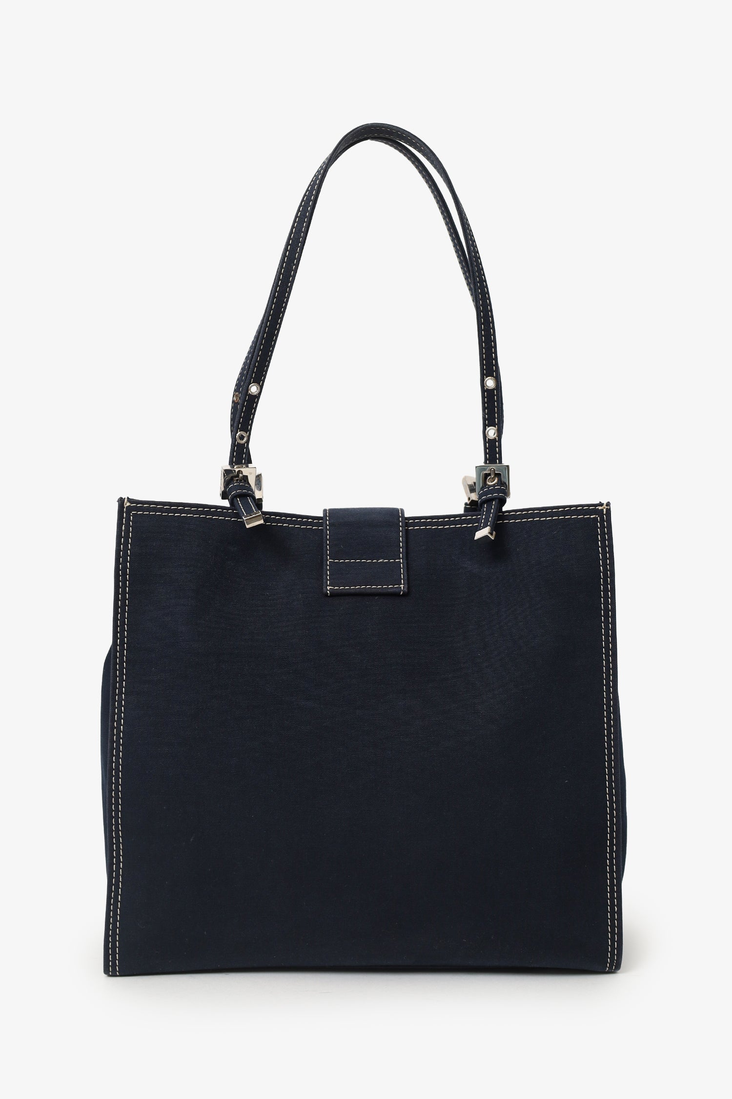 Fendi Blue Denim Baguette Buckle Square Tote Square. Top fold-over flap with snap button closure. Adjustable twin top straps with push pin buckle closure. Lined interior. Single interior wall zip pocket. Silver-tone hardware. Contrast stitching.