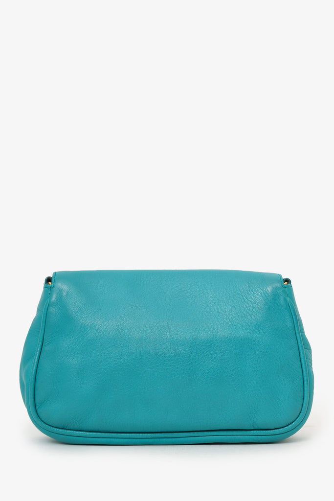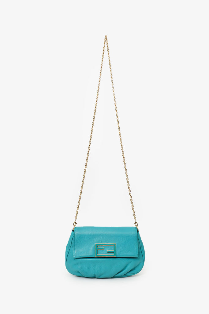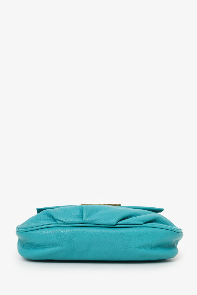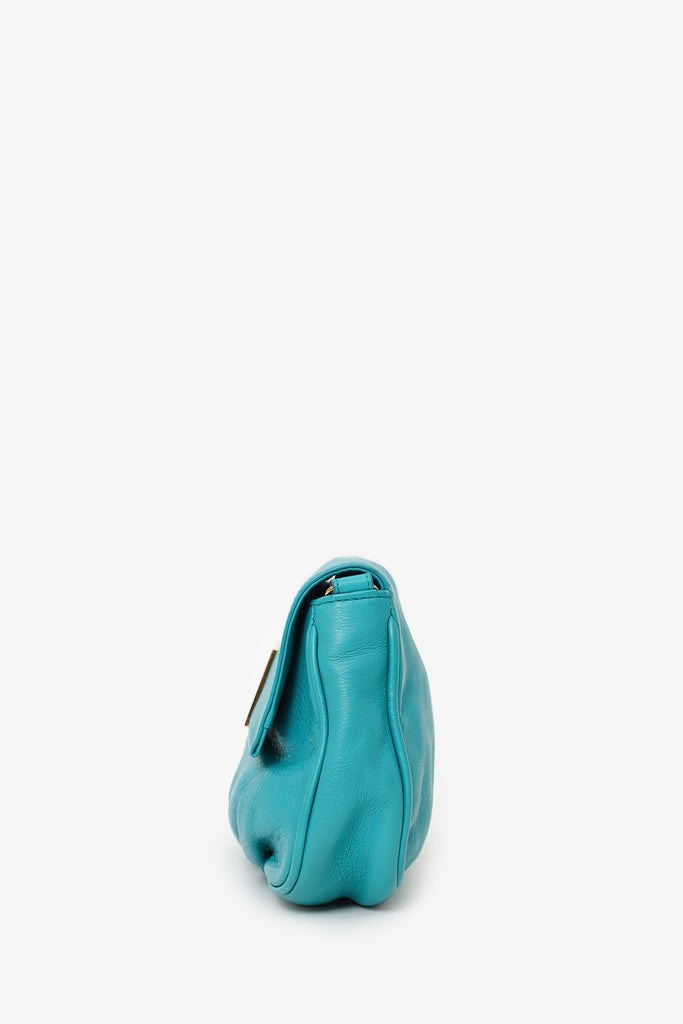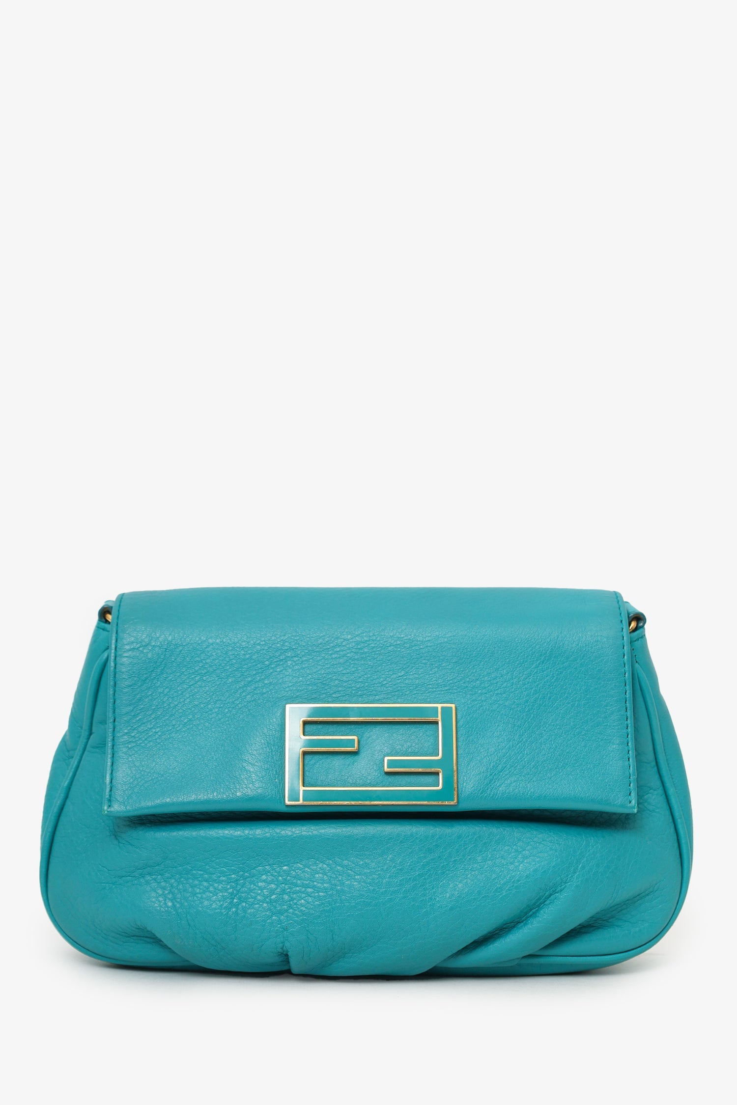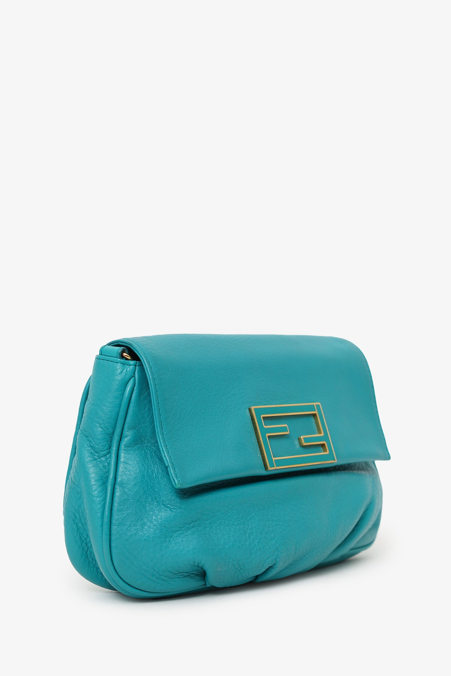 Fendi Blue Leather Fendista Pochette Crossbody Bag. Front fold-over flap with magnetic closure. Detachable gold crossbody strap. Fabric-lined interior. Single interior slip-pocket. Gold-tone hardware. Tonal stitching.