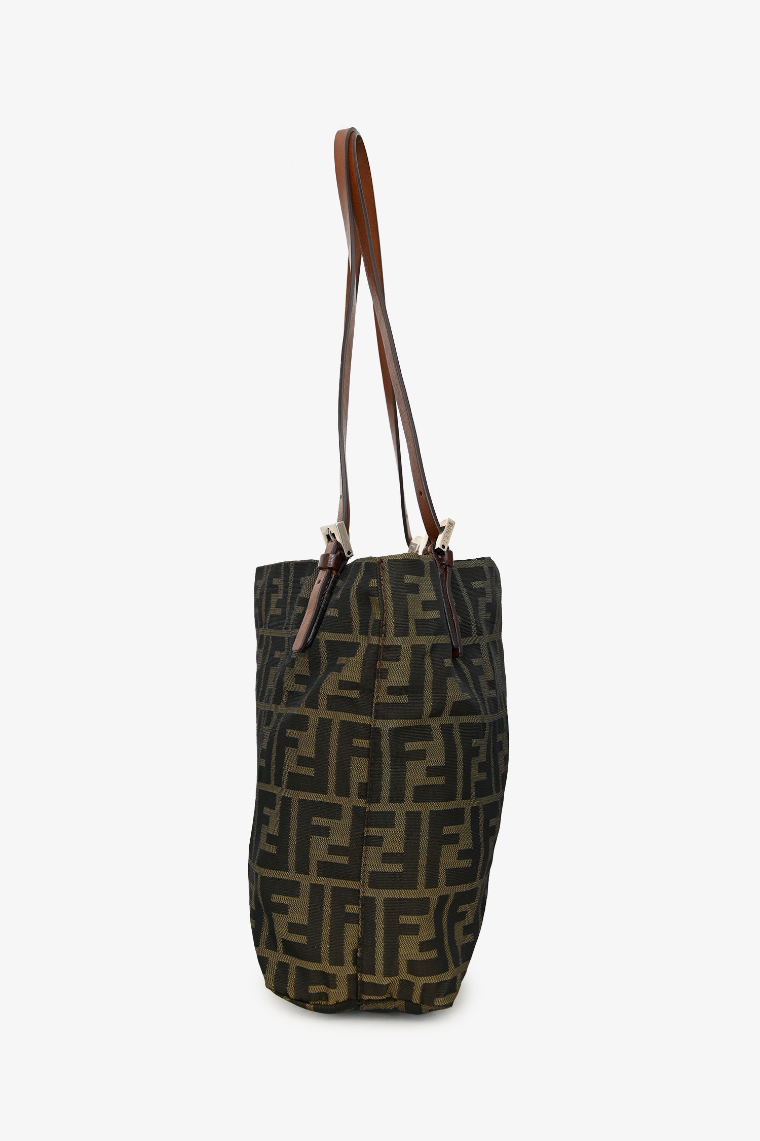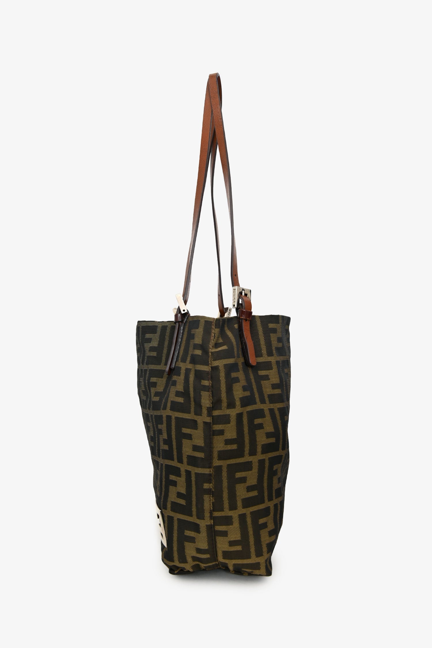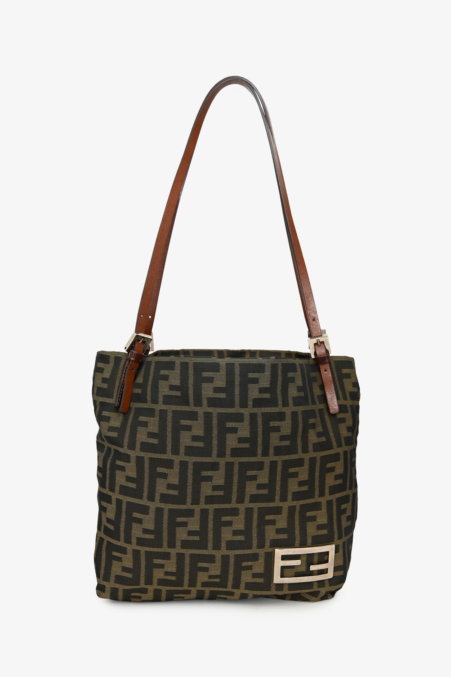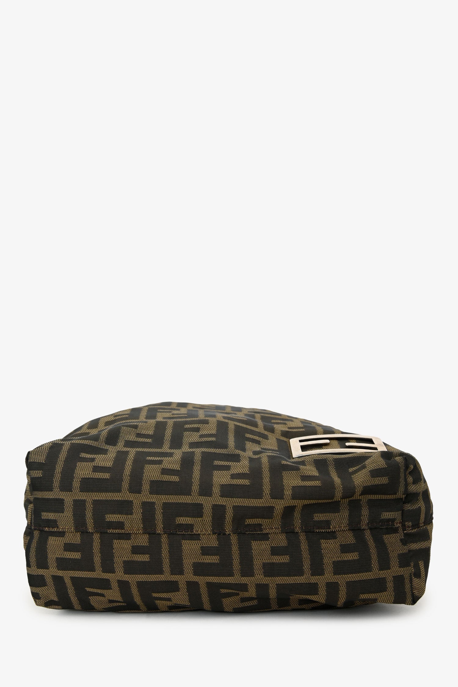 Fendi Brown Canvas Zucca Jacquard Baguette Tote Bag. Interior magnetic button closure. Dual adjustable straps. Textile-lined interior. Single interior wall zip pocket. Silver-tone hardware. Tonal stitching.