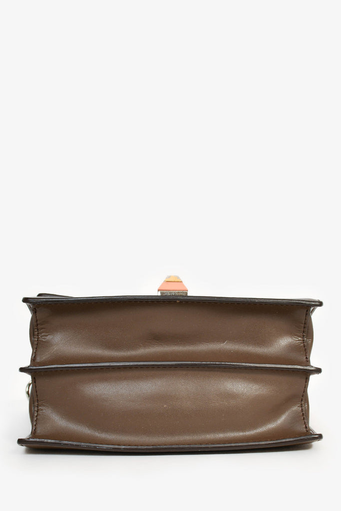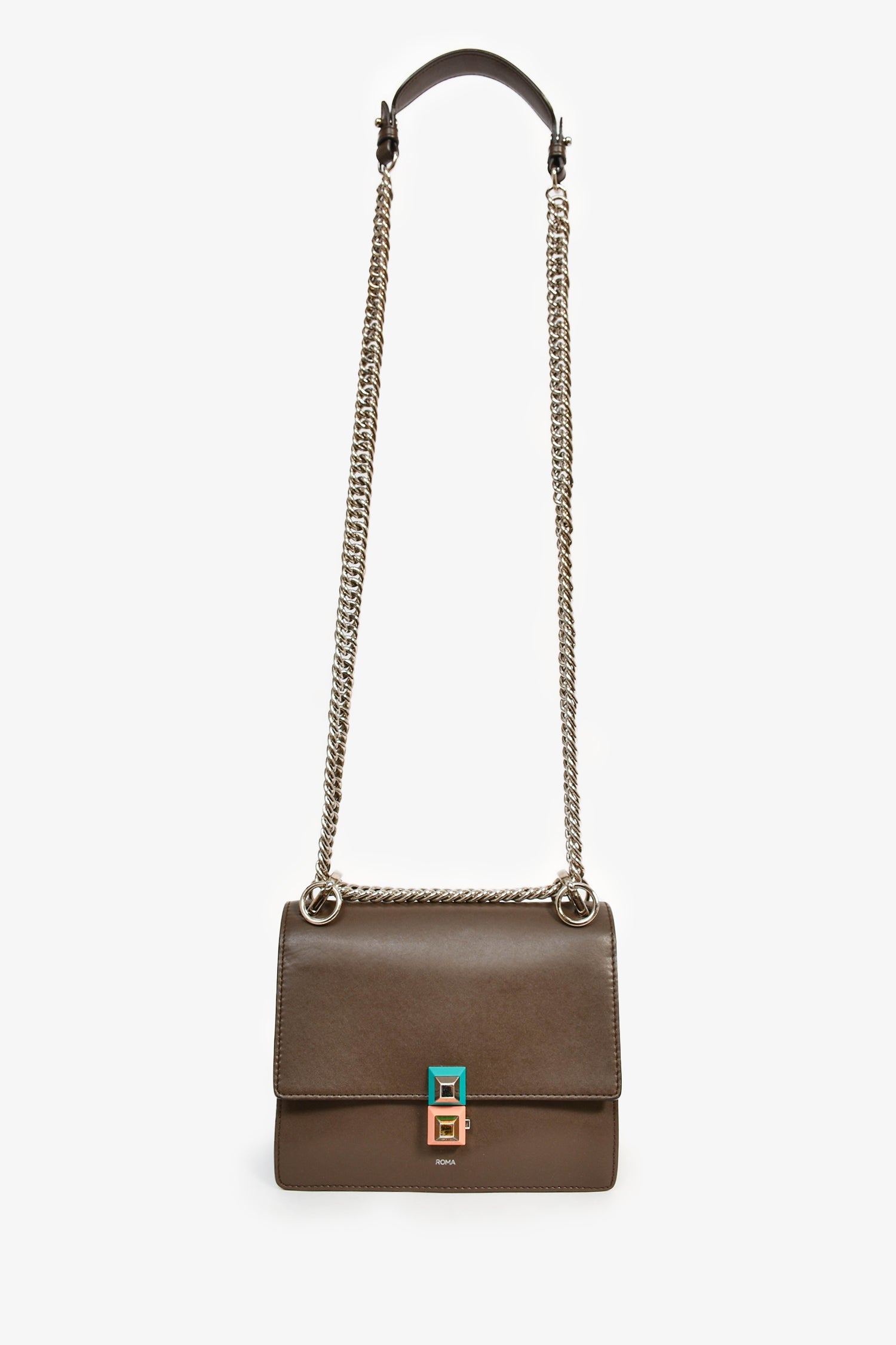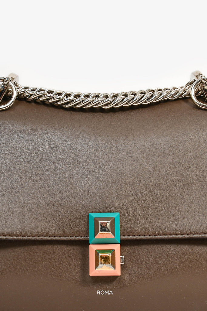 Fendi Brown Leather Small 'Kan I' Chain Crossbody. Gold-tone hardware. Fold-over flap with a push open closure. Suede-lined interior. Single pocket. Chain-link crossbody strap. Tonal stitching.