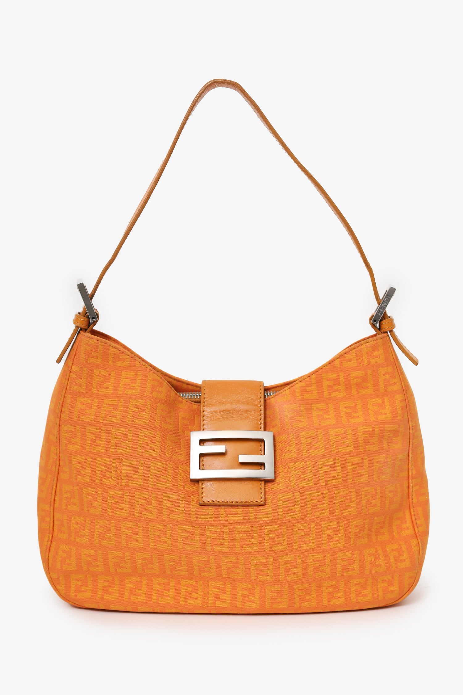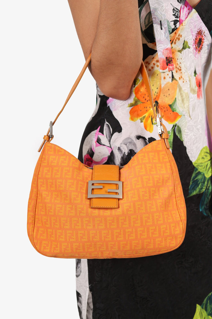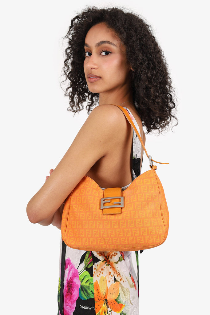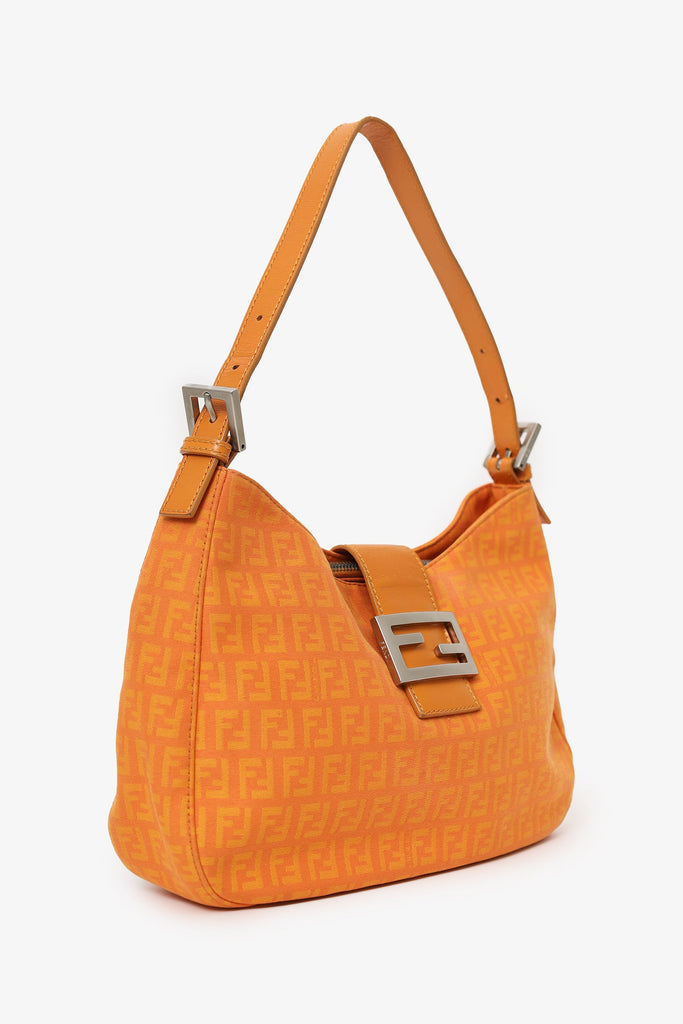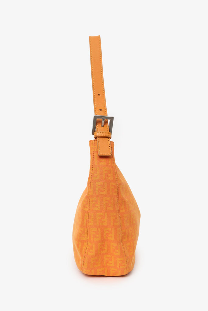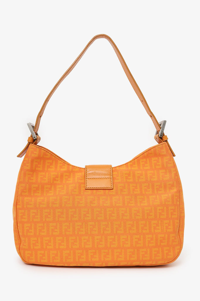 Fendi Orange FF Zucchini Canvas Baguette Shoulder Bag. Front fold-over piece with magnetic snap-button closure. Shoulder strap with adjustable buckle closure. 3 interior compartments; rear and front slip, middle zip. Lined interior. Silver-tone hardware. Tonal stitching.