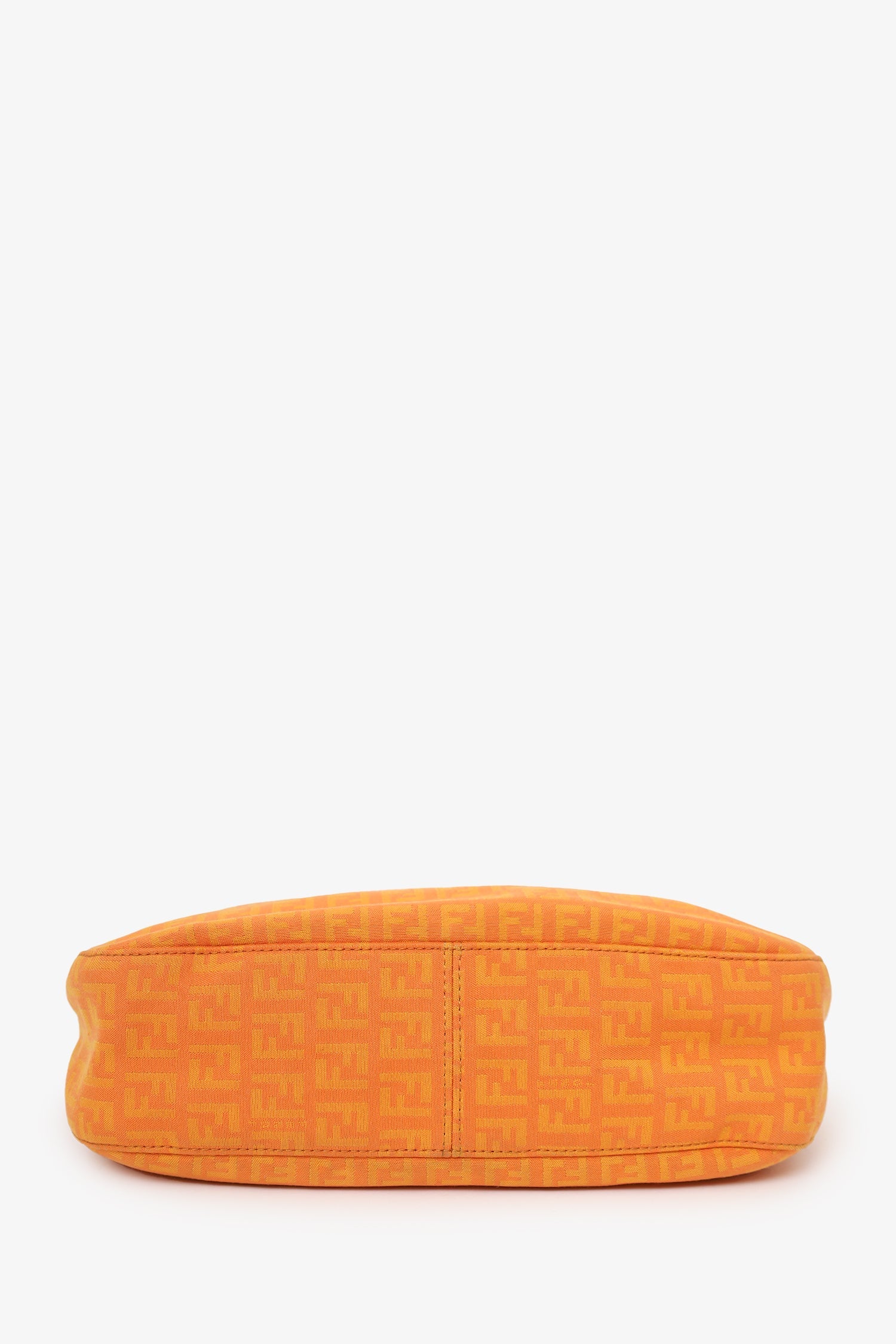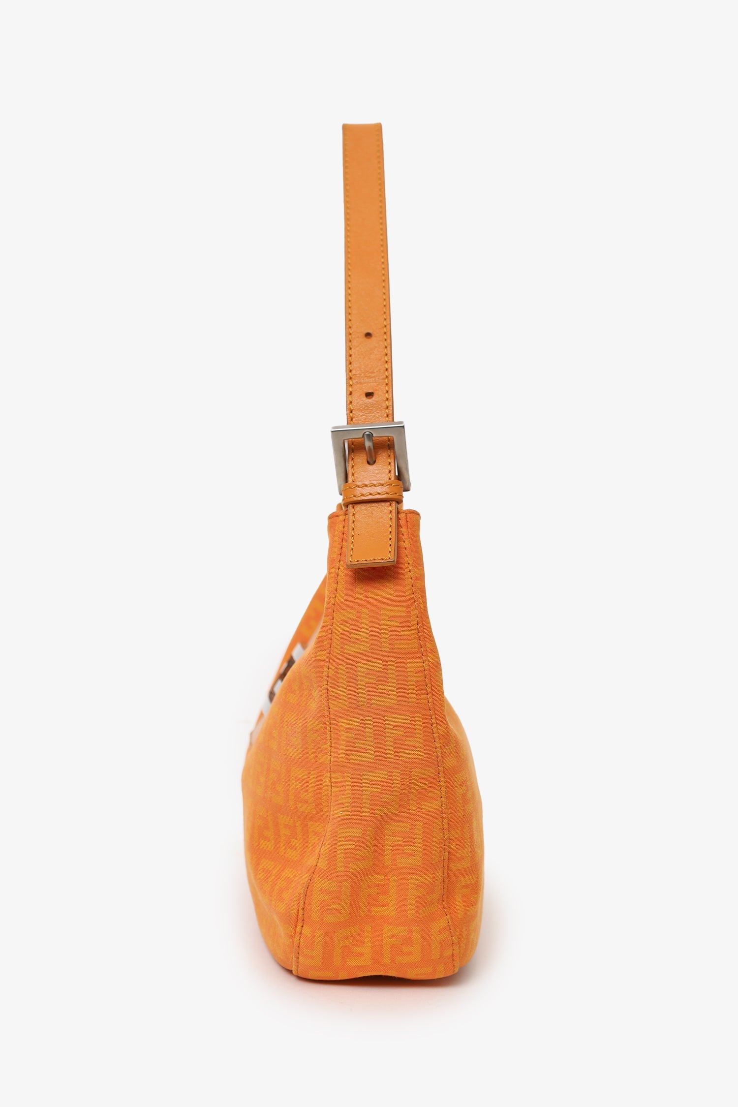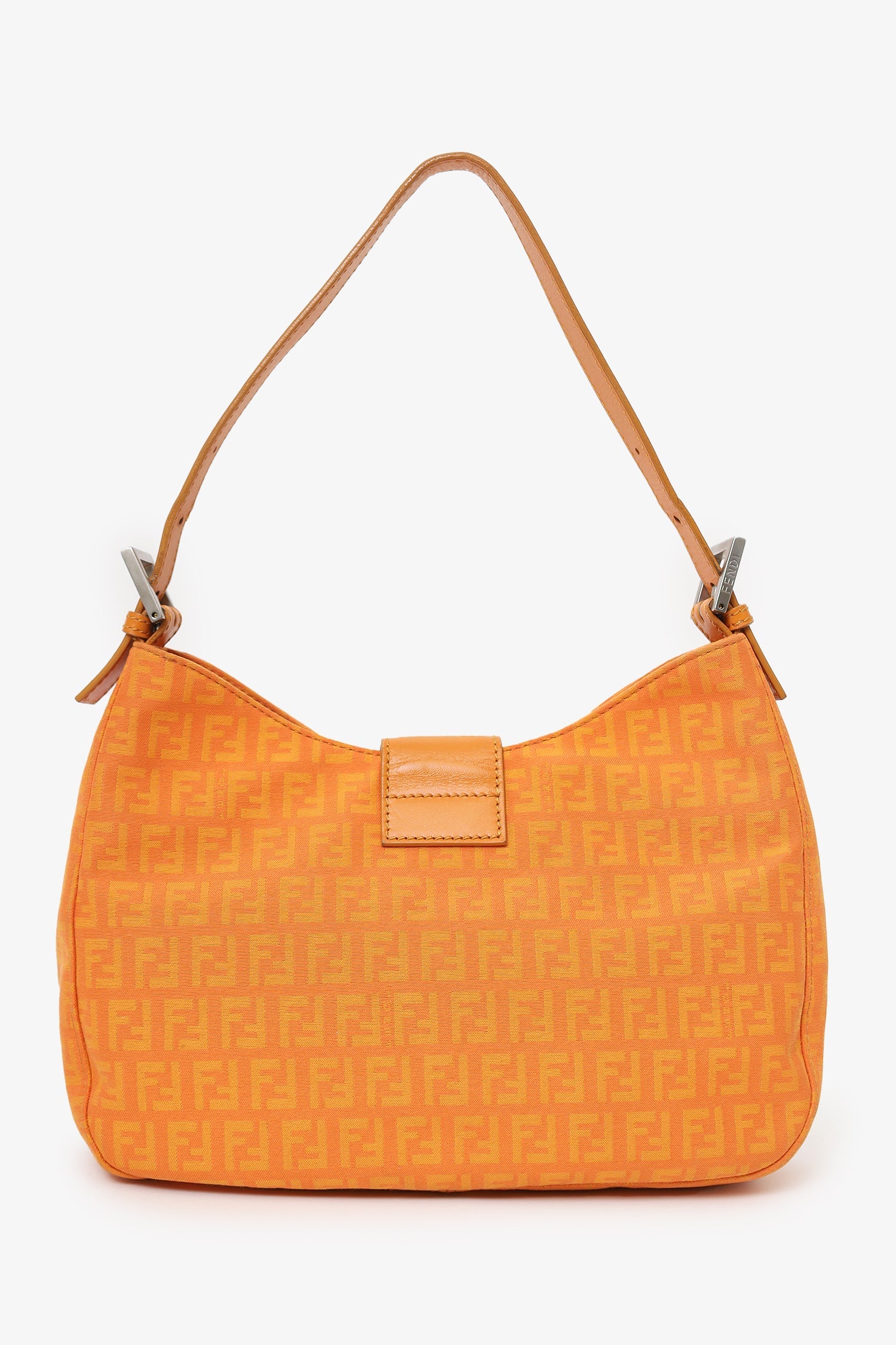 Fendi Orange FF Zucchini Canvas Baguette Shoulder Bag. Front fold-over piece with magnetic snap-button closure. Shoulder strap with adjustable buckle closure. 3 interior compartments; rear and front slip, middle zip. Lined interior. Silver-tone hardware. Tonal stitching.