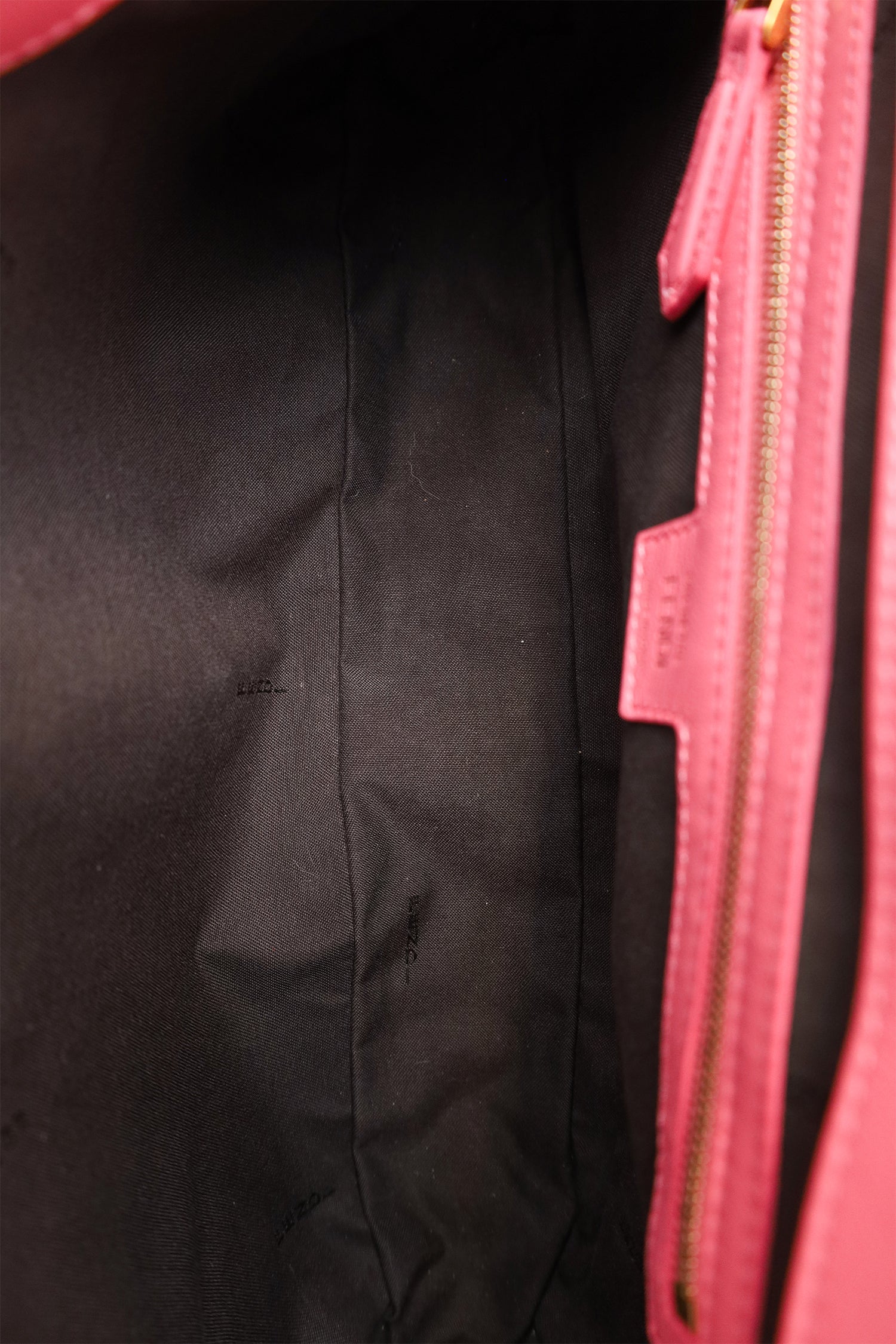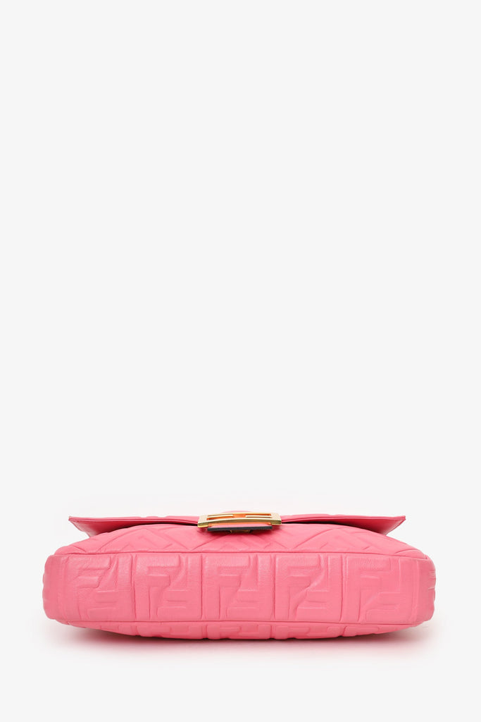 Fendi Pink Leather Nappa FF 1974 Embossed Large Baguette Bag with Strap. Front fold-over flap with snap-button closure. Top handle. Removable should strap. Lined interior. Single interior zip pocket. Gold-tone hardware. Tonal stitching.