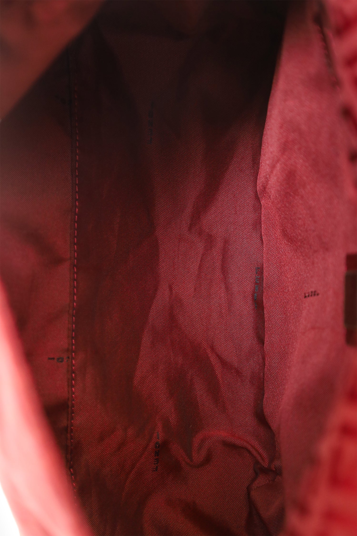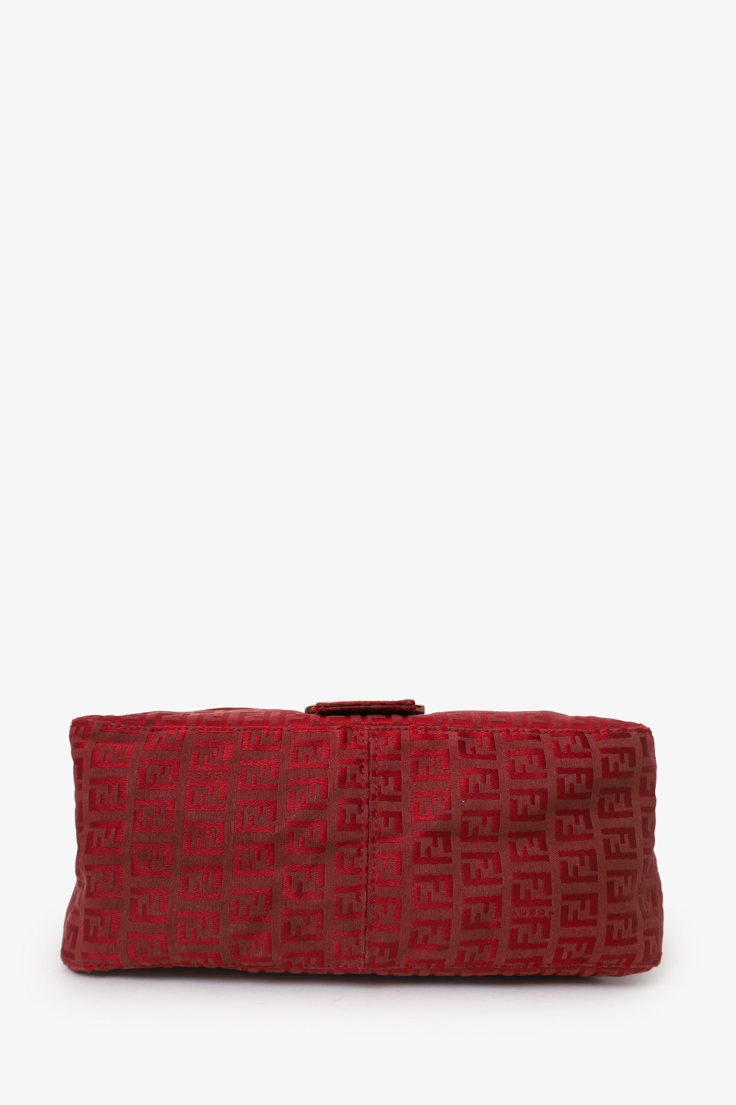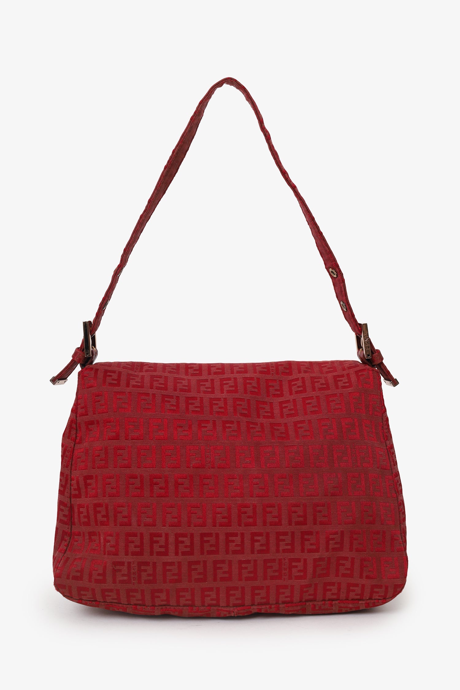 Fendi Red Canvas FF Zucca Mama Baguette Shoulder Bag. Front fold-over flap with magnetic button closure. Single shoulder strap with adjustable pull-through closure. Fabric lined interior. Single interior wall zip pocket. Dark gold-tone hardware. Tonal stitching. Dimensions: 10.25” width x 8.5” height x 4.5” depth x 8.5” strap dropCondition: This item is in good pre-loved condition. Loose threads on exterior. Single tear on back exterior. Signs of wear on interior and exterior gold hardware.
