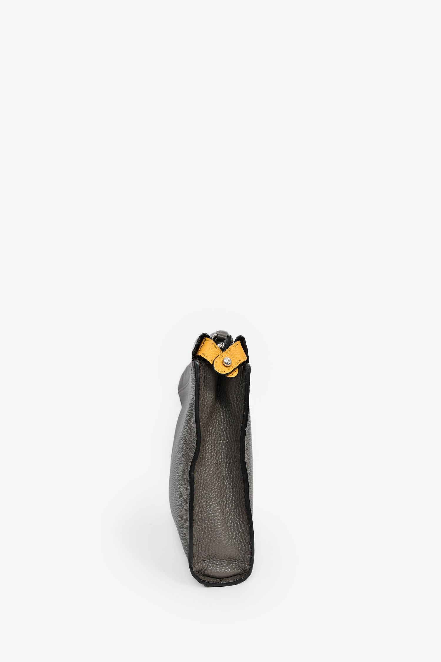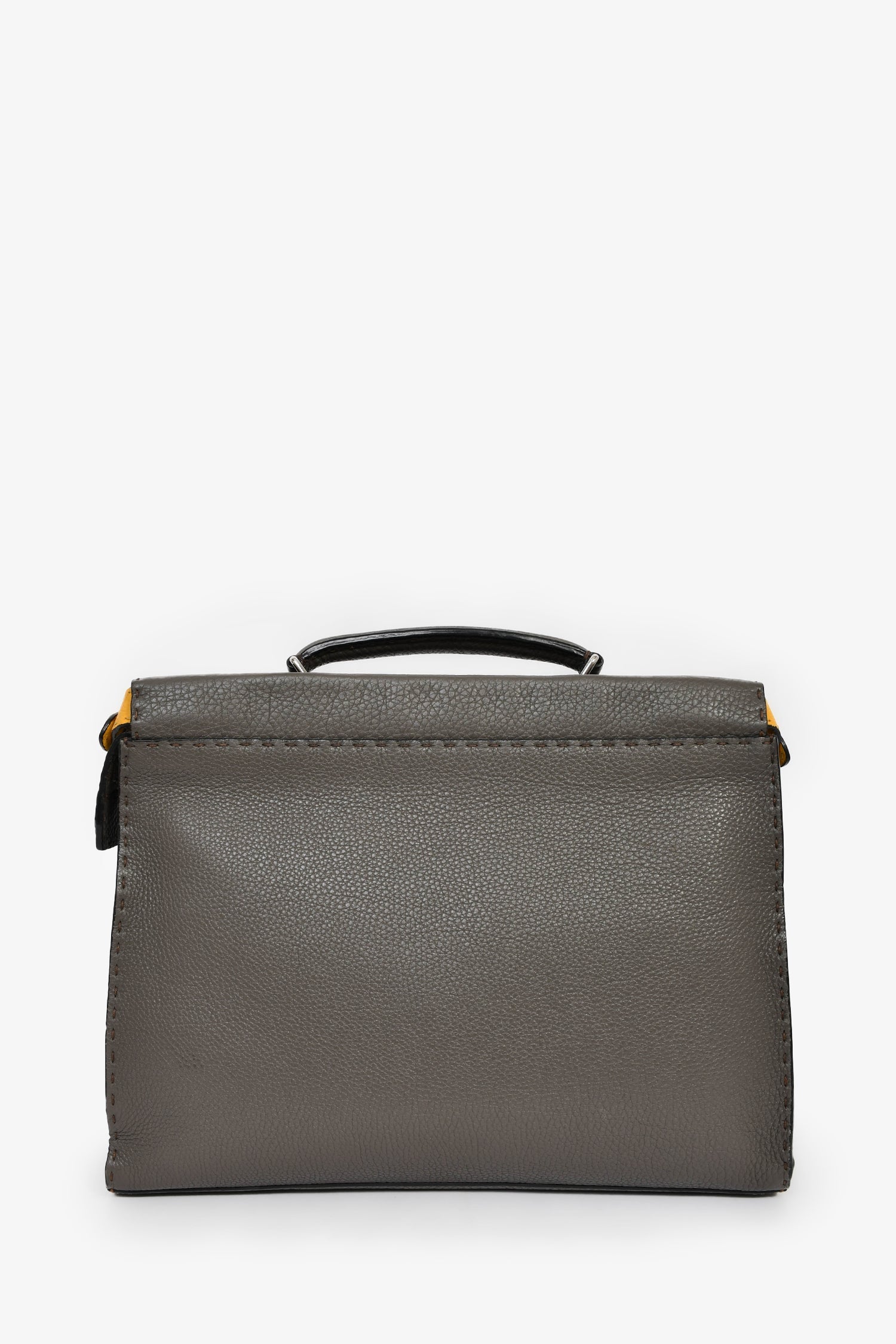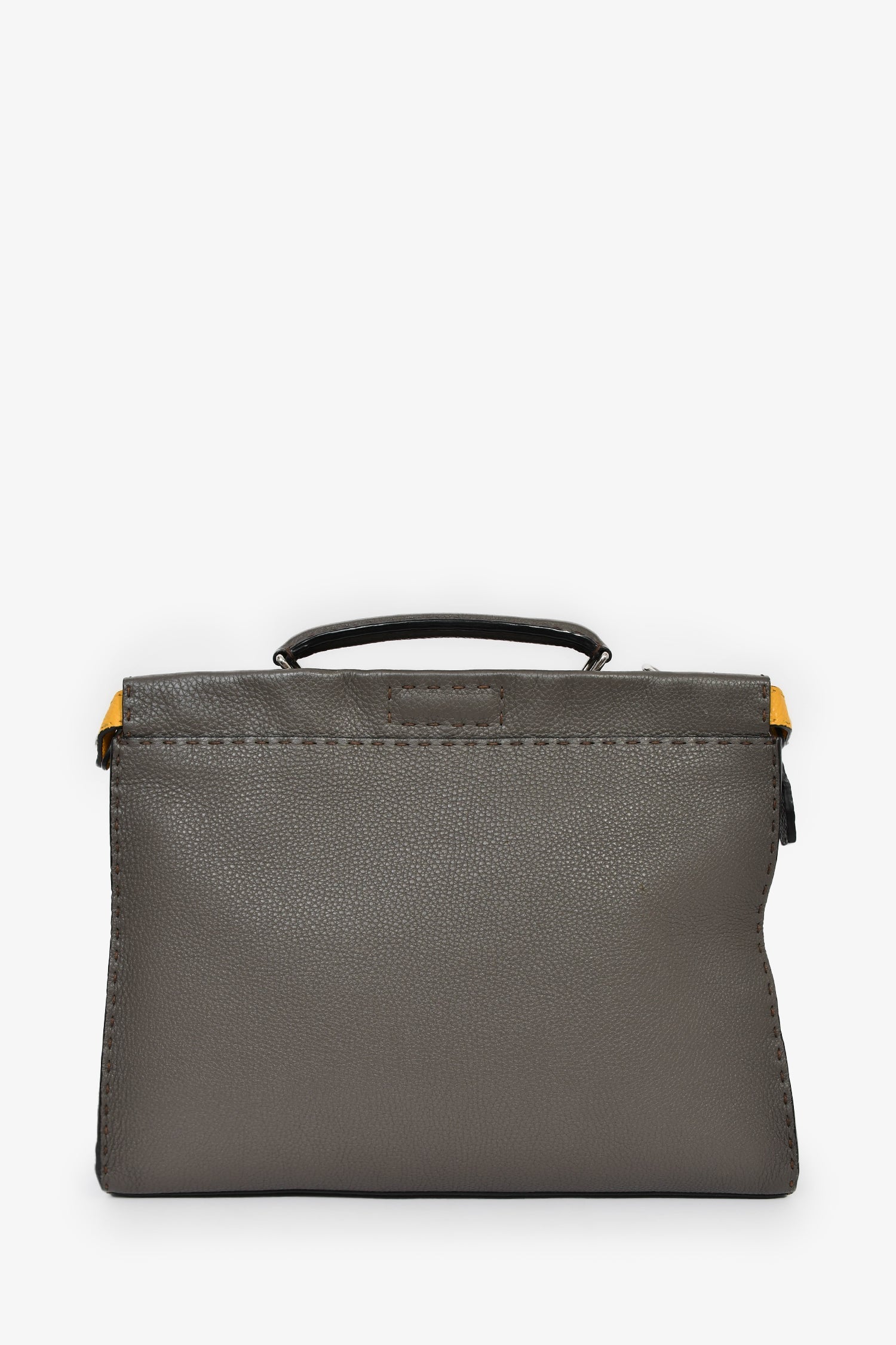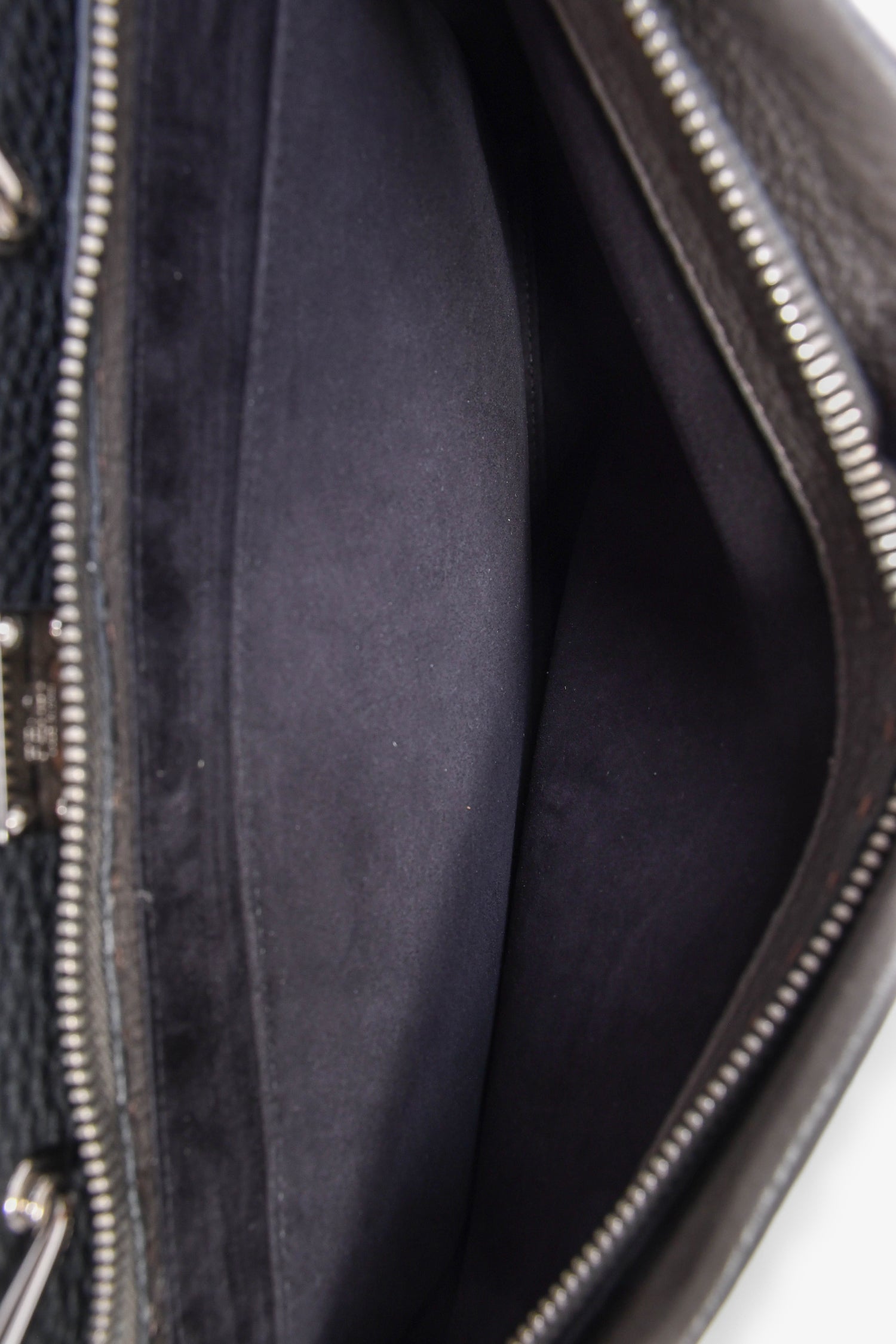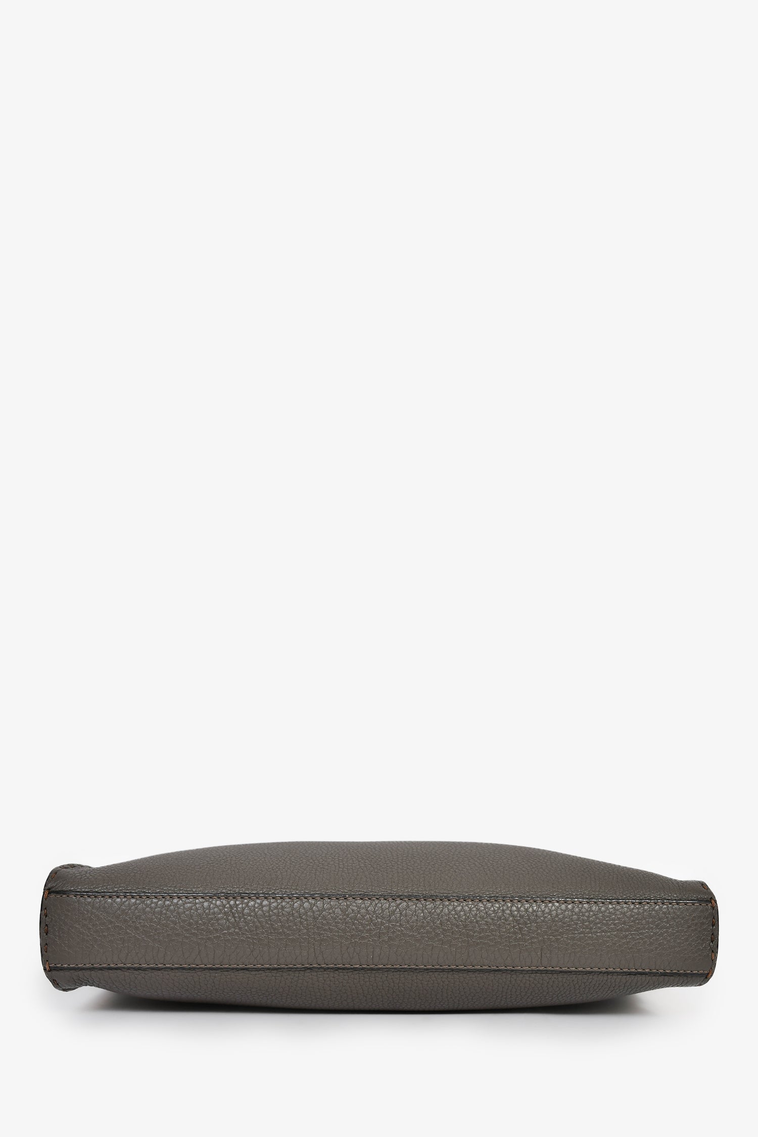 Fendi Taupe Leather Large Selleria Peekaboo Briefcase. Top handle. Top zip and latch closures. Detachable and adjustable strap. Suede-lined interior. 2 interior wall pockets; 1 slip, 1 with zip closure. Silver-tone hardware. Tonal stitching.