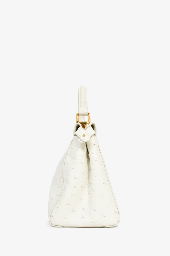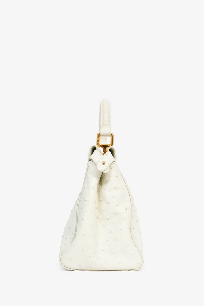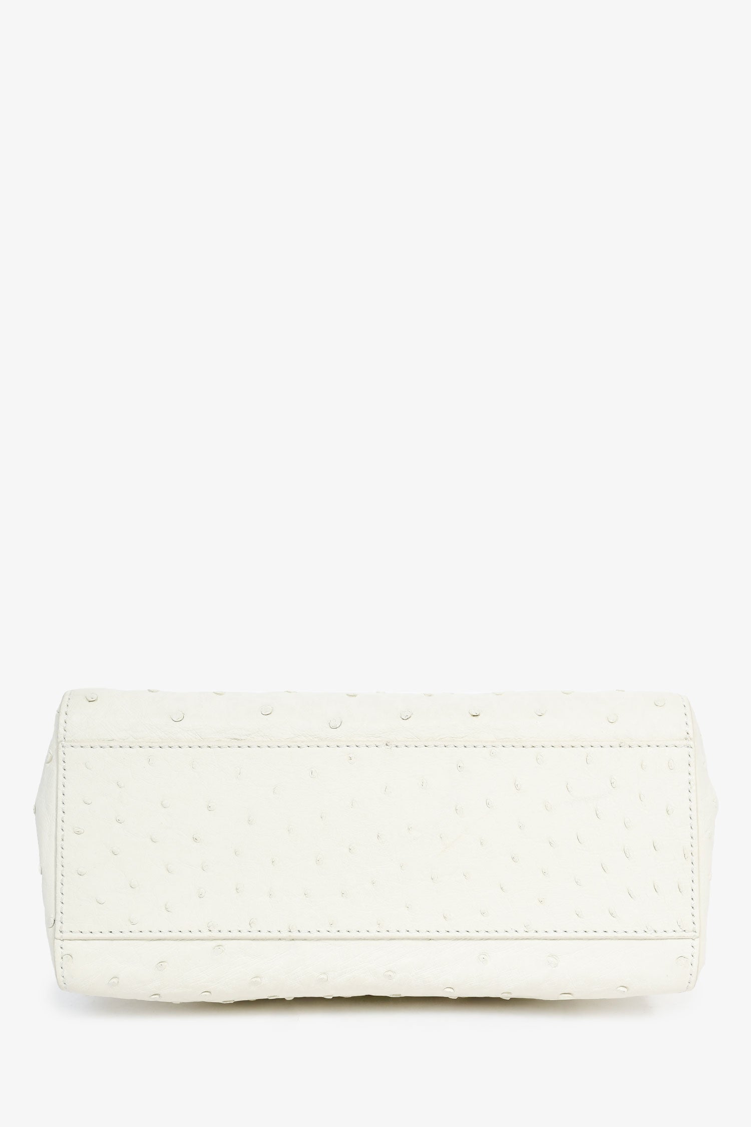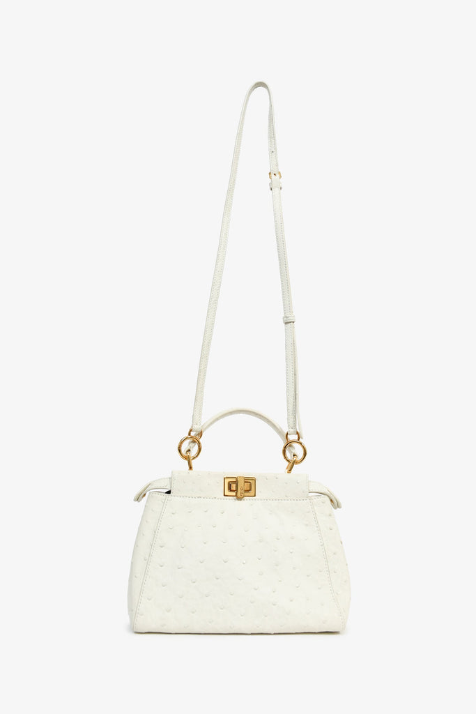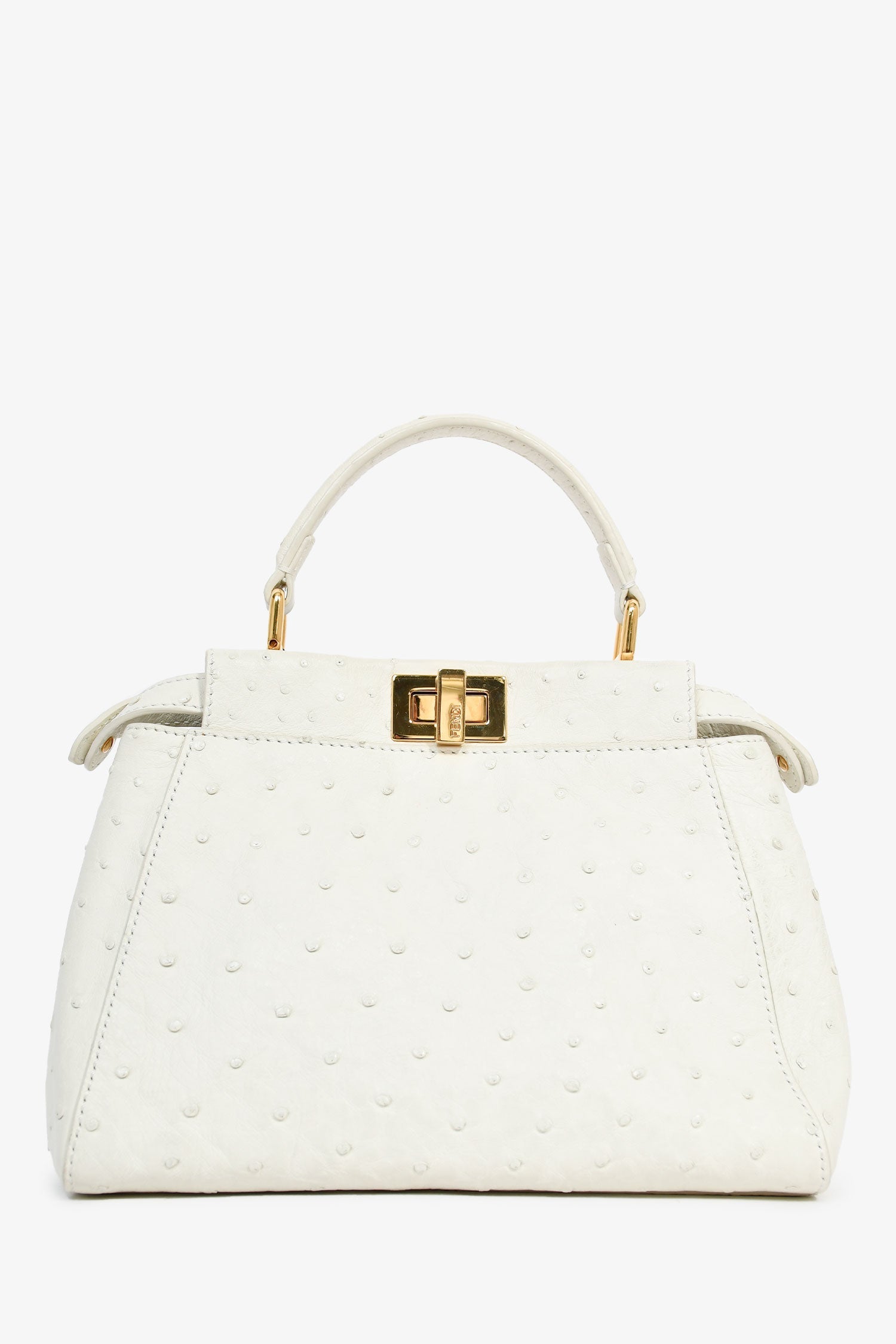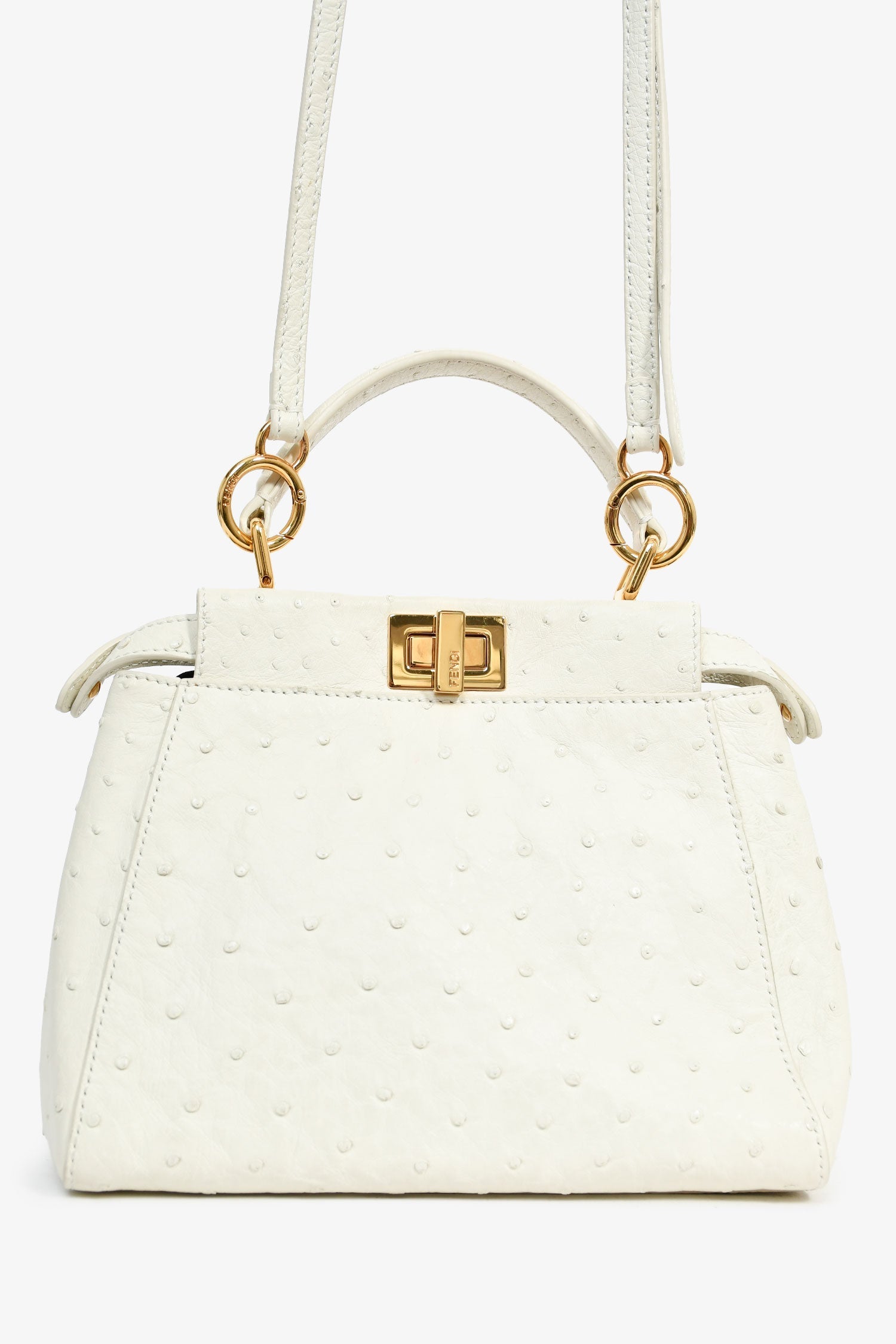 Fendi White Ostrich Leather Mini Peekaboo Bag. Top handle. Dual interior compartments with centre divider. Twist-lock closure. Removable and attachable strap. Gold-tone hardware. Tonal stitching.
