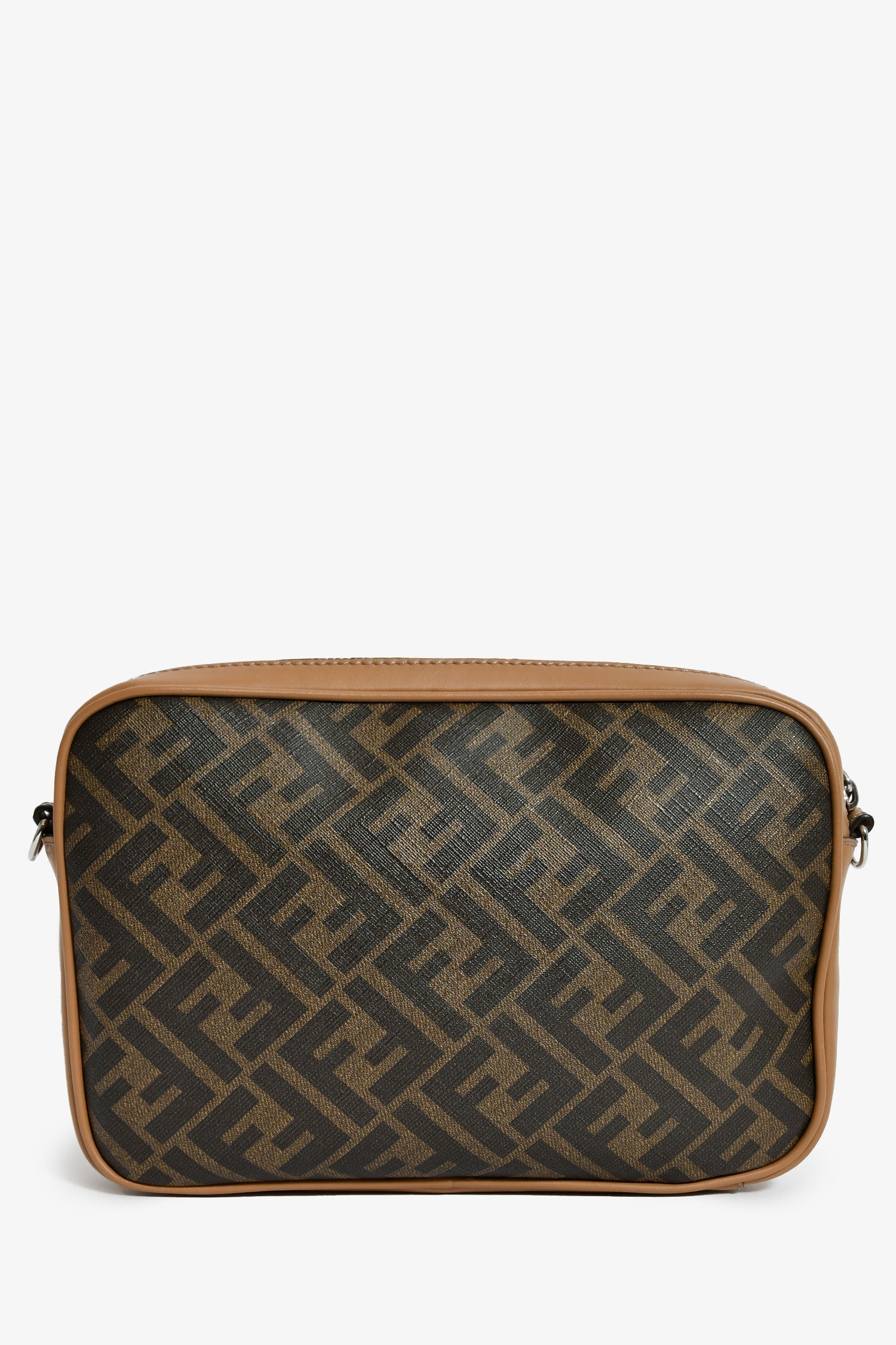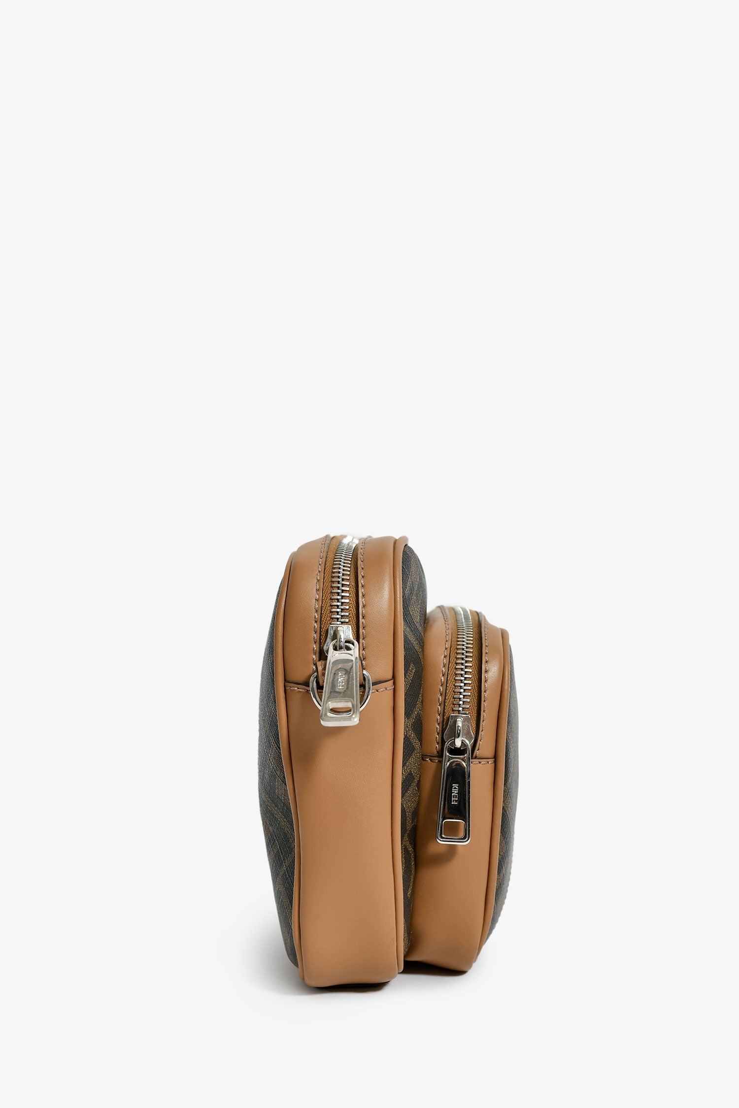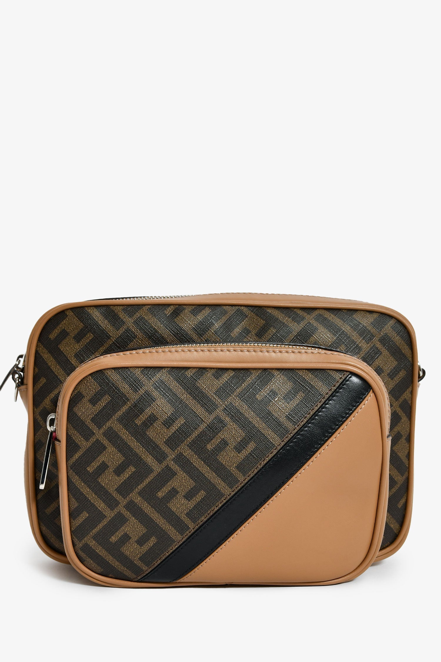 Fendi Zucca Canvas Diagonal Duo Camera Case. 2 top zip closures. 1 exterior pouch. Webbed and leather crossbody strap. Lined interior. Silver-tone hardware. Tonal stitching.