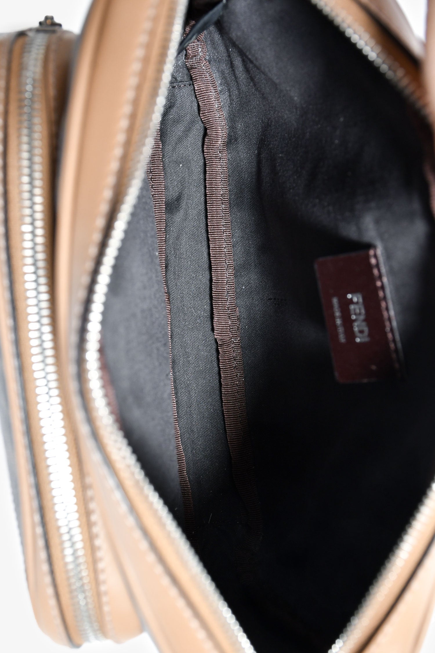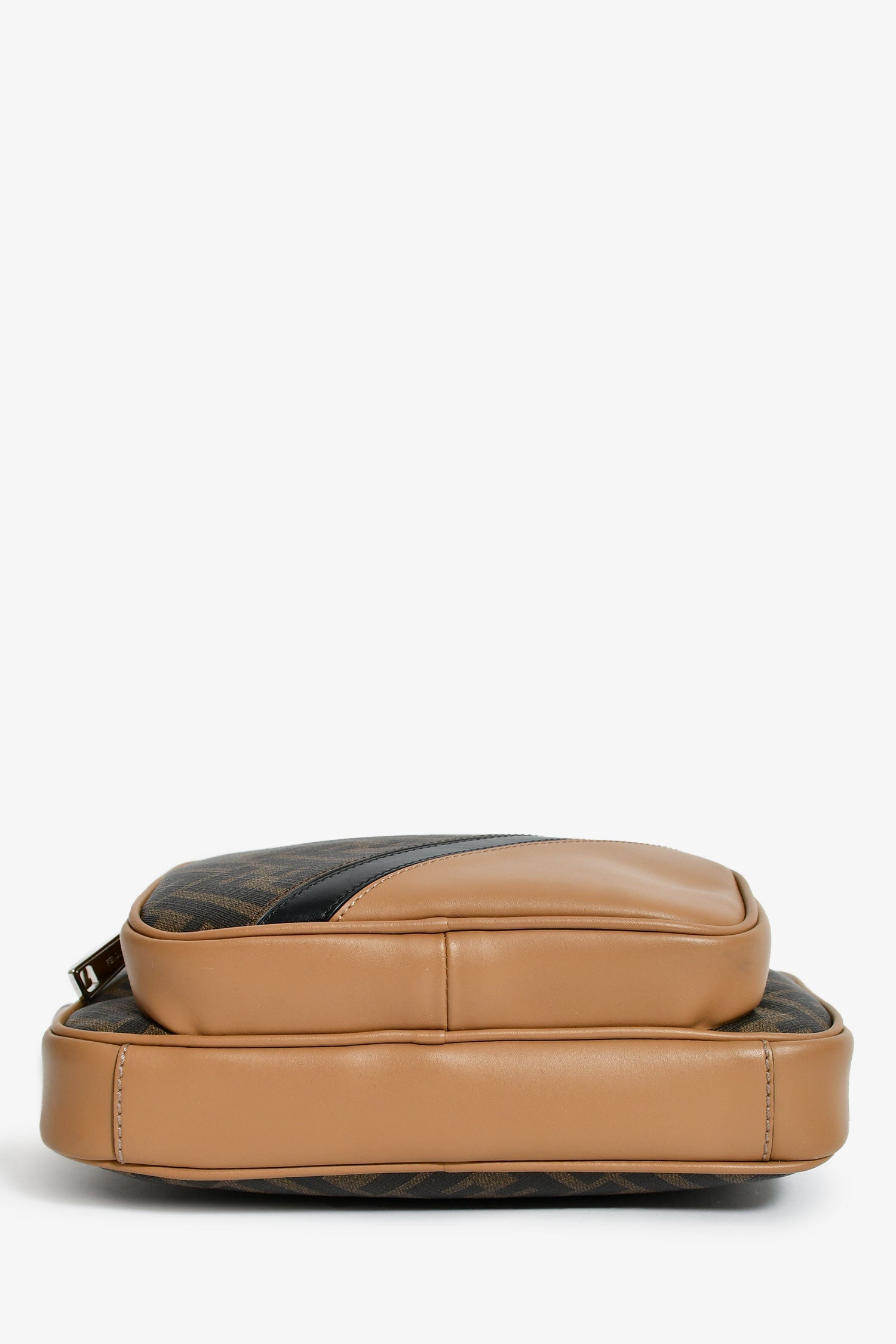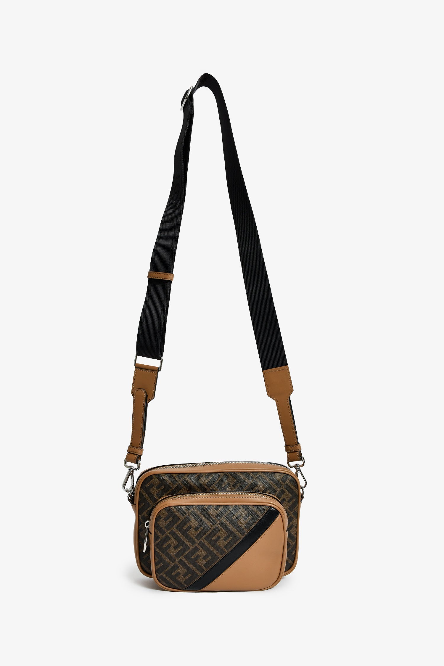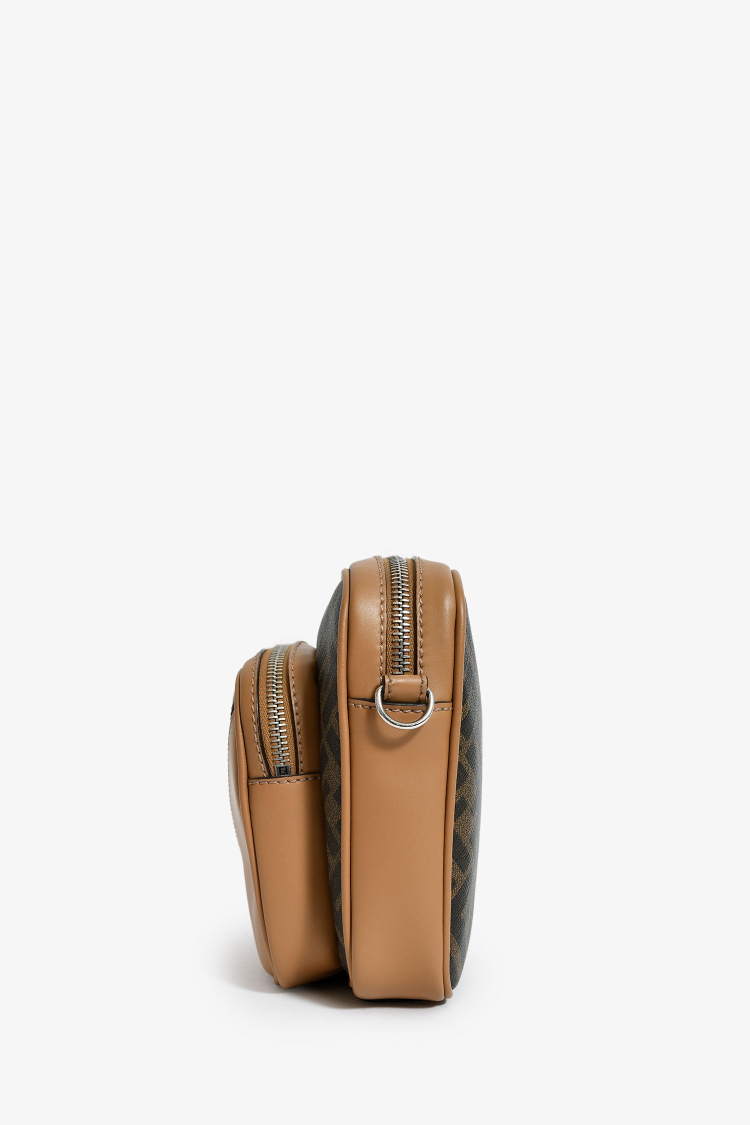 Fendi Zucca Canvas Diagonal Duo Camera Case. 2 top zip closures. 1 exterior pouch. Webbed and leather crossbody strap. Lined interior. Silver-tone hardware. Tonal stitching.