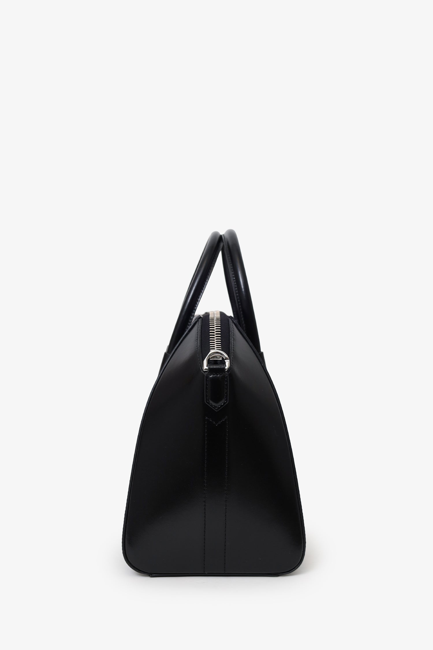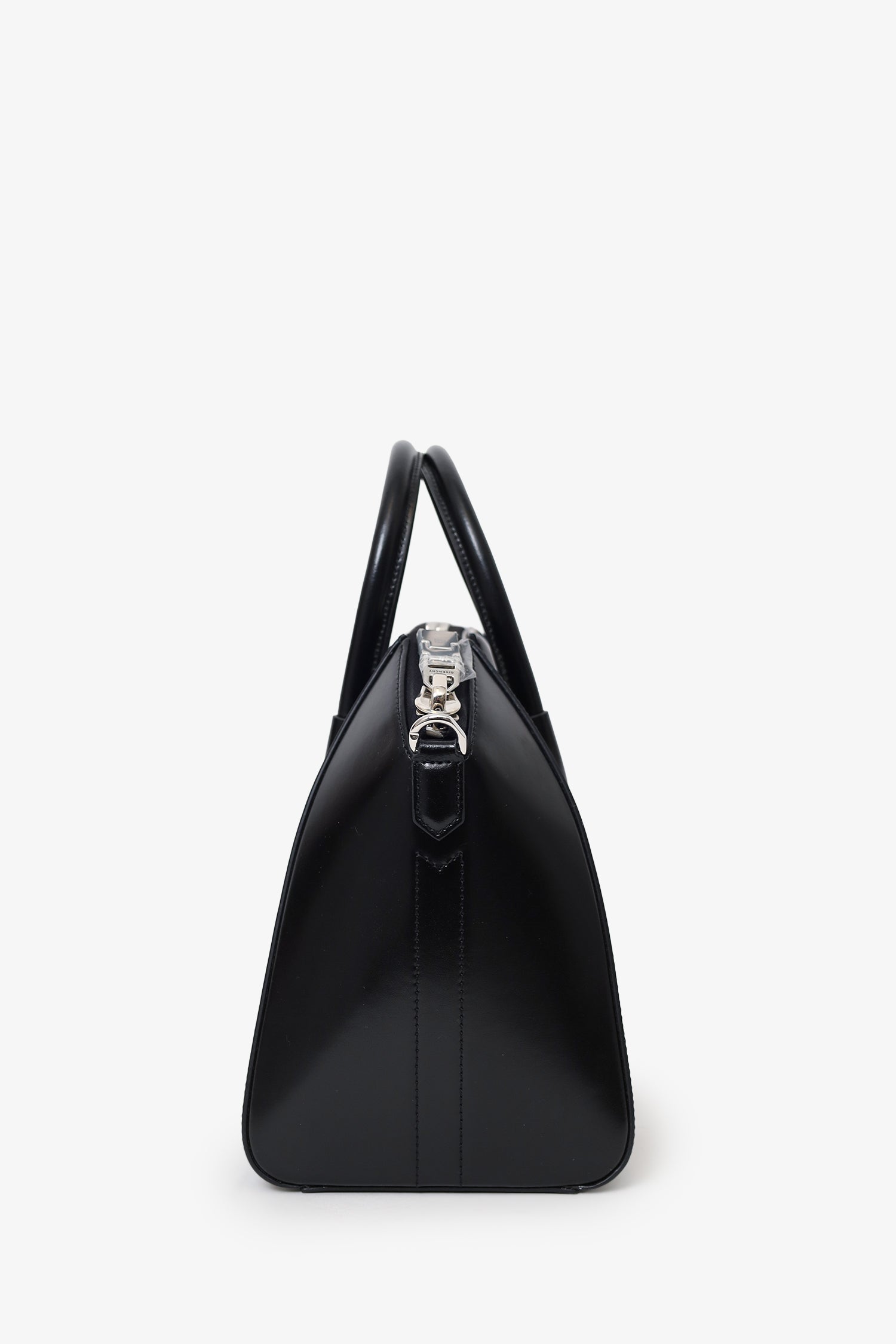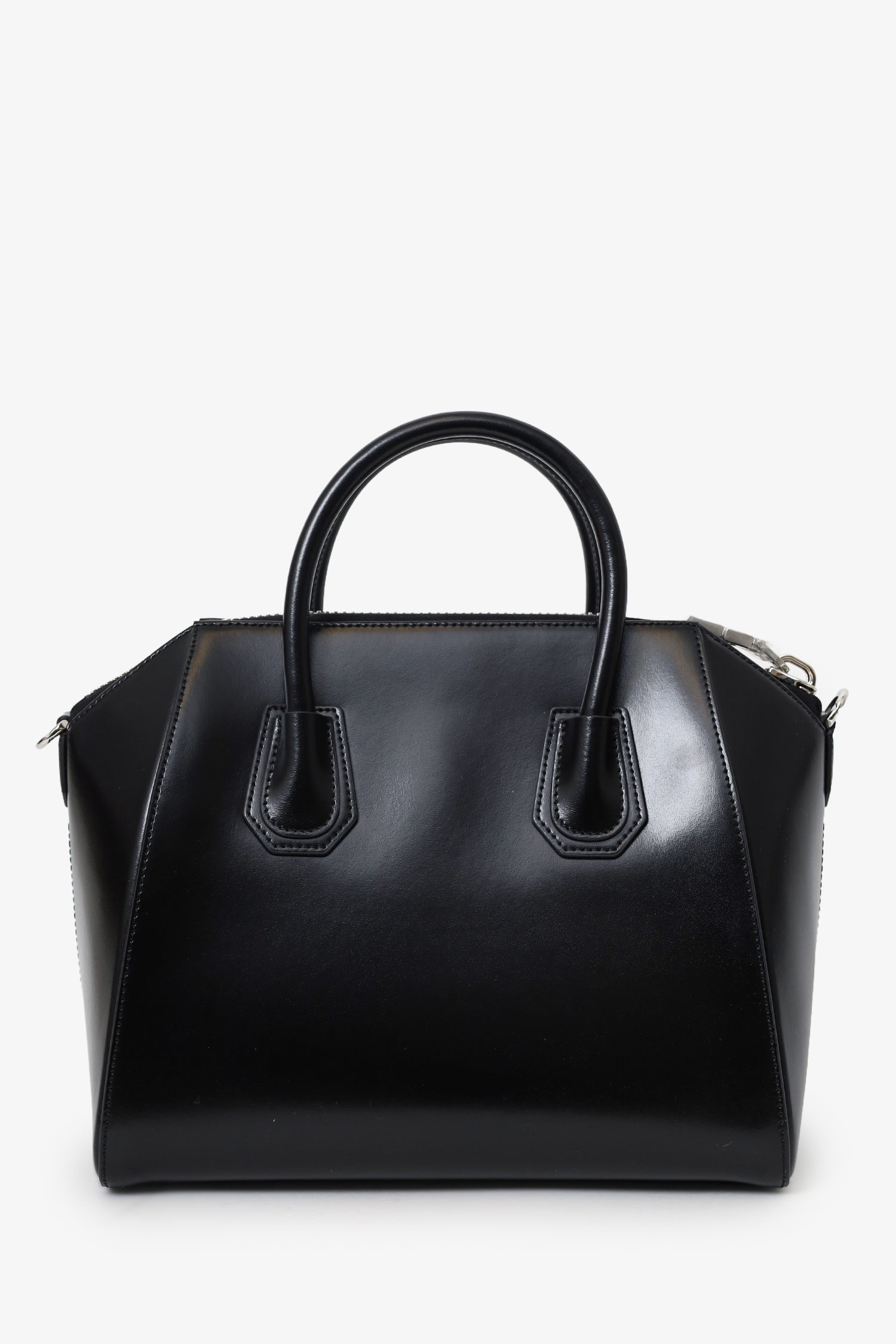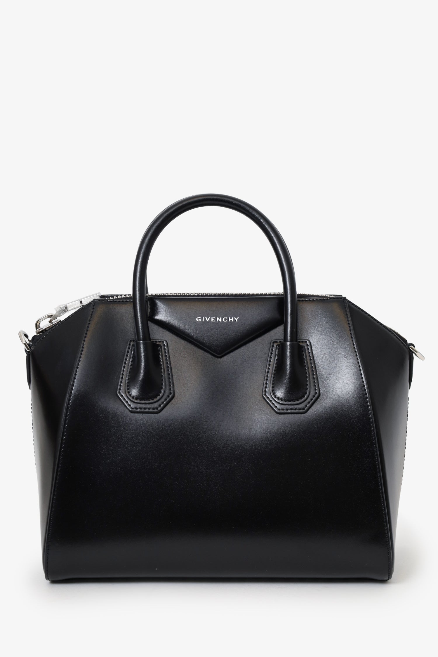 Givenchy Black Leather Small Antigona Top Handle With Strap. Top zip closure. Twin top handle. Removable shoulder strap. 2 interior pockets; 1 zip and 1 slip. Silver-tone hardware. Tonal stitching.
