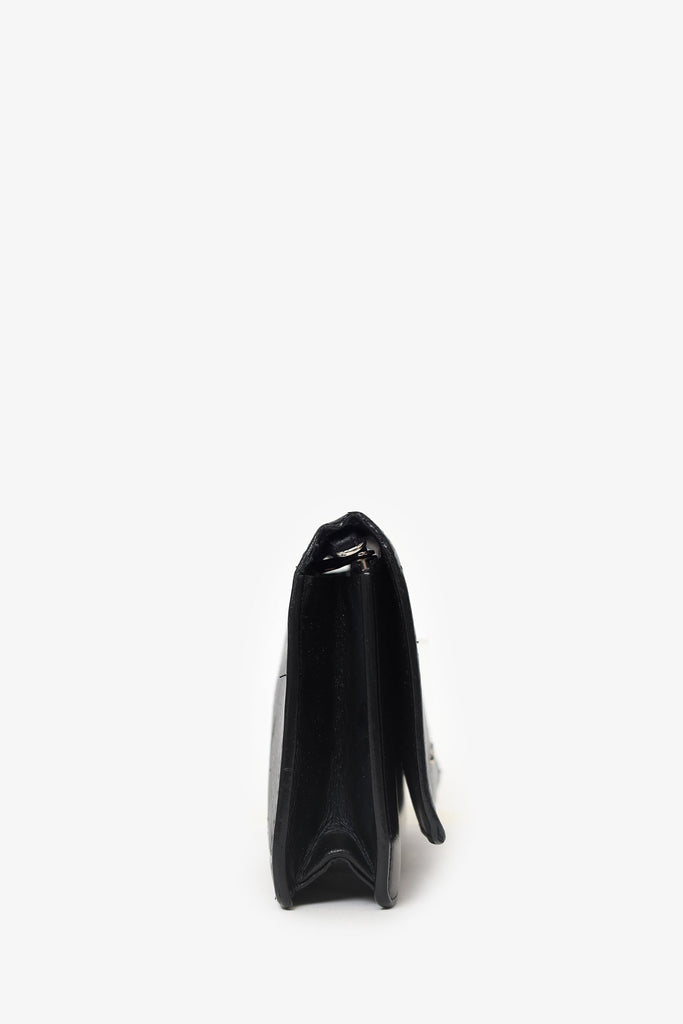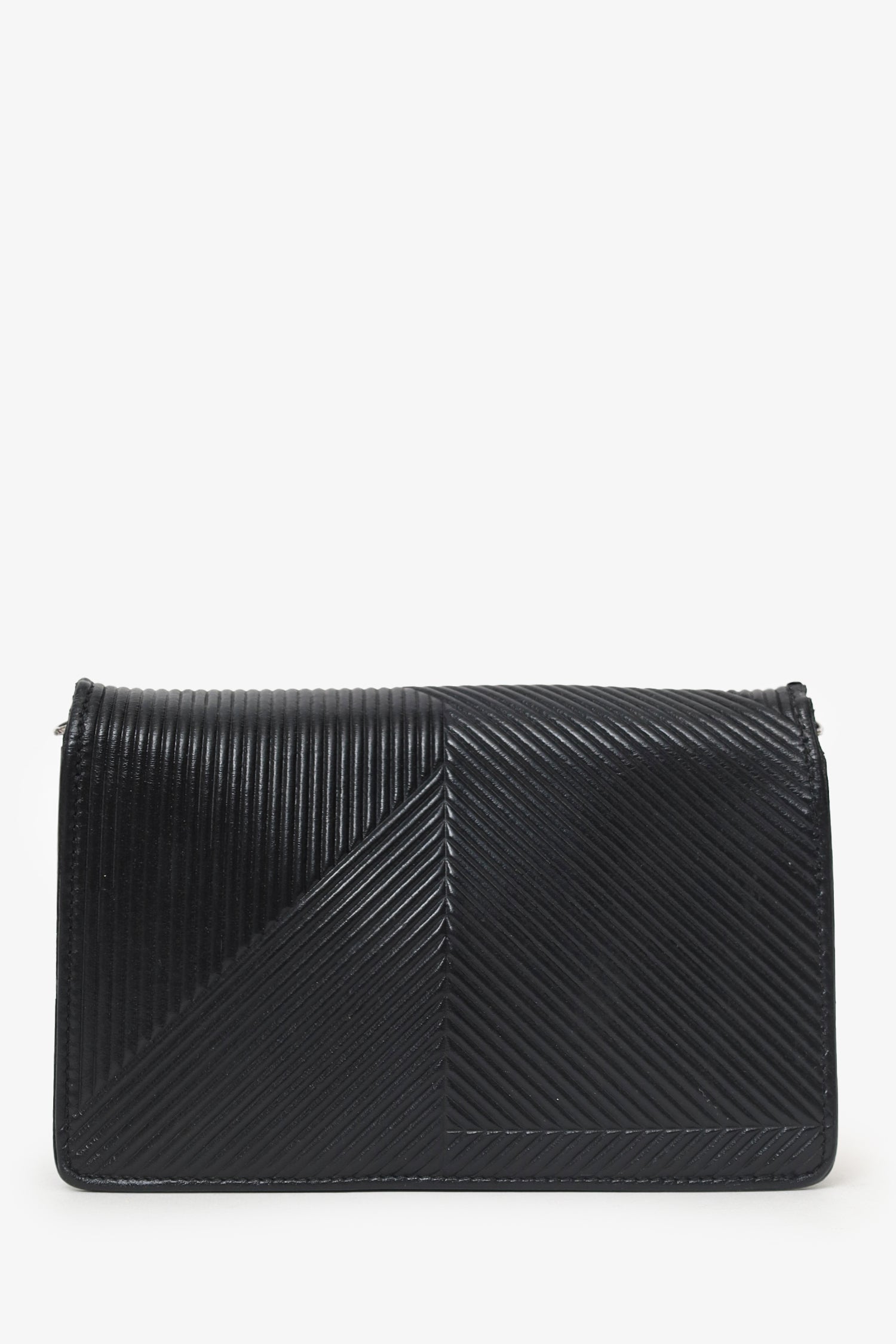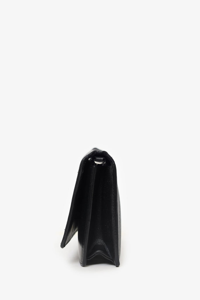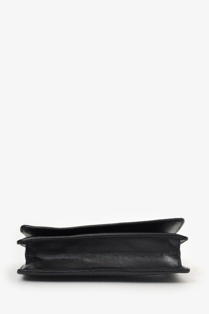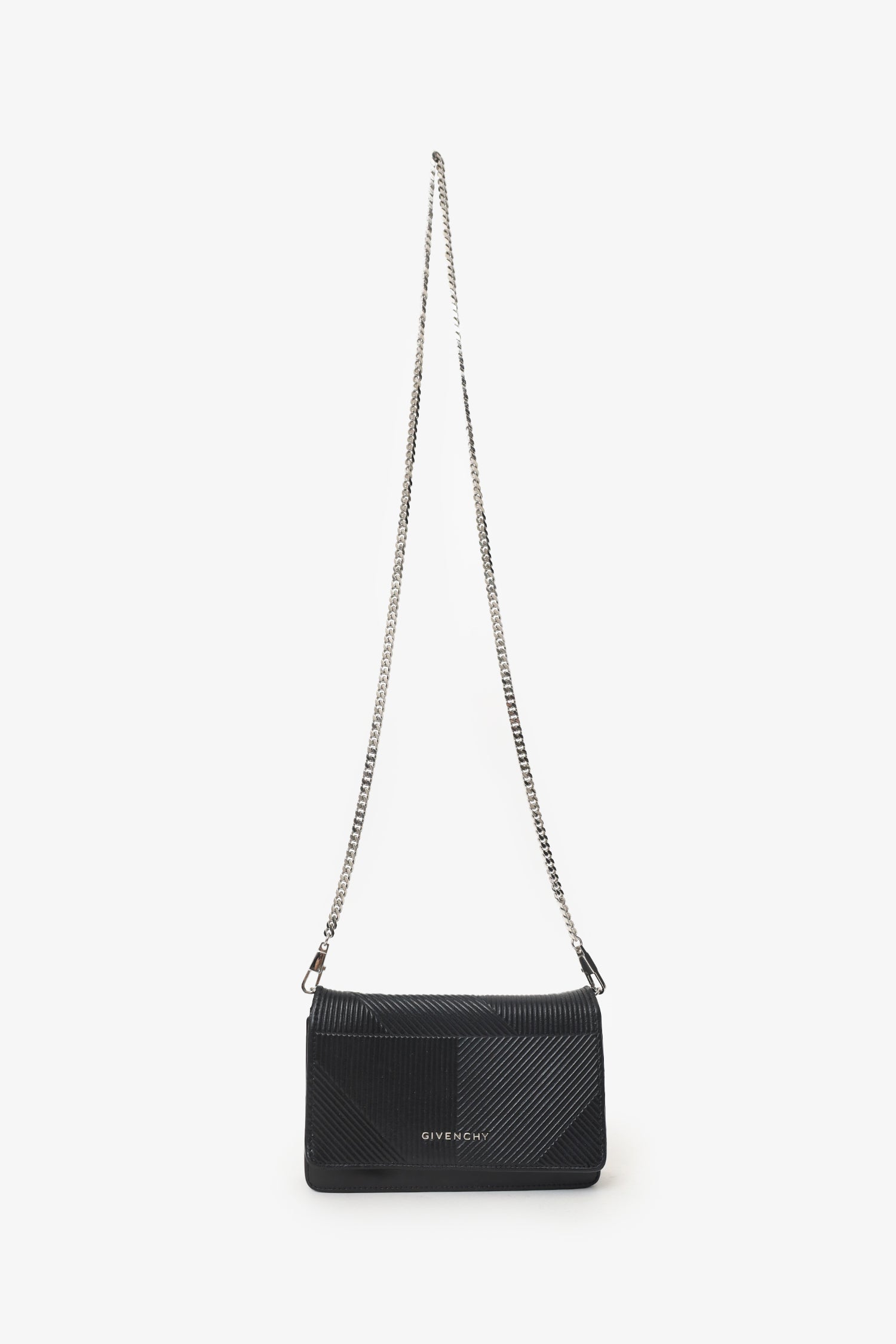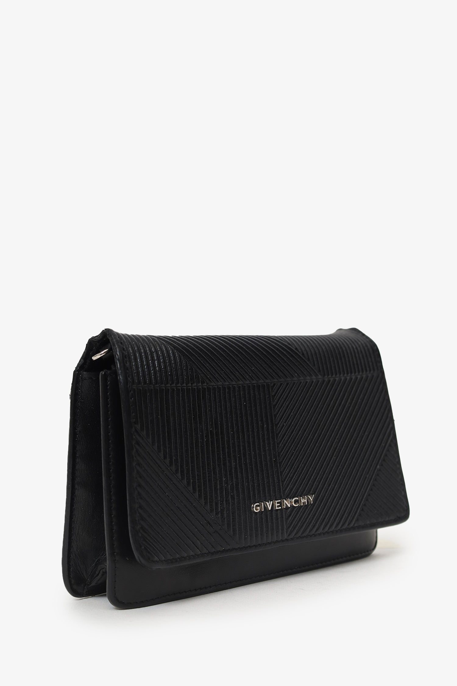 Givenchy Black Leather Wallet on Chain. Front fold-over flap with snap-button closure. Removable chainlink shoulder strap with clasp closure. Lined interior with 9 pockets; 6 card, 1 slip, 1 bill, and 1 zip. Silver-tone hardware. Tonal stitching.